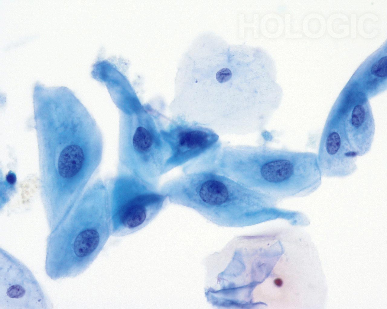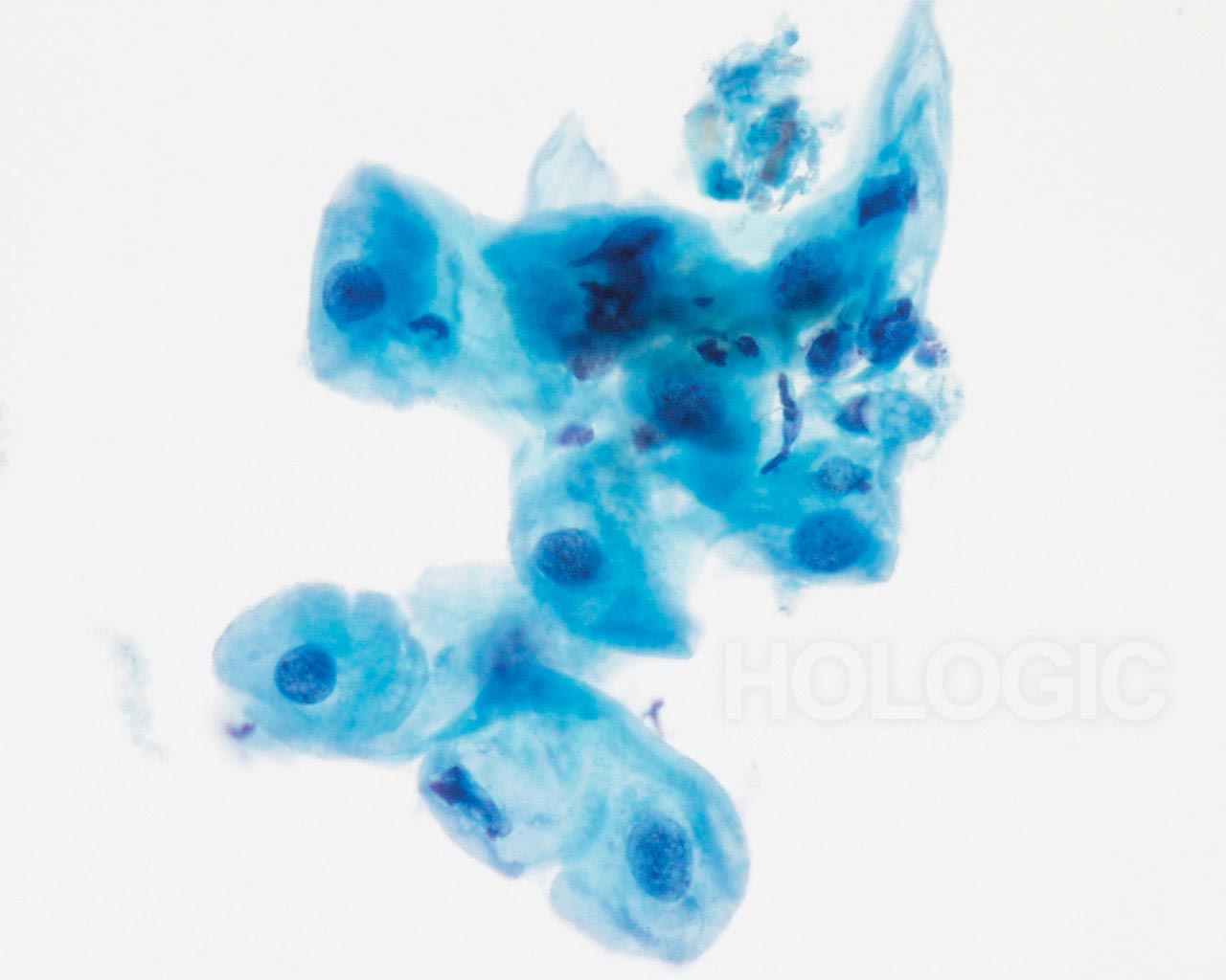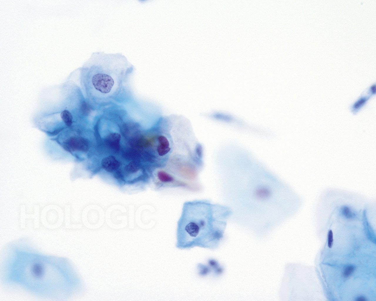 Der ThinPrep® PapTest minimiert die problemträchtigen Artefakte, welche dem Ausstrichpräparat und der Sprayfixierung inhärent sind. Dies erlaubt eine adäquate Betrachtung des Kerns, was die Findung einer definitiven Diagnose anhaften. Die Epithelzellen die in die ASC-Kategorie eingestuft werden, sind meistens reife Plattenepithelien und Metaplasien, die minimale Veränderungen aufweisen, welche für eine LSIL- oder HSIL-Diagnose nicht ausreichen. Die Kerne sind leicht vergrößert und diese Vergrößerung bezieht sich auf die normalen Vertreter des gleichen Zelltyps. Die Kerne können leichte Unregelmäßigkeiten der Kernmembran aufweisen, diese sind aber meist glatt. Wenn es sich um Metaplasiezellen handelt, muss man darauf achten, dass die Unregelmäßigkeiten nicht darauf zurückzuführen sind, dass eine Vakuole(n) den Kern in eine abweichende Form drückt. Das Chromatinmuster ist fein granulär und gleichmäßig verteilt. Chromozentren oder Nukleoli sind meist unverdächtig oder fehlen, außer/es sei denn eine reaktive Veränderung tritt zusammen mit der Atypie auf. Hier muss die Differentialdiagnose einer reaktiven Veränderung unter dem Aspekt des Vorkommens oder des Fehlens der anderen Kriterien neu geprüft werden.