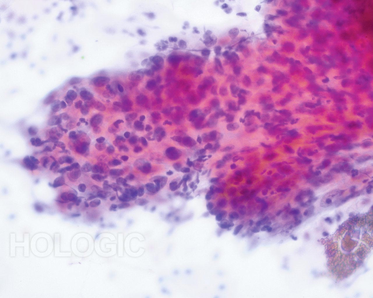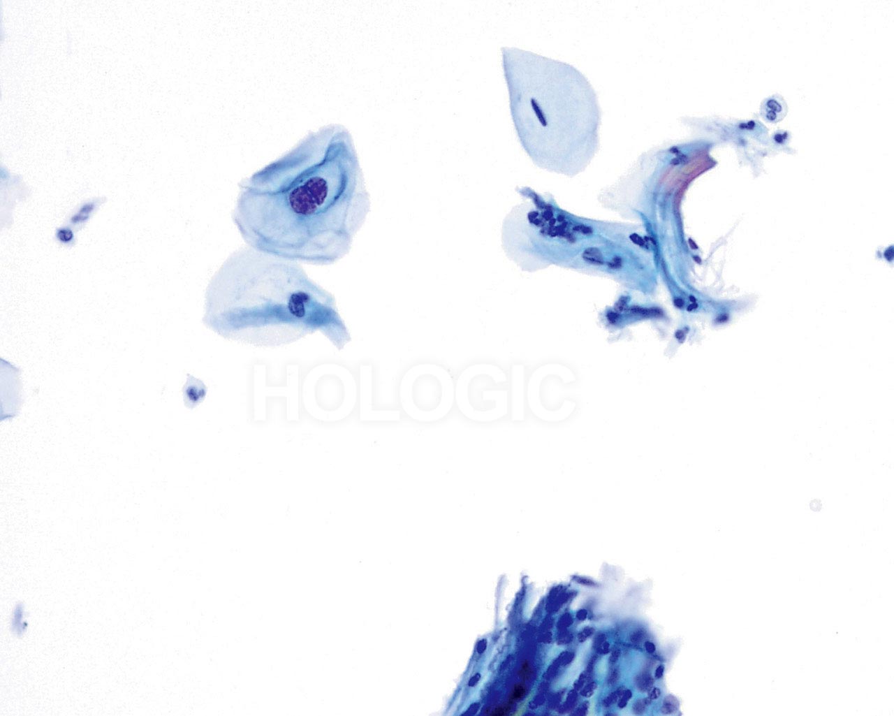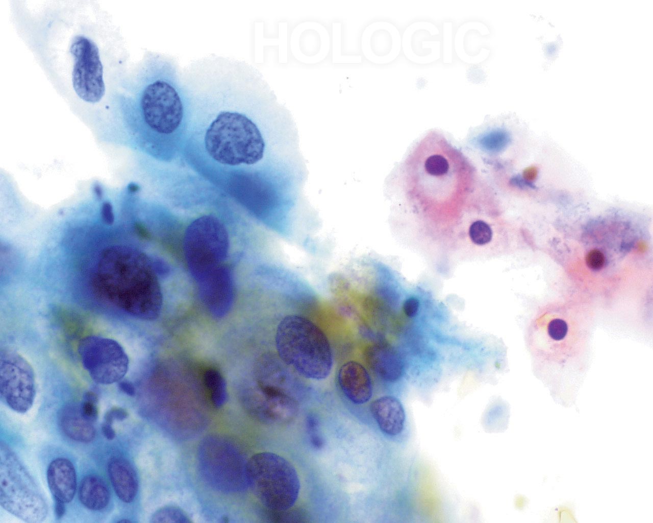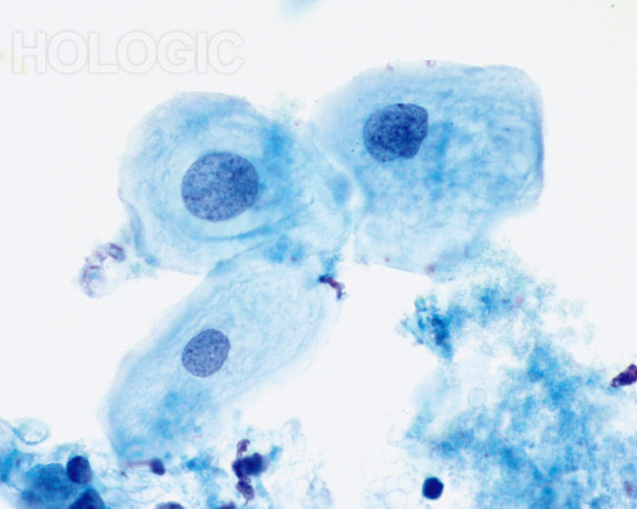 Der ThinPrep® PapTest minimiert die problemträchtigen Artefakte, welche dem Ausstrichpräparat und der Sprayfixierung inhärent sind. Dies erlaubt eine adäquate Betrachtung des Kerns, was die Findung einer definitiven Diagnose anhaften. Die Epithelzellen die in die ASC-Kategorie eingestuft werden, sind meistens reife Plattenepithelien und Metaplasien, die minimale Veränderungen aufweisen, welche für eine LSIL- oder HSIL-Diagnose nicht ausreichen. Die Kerne sind leicht vergrößert und diese Vergrößerung bezieht sich auf die normalen Vertreter des gleichen Zelltyps. Die Kerne können leichte Unregelmäßigkeiten der Kernmembran aufweisen, diese sind aber meist glatt. Wenn es sich um Metaplasiezellen handelt, muss man darauf achten, dass die Unregelmäßigkeiten nicht darauf zurückzuführen sind, dass eine Vakuole(n) den Kern in eine abweichende Form drückt. Das Chromatinmuster ist fein granulär und gleichmäßig verteilt. Chromozentren oder Nukleoli sind meist unverdächtig oder fehlen, außer/es sei denn eine reaktive Veränderung tritt zusammen mit der Atypie auf. Hier muss die Differentialdiagnose einer reaktiven Veränderung unter dem Aspekt des Vorkommens oder des Fehlens der anderen Kriterien neu geprüft werden.
