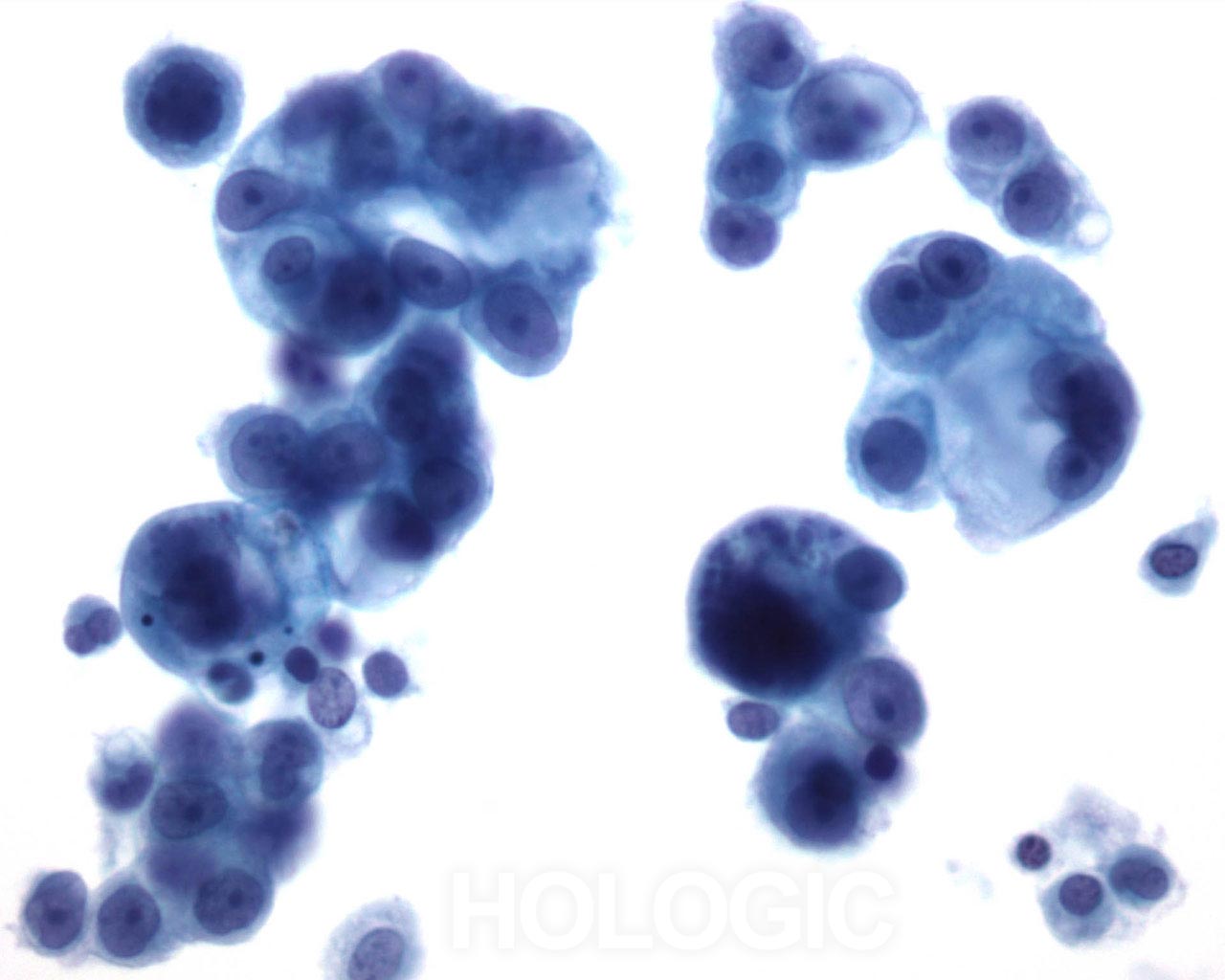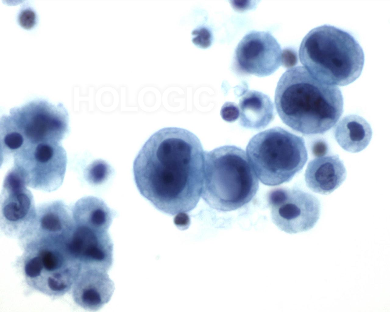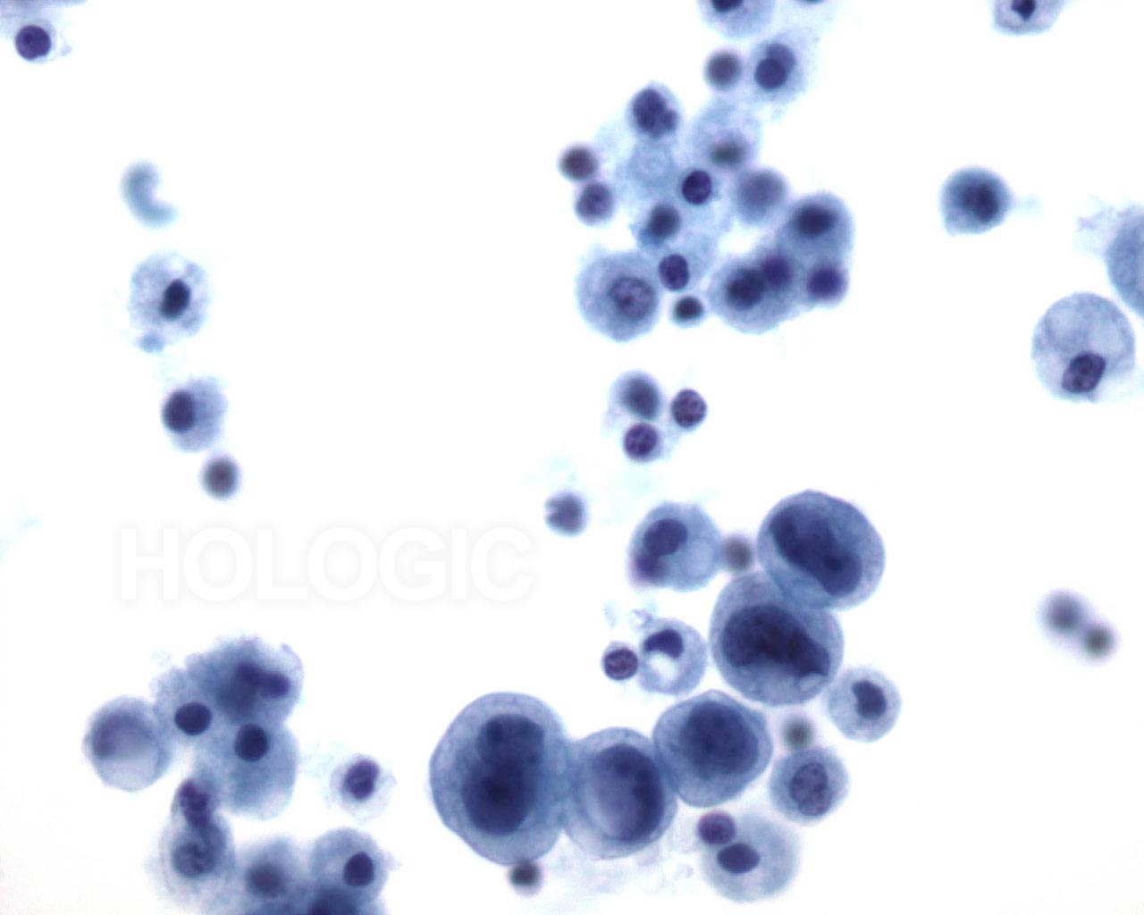 Zellen des serös-papillären Adenokarzinoms des Ovars in einem Pleuraerguss können als diskontinuierliche Zellpopulation vorliegen. Die Zell- und Zellkerngrößen sind unterschiedlich. Merkmale sind eine erhöhte Kern-Plasma-Relation und zytoplasmische Vakuolen. Die Zellen können einzeln oder in kleinen azinösen Gruppen auftreten.
