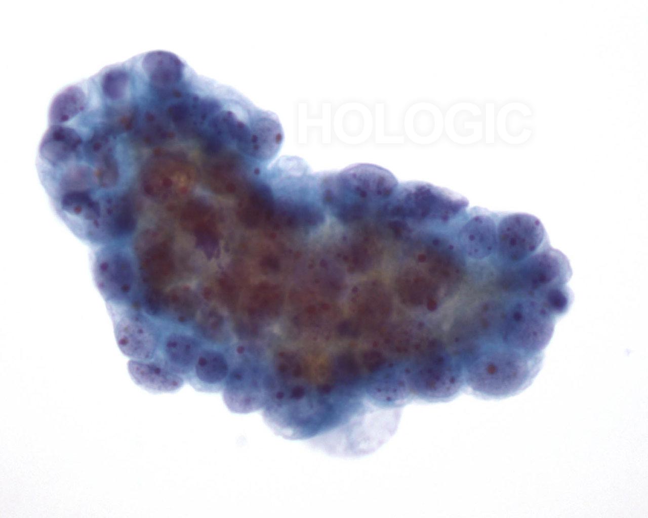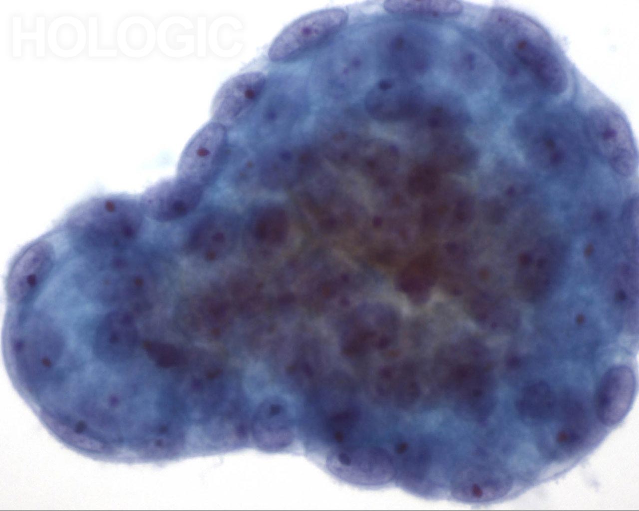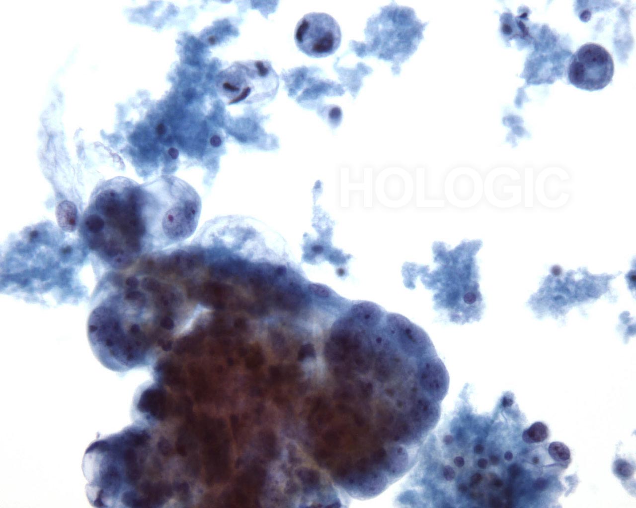 Zellen des serös-papillären Adenokarzinoms des Ovars in einem Pleuraerguss können als diskontinuierliche Zellpopulation vorliegen. Die Zell- und Zellkerngrößen sind unterschiedlich. Merkmale sind eine erhöhte Kern-Plasma-Relation und zytoplasmische Vakuolen. Die Zellen können einzeln oder in kleinen azinösen Gruppen auftreten.
