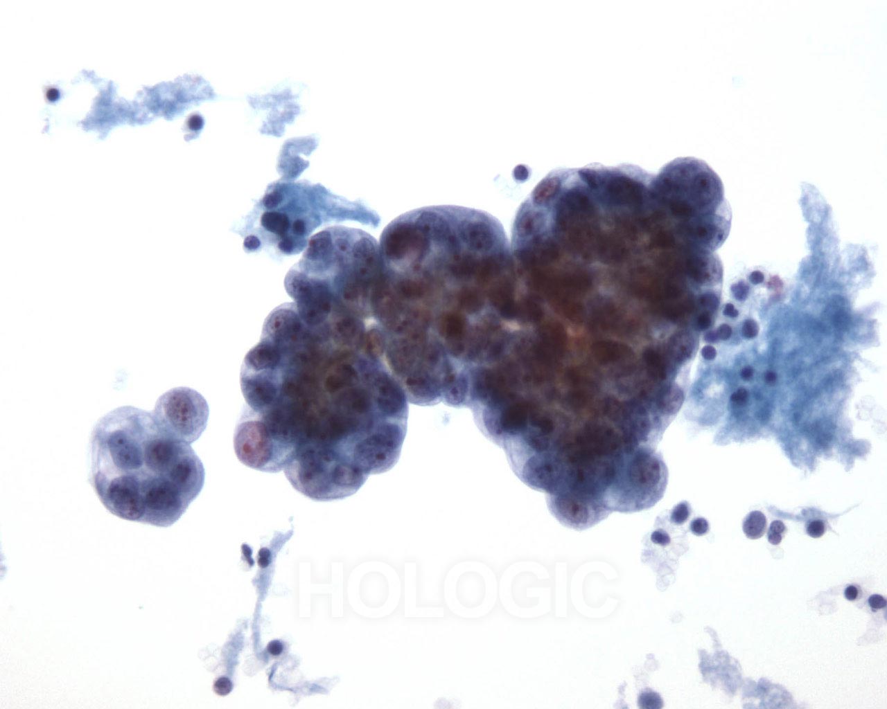 Seröses Adenokarzinom des Ovars. Trotz des dreidimensionalen Erscheinungsbilds lässt sich die Malignität dieser Eierstockkrebszellen leicht erkennen, wenn ihre Größe mit der der Lymphozyten im Hintergrund verglichen wird. Die Unterscheidung zwischen Ovar oder Endometrium als Ursprungsort kann sich in Anbetracht des häufigen Müllerschen Ursprungs von Tumoren in beiden Bereichen als schwierig erweisen.