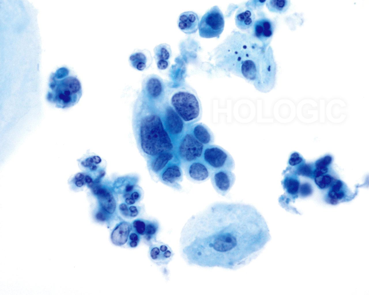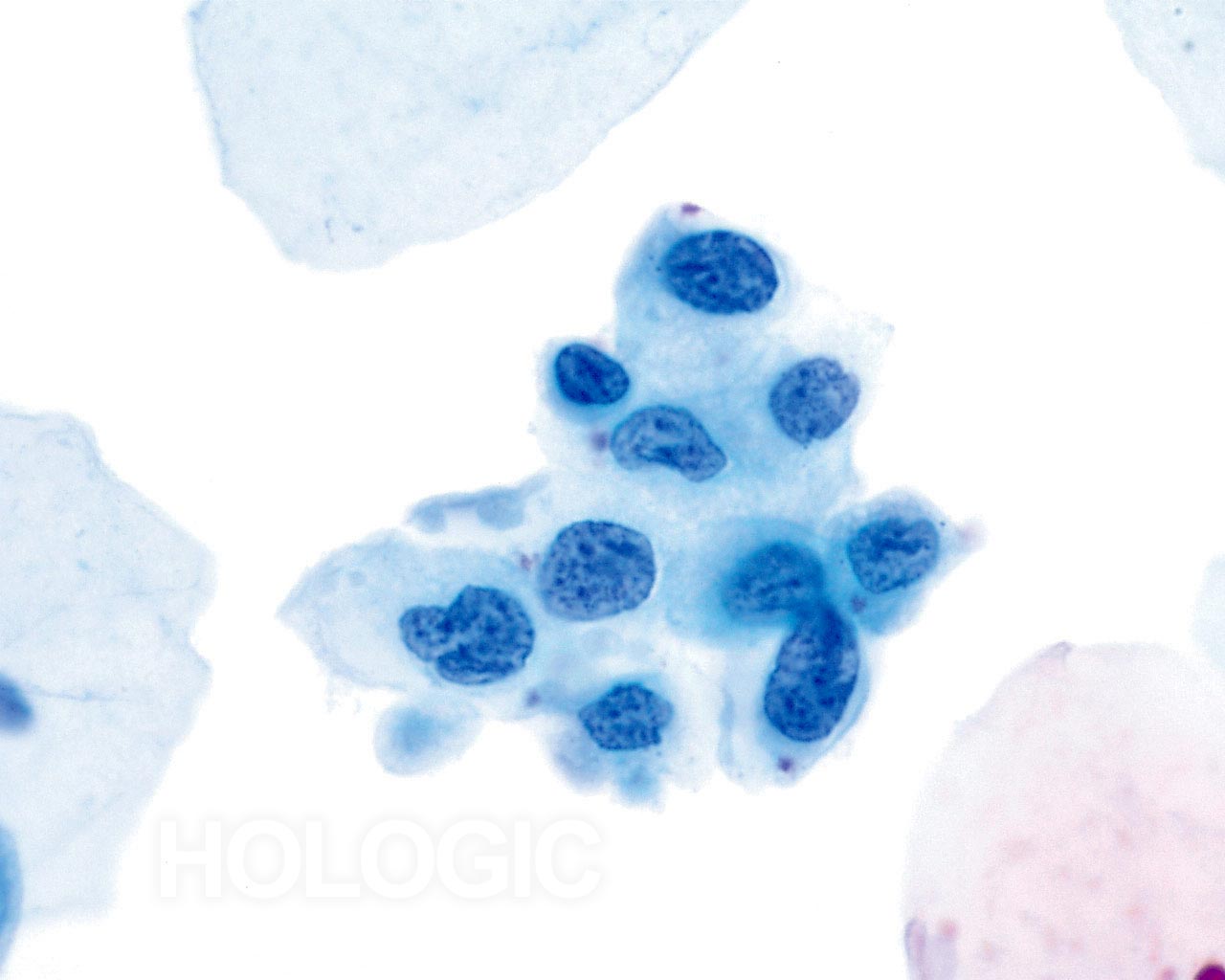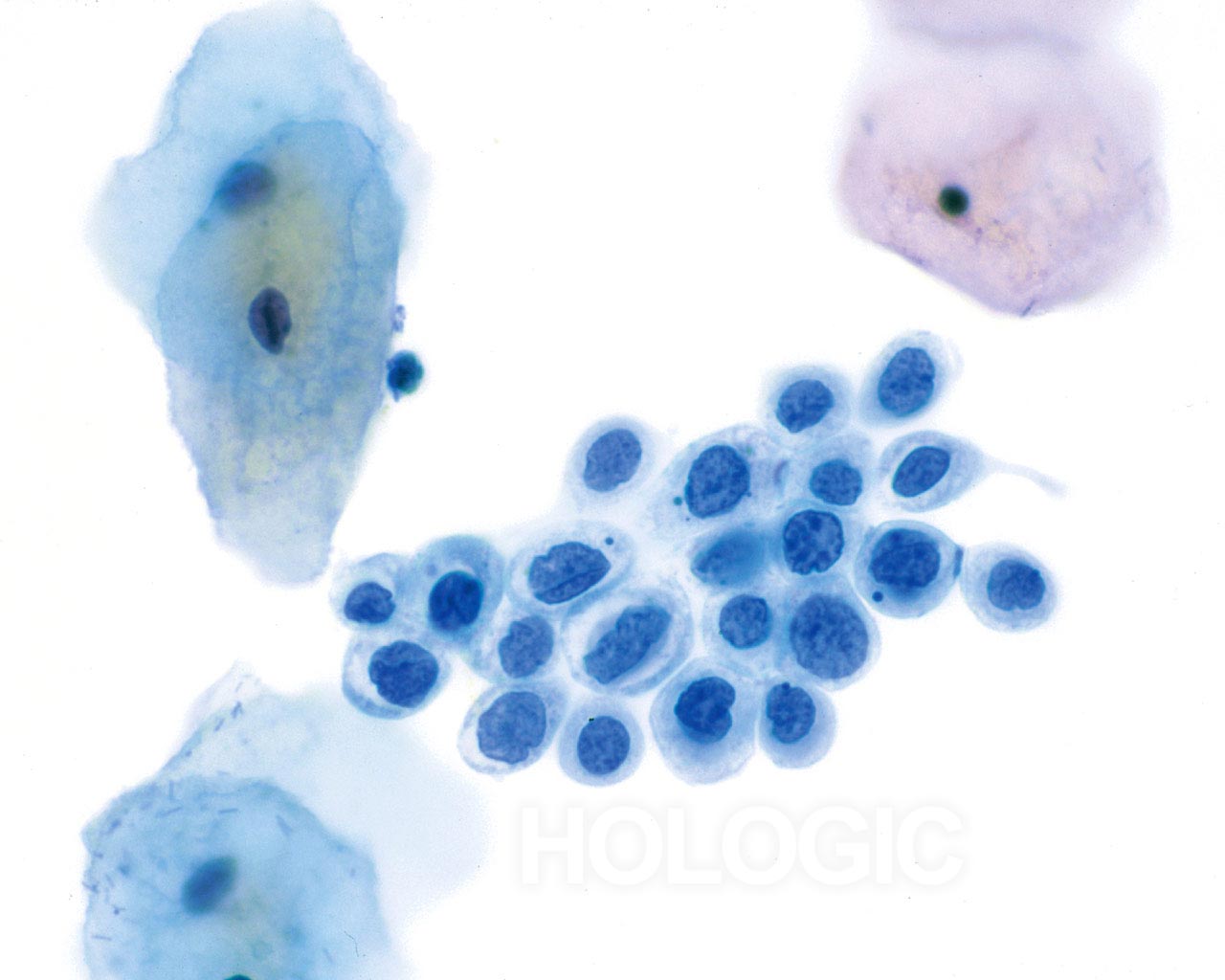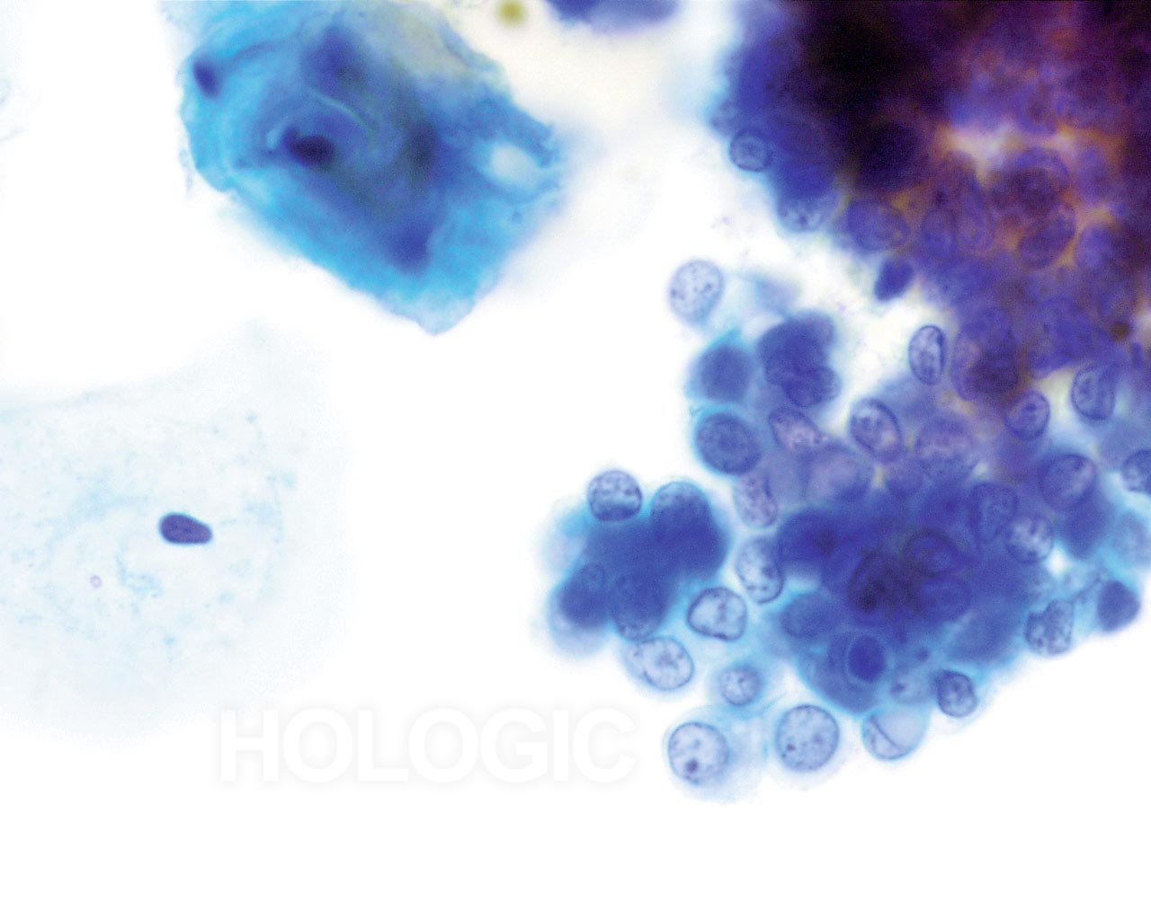Il n’est pas rare de détecter sur un frottis conventionnel les petites cellules anormales associées à une lésion HSIL piégées dans du mucus ou “cachées” parmi les groupes de cellules présents dans le matériel de fond. La ThinPrep est changée car le mucus et les débris sont dispersés. Au grossissement utilisé pour le dépistage, les petites cellules de HSIL “ressortent” sous forme isolée ou en Petits groupes sur le fond de la préparation cellulaire. Ces cellules constituent une indication que le matériel présent doit être examiné plus attentivement et que des groupes diagnostiques supplémentaires de cellules épithéliales de haut grade doivent être recherchés. Il peut alors s’avérer utile de voir une partie de la lame à fort grossissement. Il est important de noter que l’étape de dispersion du système ThinPrep ne brise pas les véritables groupes épithéliaux, mais en raison du manque de cohésion des lésions de haut grade, davantage de cellules isolées sont présentes ; il s’agit des cellules “indices” à rechercher.