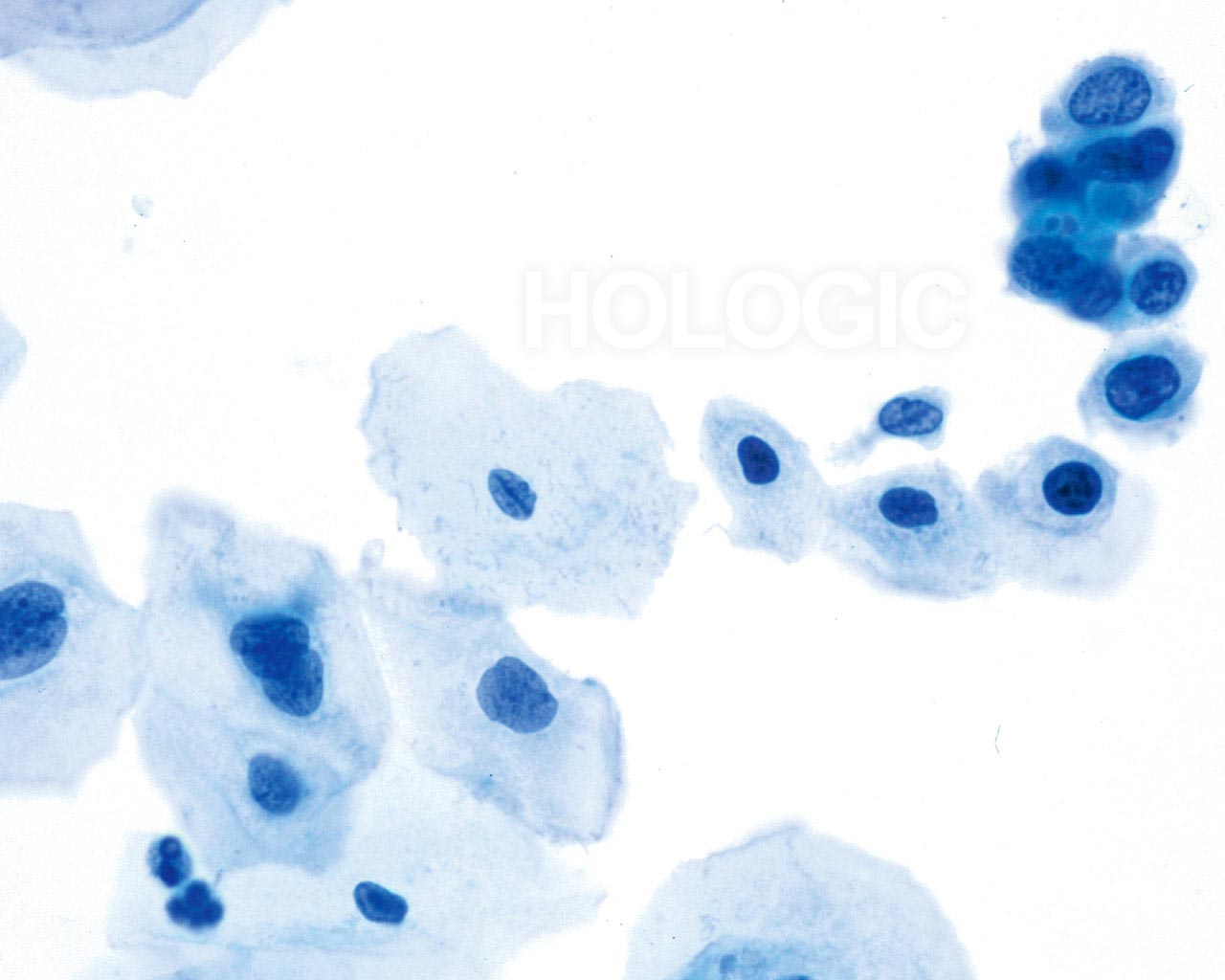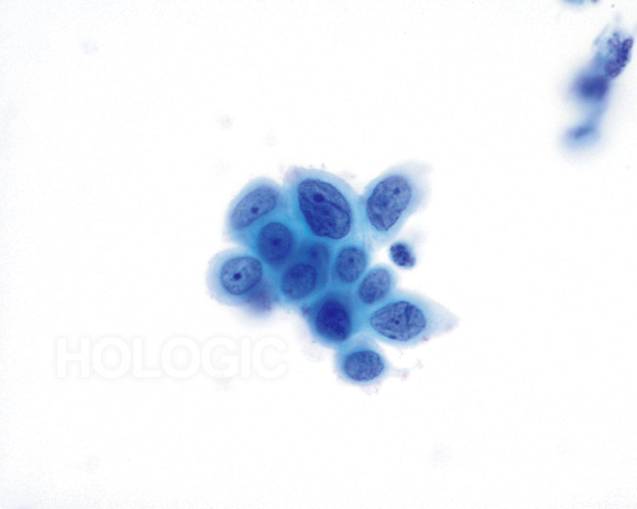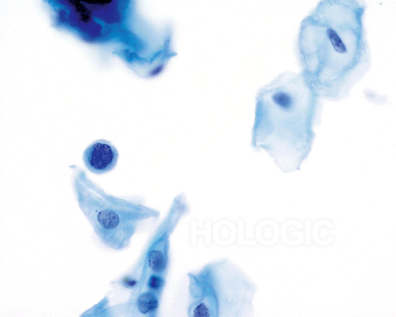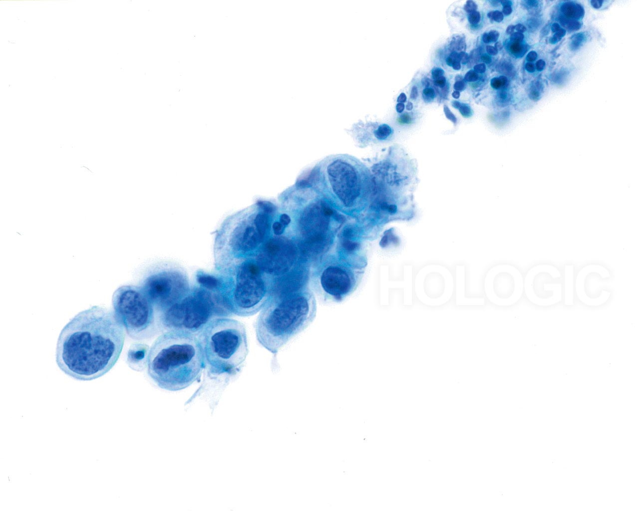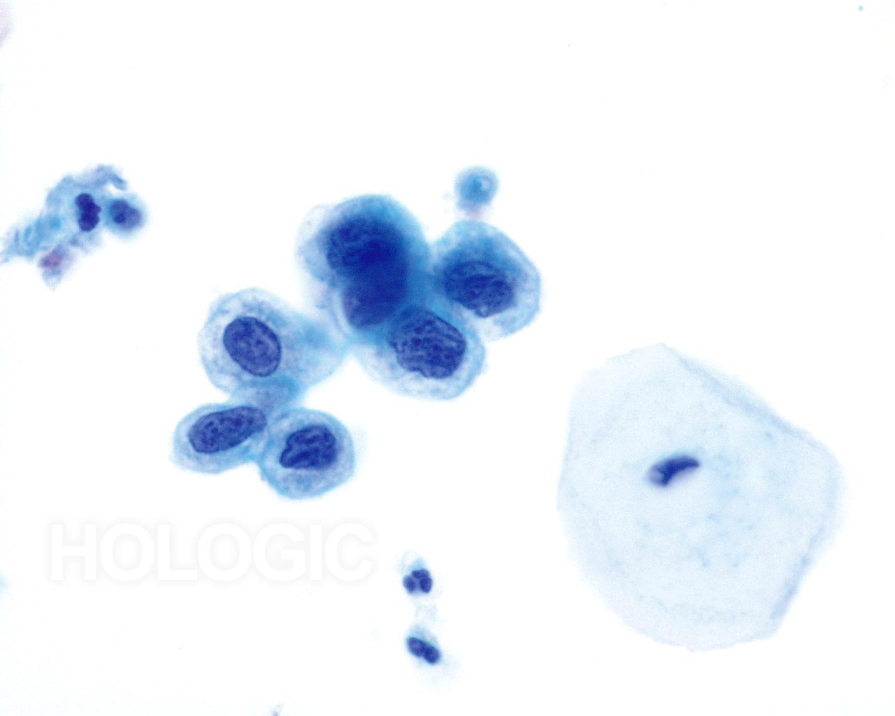 Il n’est pas rare de détecter sur un frottis conventionnel les petites cellules anormales associées à une lésion HSIL piégées dans du mucus ou “cachées” parmi les groupes de cellules présents dans le matériel de fond. La ThinPrep est changée car le mucus et les débris sont dispersés. Au grossissement utilisé pour le dépistage, les petites cellules de HSIL “ressortent” sous forme isolée ou en Petits groupes sur le fond de la préparation cellulaire. Ces cellules constituent une indication que le matériel présent doit être examiné plus attentivement et que des groupes diagnostiques supplémentaires de cellules épithéliales de haut grade doivent être recherchés. Il peut alors s’avérer utile de voir une partie de la lame à fort grossissement. Il est important de noter que l’étape de dispersion du système ThinPrep ne brise pas les véritables groupes épithéliaux, mais en raison du manque de cohésion des lésions de haut grade, davantage de cellules isolées sont présentes ; il s’agit des cellules “indices” à rechercher.