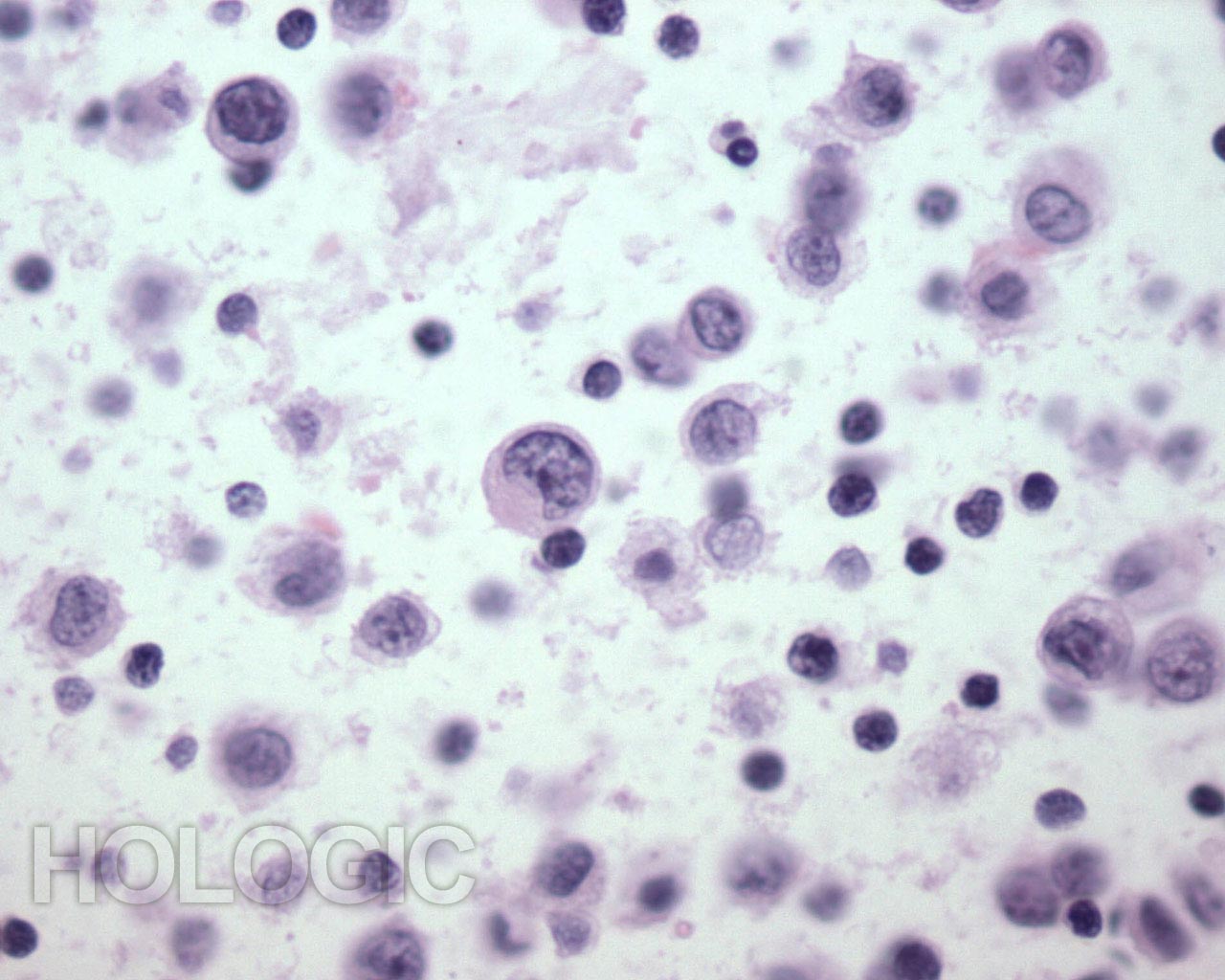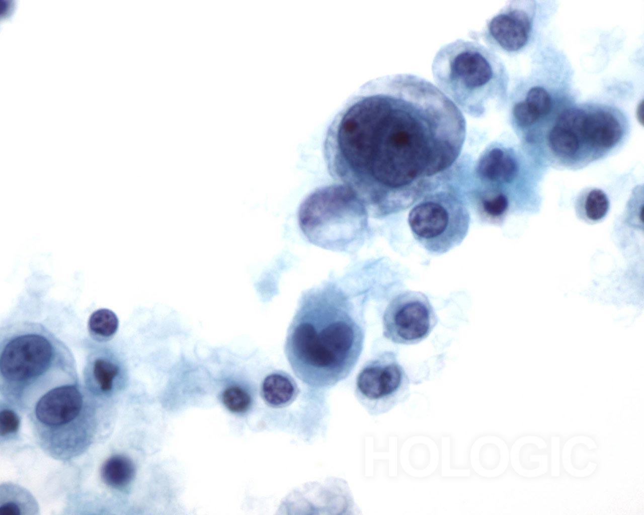 Carcinome Hépato Cellulaire (CHC) susceptible de répandre des cellules malignes dans l’épanchement péritonéal. Cytoplasme granulaire et placé au centre, noyaux anormaux. Peut être difficile à distinguer d’un adénocarcinome.