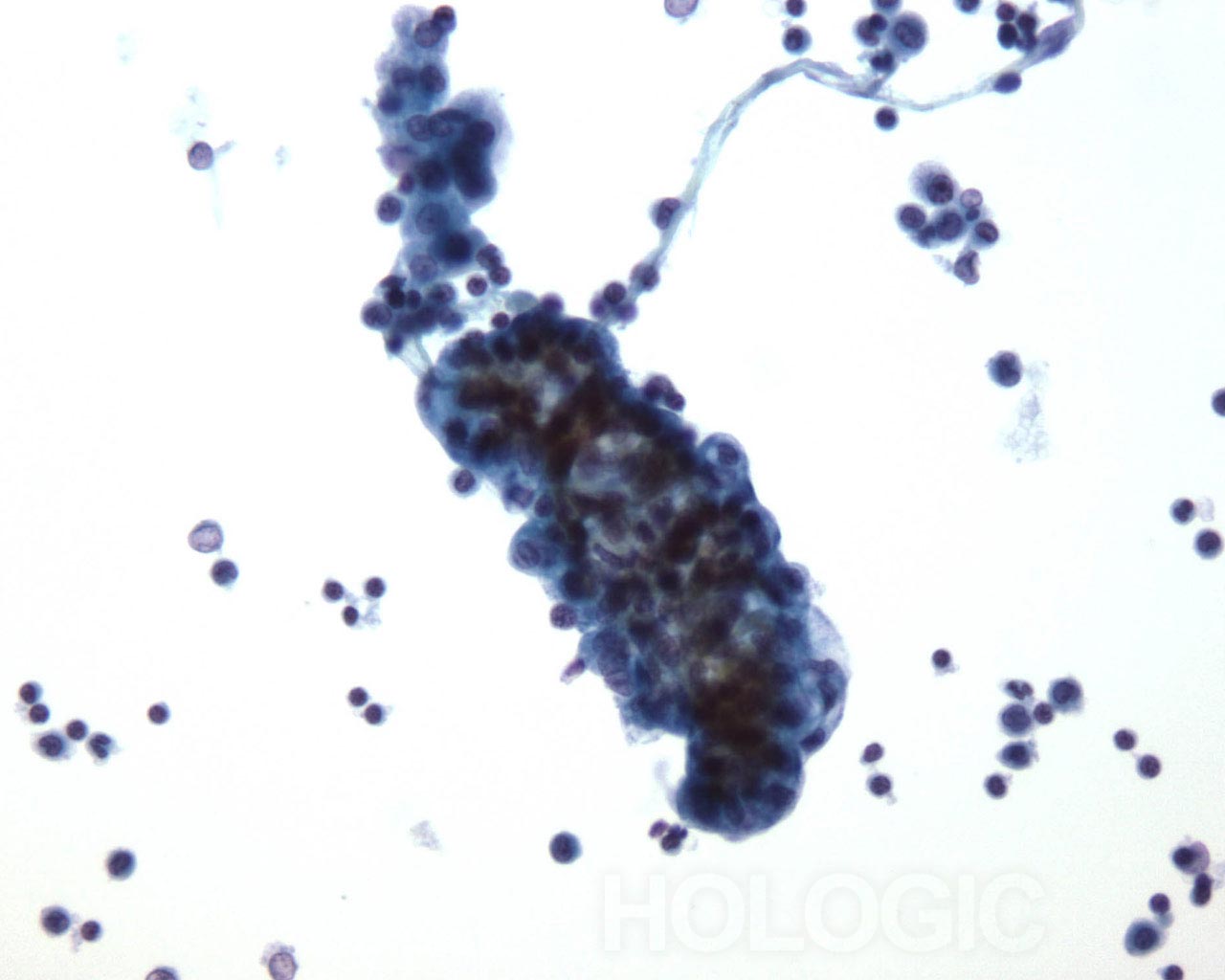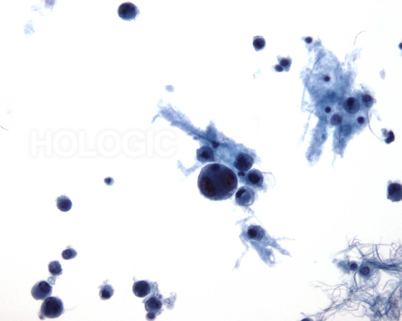 Lavages abdominaux avec cellules glandulaires malignes. Échantillon provenant d’un patient souffrant d’un adénocarcinome du côlon. Groupes papillaires de cellules avec caractéristiques évidentes d’un adénocarcinome, mais aucun indice précis quant à l’origine de la tumeur.