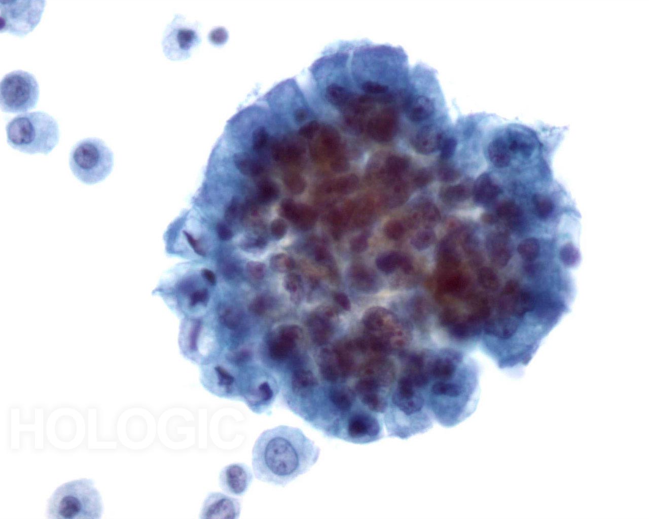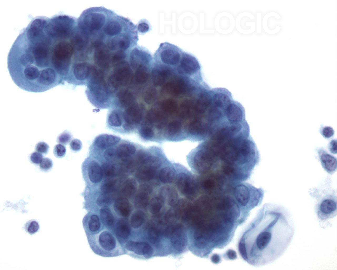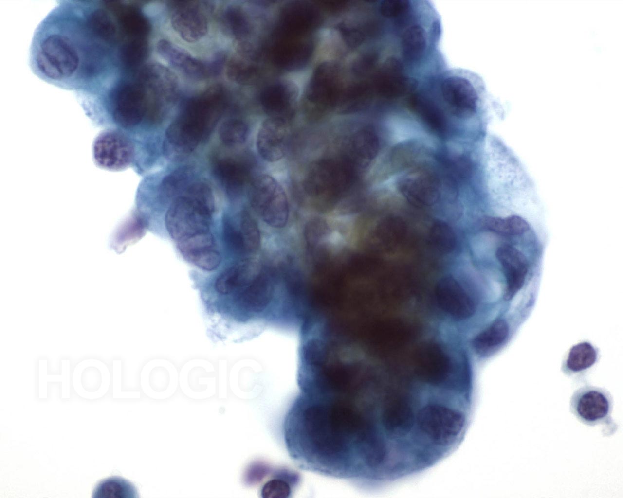 Cellules glandulaires malignes siégeant dans un groupe arrondi et dense. Noter la polarité cellulaire maintenue des cellules de surface et le cytoplasme atypique. Noyaux irréguliers avec nucléoles proéminents.