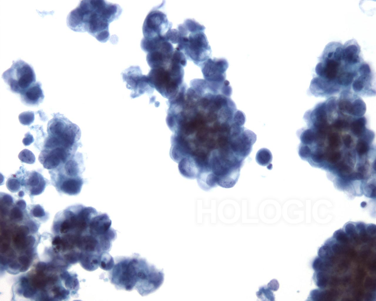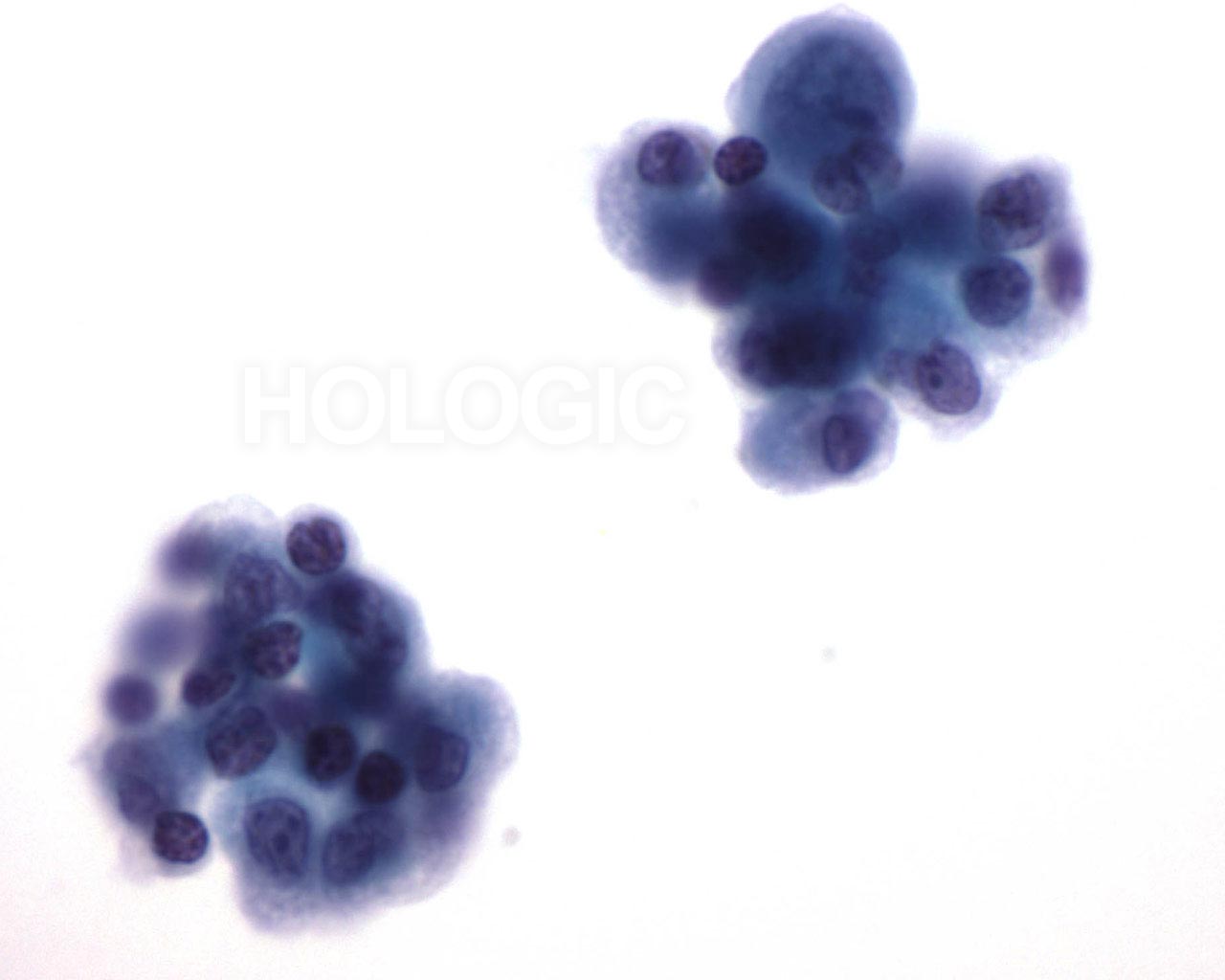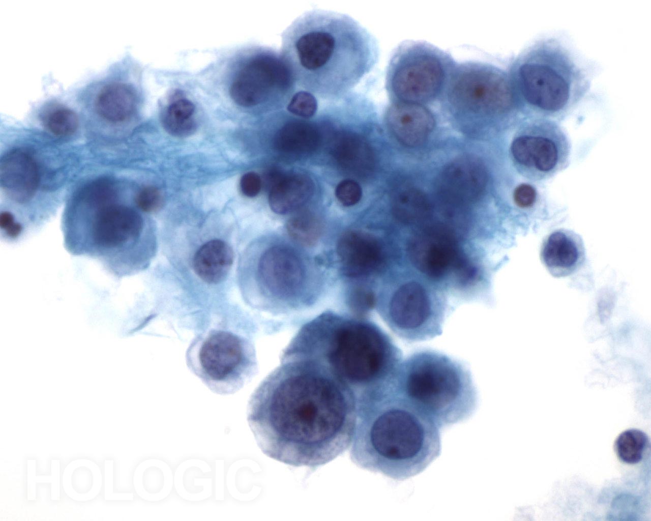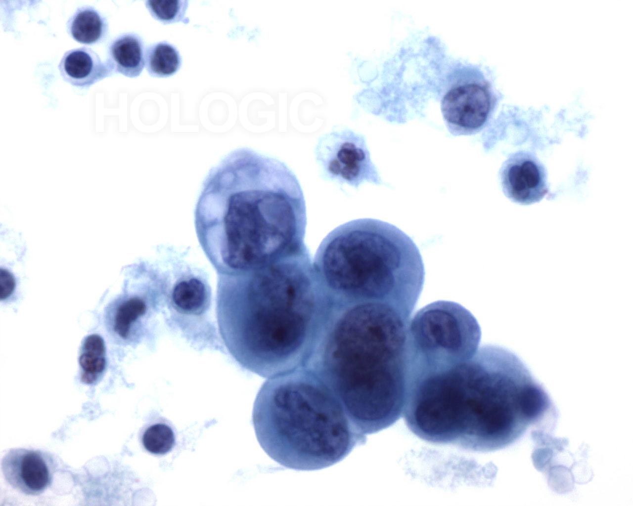 Cellules glandulaires malignes siégeant dans un groupe arrondi et dense. Noter la polarité cellulaire maintenue des cellules de surface et le cytoplasme atypique. Noyaux irréguliers avec nucléoles proéminents.