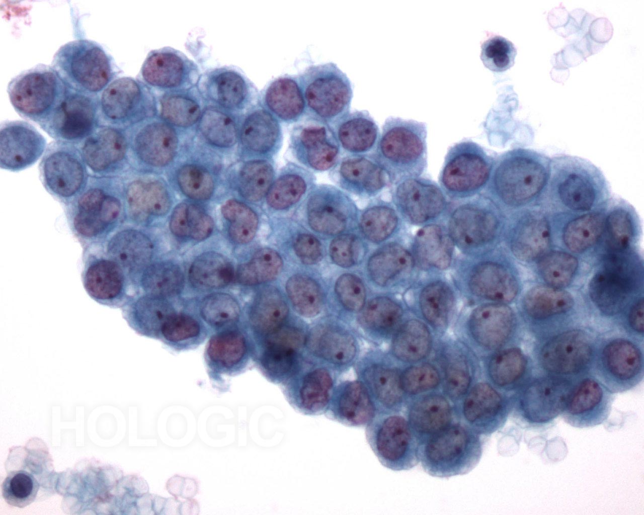 Cohésion modérée dans cet amas de cellules mésothéliales. Noyaux uniformes, membranes nucléaires fines et délicates, petits nucléoles ronds et uniformes.