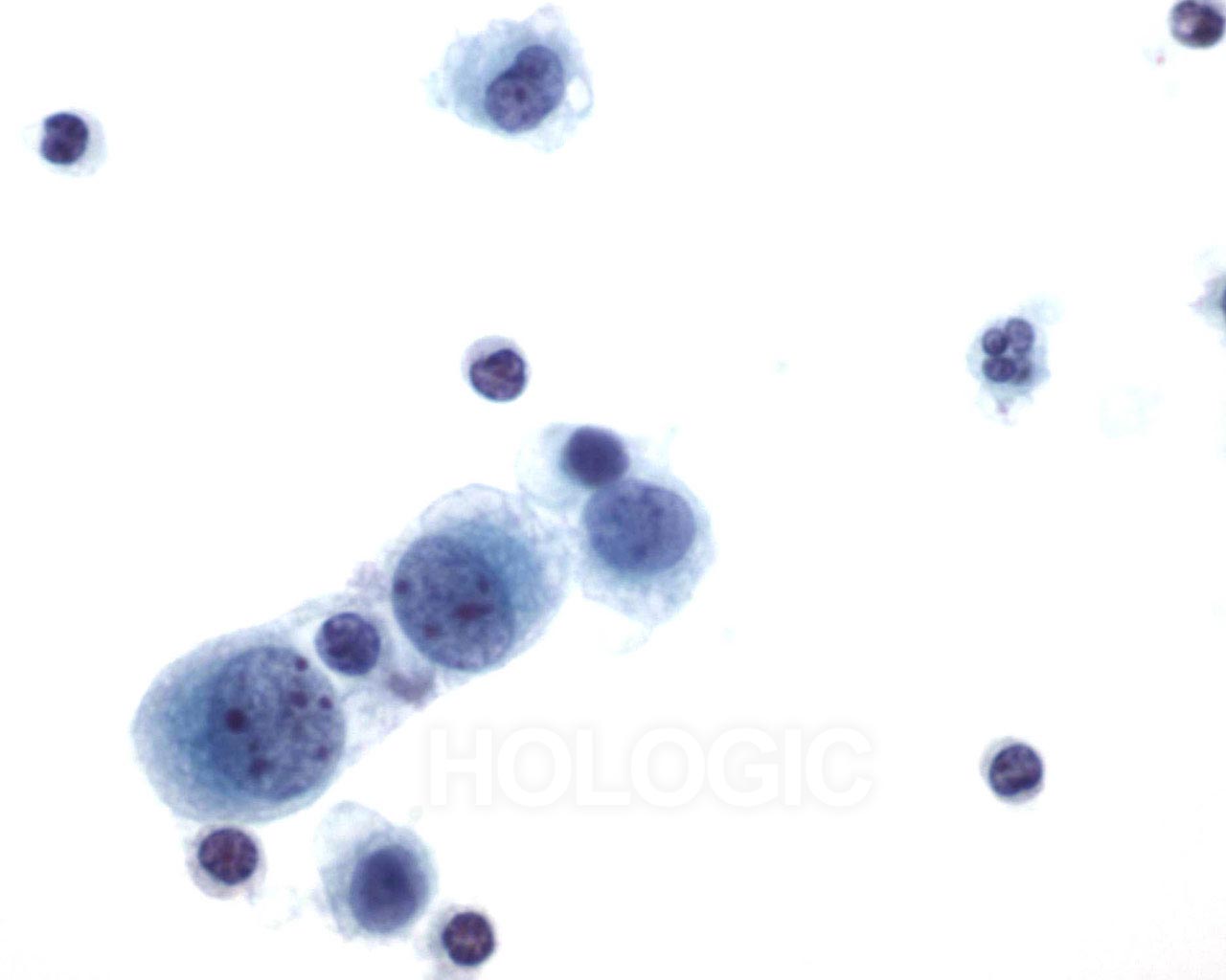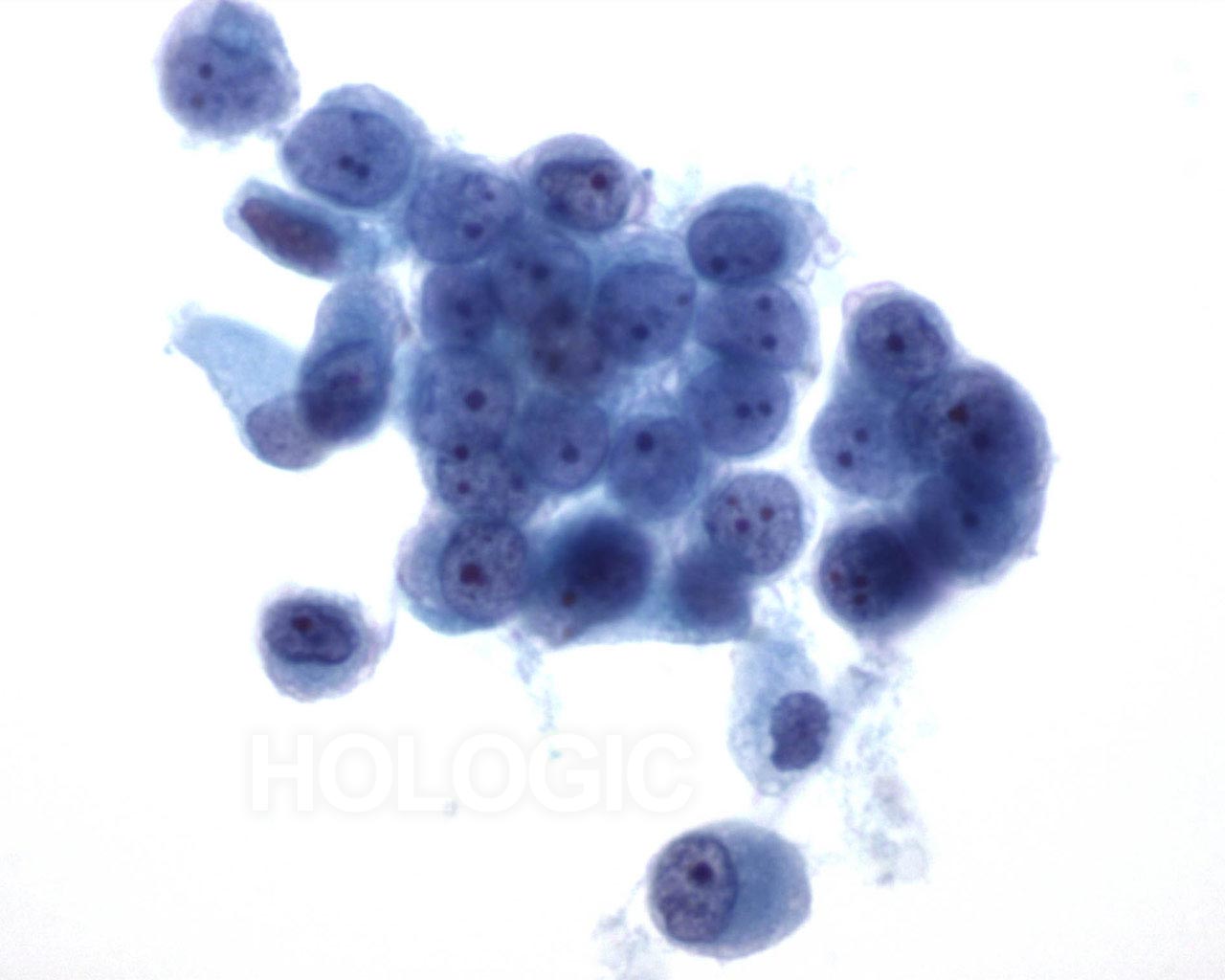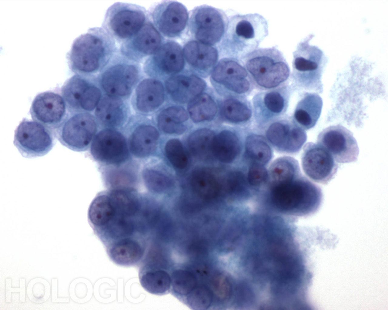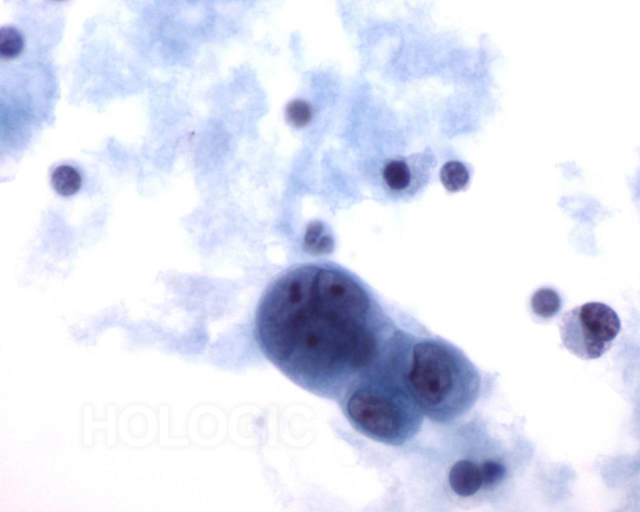 Amas de cellules mésothéliales bénignes (contenant souvent moins de 12 cellules, mais parfois composés de plus de 50 cellules). Sur ces microphotographies, la dispersion régulière de cellules uniformes, avec noyaux réguliers, membranes nucléaires délicates et petits nucléoles ronds indiquent la nature bénigne de ces cellules.