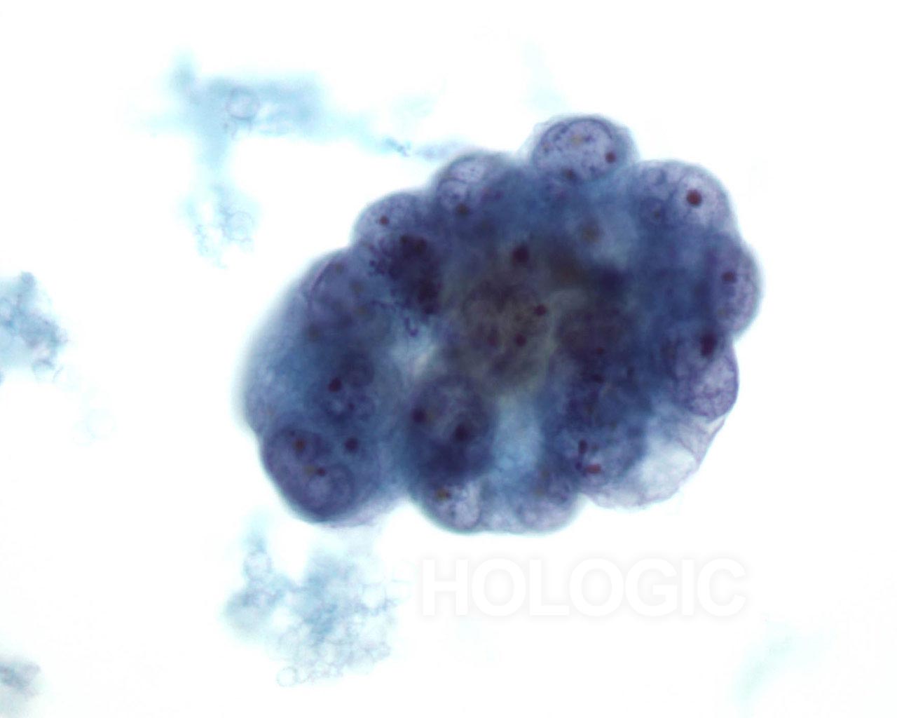 È possibile osservare la disposizione ghiandolare papillare delle cellule tumorali, i nucleoli prominenti, la vacuolizzazione e gli apparati mitotici. Può essere impossibile una distinzione da altre origini di adenocarcinoma.