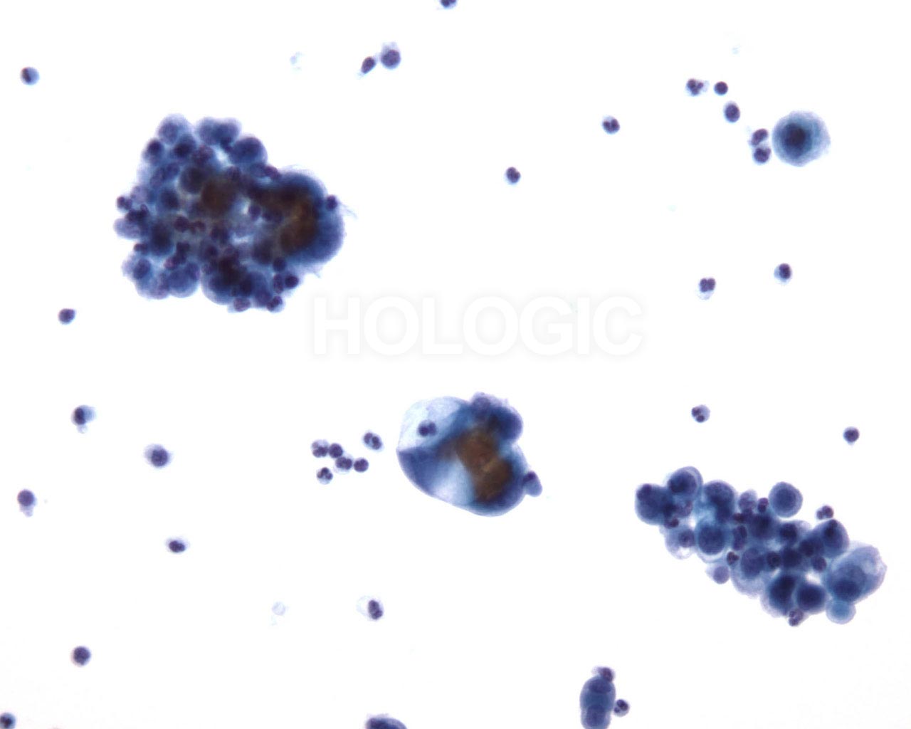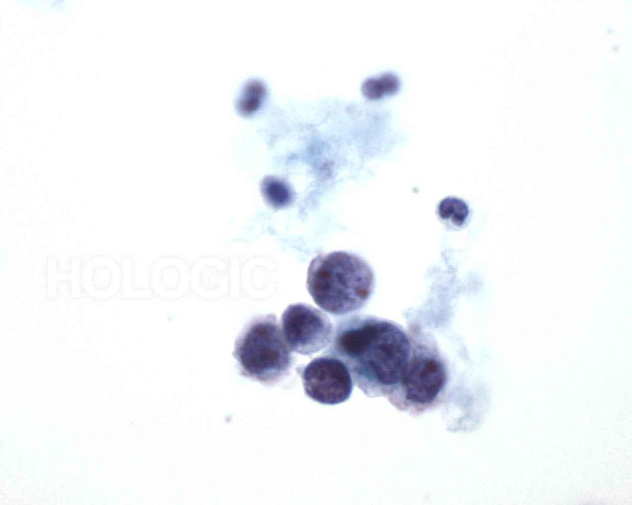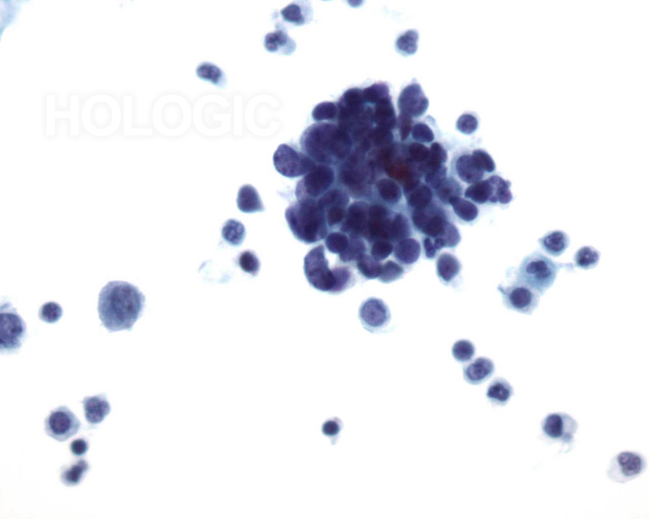 Le cellule piccole e scure provenienti da un carcinoma indifferenziato a piccole cellule si presentano singolarmente e in piccoli gruppi. È possibile osservare il ripiegamento nucleare.