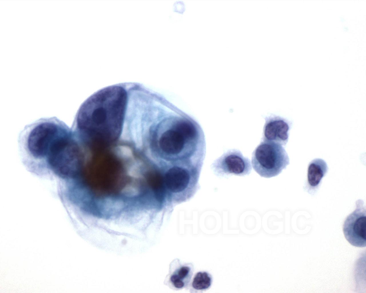 carcinoma indifferenziato a piccole cellule, origine polmonare. È possibile notare aggregati di cellule mesoteliali benigne e tre cellule grandi provenienti da un carcinoma indifferenziato a piccole cellule sul bordo di uno degli aggregati. 60x