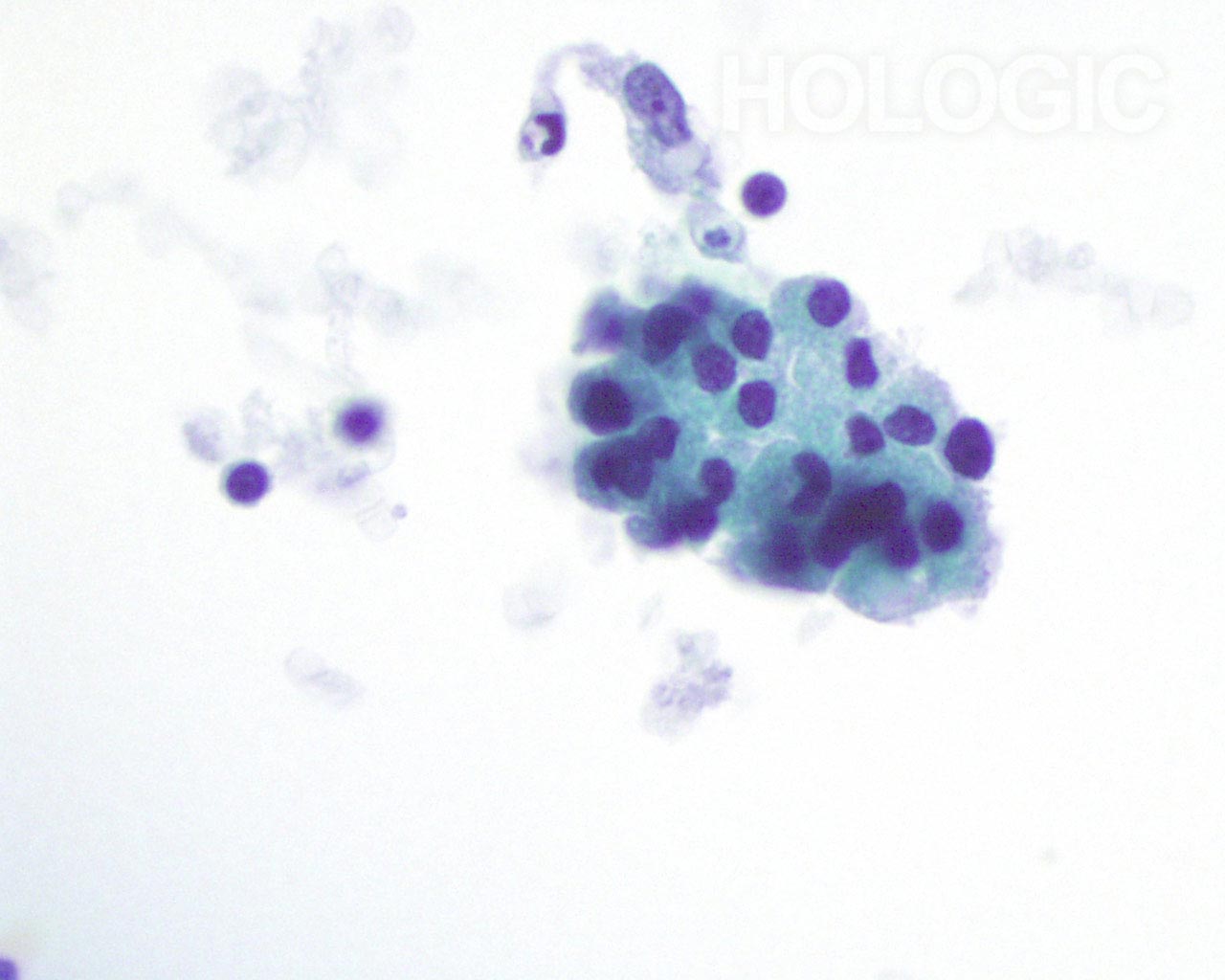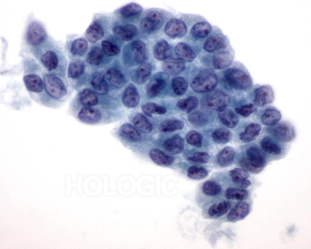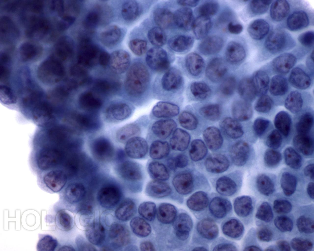 In questo lembo di cellule sono presenti molte delle caratteristiche del carcinoma papillare, come la cromatina dall’aspetto “polveroso”, i solchi nei nuclei e i piccoli nucleoli prominenti. Non sono rilevabili inclusioni citoplasmatiche intranucleari. Inoltre, i nuclei sono più grandi del normale, ma non tanto da presentarsi a stampo e affollati. L’esame istologico consente di confermare nel 65-90% di questi casi la presenza di carcinoma papillare. Il rimanente 10-35% di casi rappresenta un sospetto di carcinoma papillare.60x
