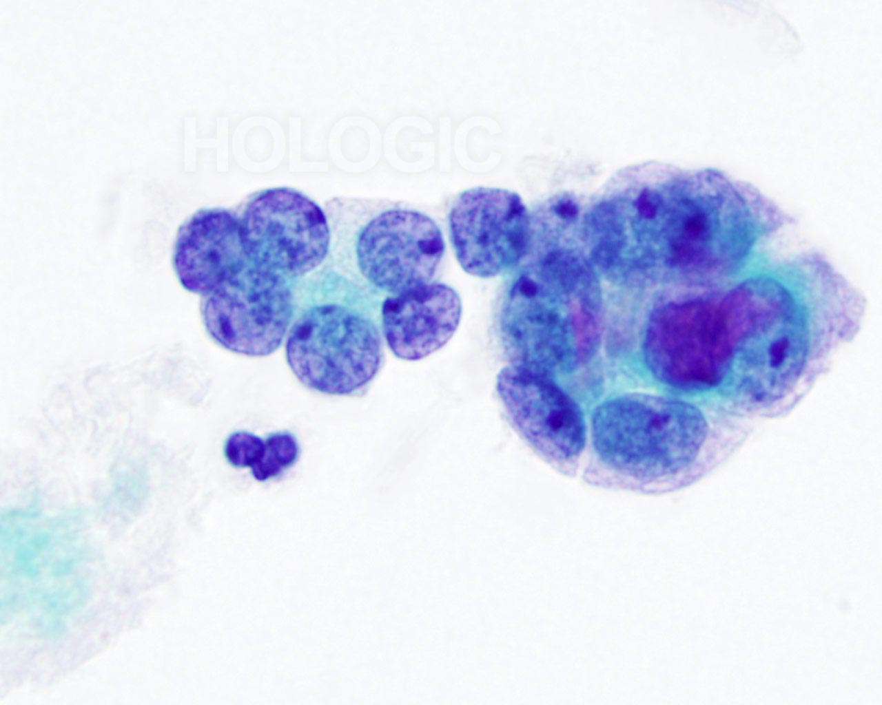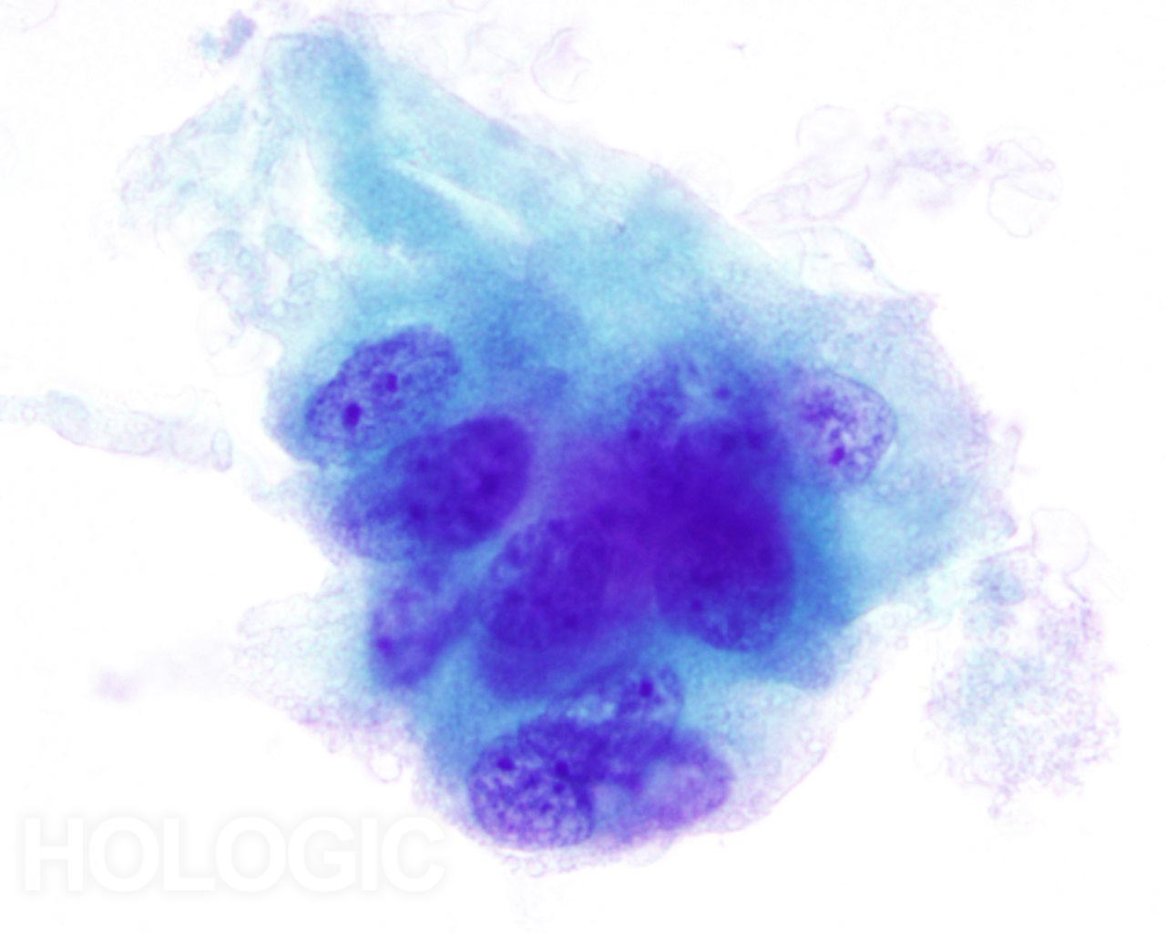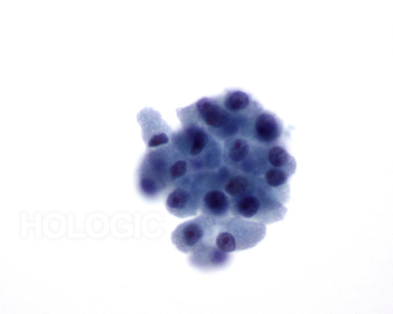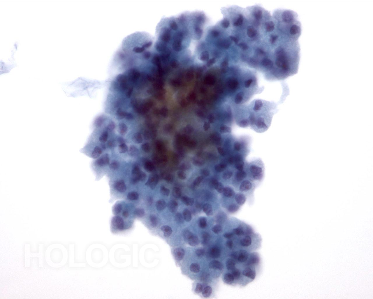 In questo lembo di cellule sono presenti molte delle caratteristiche del carcinoma papillare, come la cromatina dall’aspetto “polveroso”, i solchi nei nuclei e i piccoli nucleoli prominenti. Non sono rilevabili inclusioni citoplasmatiche intranucleari. Inoltre, i nuclei sono più grandi del normale, ma non tanto da presentarsi a stampo e affollati. L’esame istologico consente di confermare nel 65-90% di questi casi la presenza di carcinoma papillare. Il rimanente 10-35% di casi rappresenta un sospetto di carcinoma papillare.60x