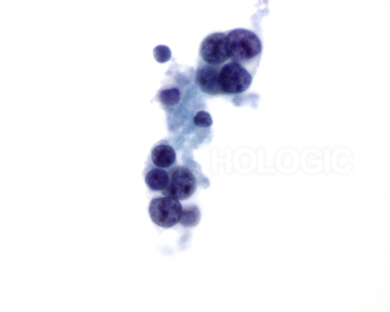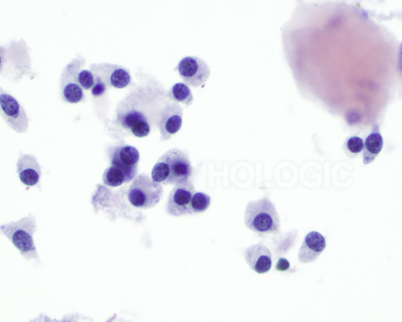 In questa figura è presente un raggruppamento lasso di cellule prevalentemente piccole e uniformi con rari casi di cellule grandi e atipiche. Le cellule piccole hanno nuclei eccentrici e citoplasma leggermente granulare. Questa figura e le seguenti costituiscono una presentazione insolita di FNA di carcinoma midollare. 60x