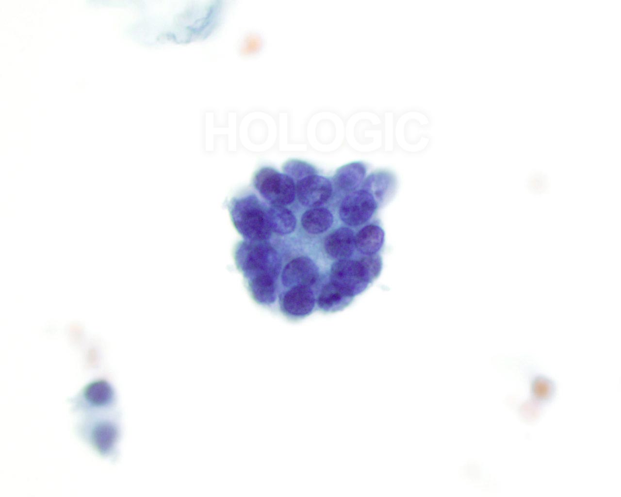 Questa categoria comprende le lesioni follicolari che presentano un pattern macrofollicolare o una combinazione di pattern micro e macrofollicolare con abbondante colloide nello sfondo. Nei campioni ThinPrep i macrofollicoli appaiono sotto forma di foglietti di decine di cellule follicolari distribuite in modo uniforme e con nuclei adeguatamente distanziati. Il significato delle cellule follicolari singole nel ThinPrep è incerto e tuttavia sono considerate come appartenenti a un pattern micro o macrofollicolare. La probabilità che a un esame istologico queste lesioni si rivelino come maligne (variante follicolare del carcinoma papillare o carcinoma follicolare) è molto bassa, ma non pari a zero. In letteratura, è compresa tra lo 0 e il 43% nella maggior parte dei casi [6, 9, 12, 13, 14, 15, 16, 17, 18, 19, 20, 21, 24, 25, 26, 27] non supera il 6%, tranne in tre occasioni [14, 16, 27]. Di conseguenza, la categoria viene definita come molto probabilmente benigna e non inequivocabilmente benigna.