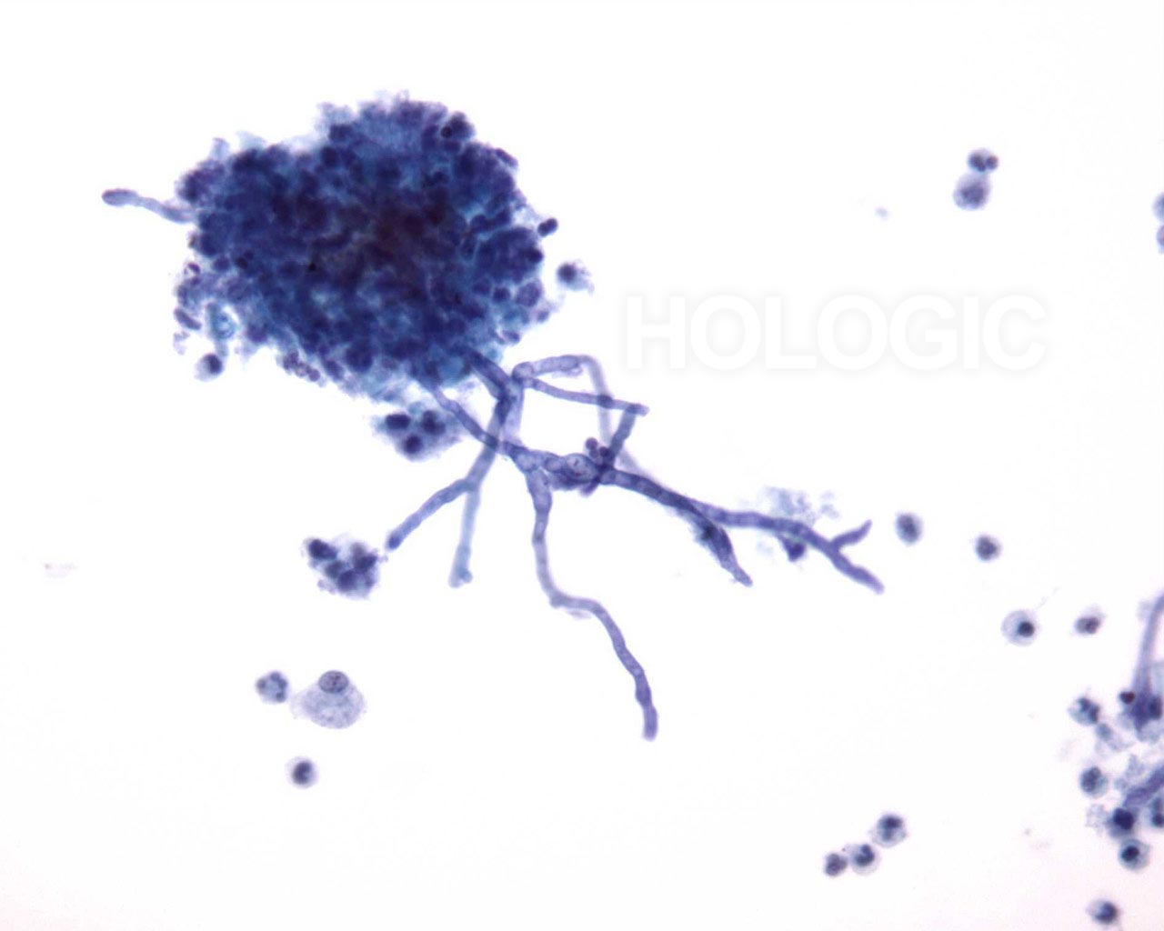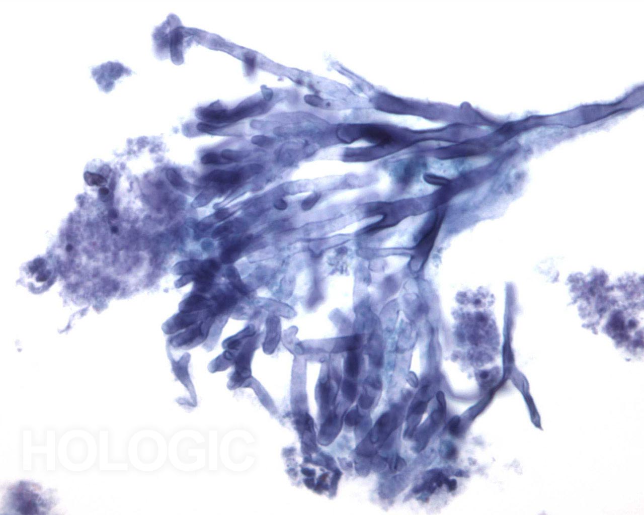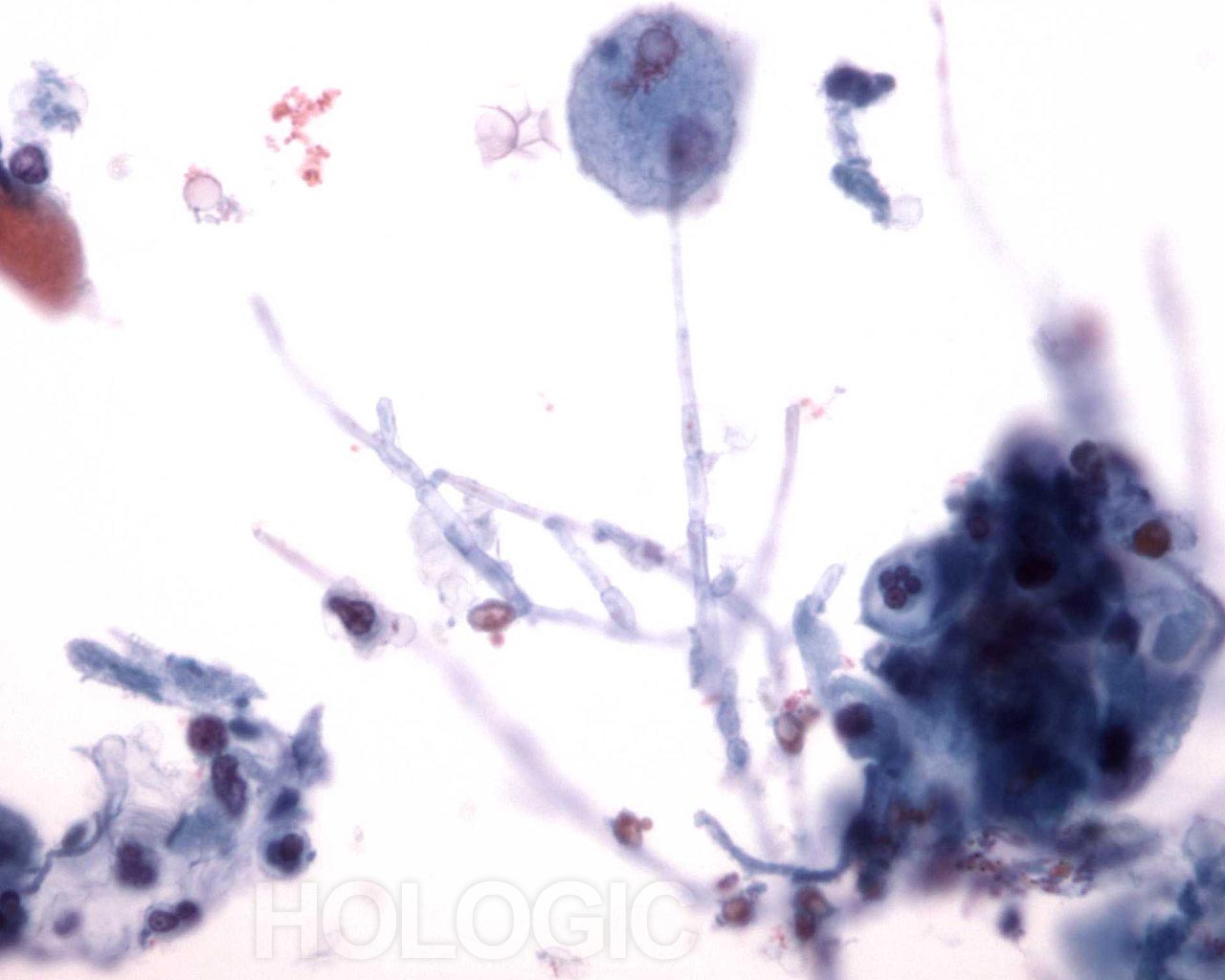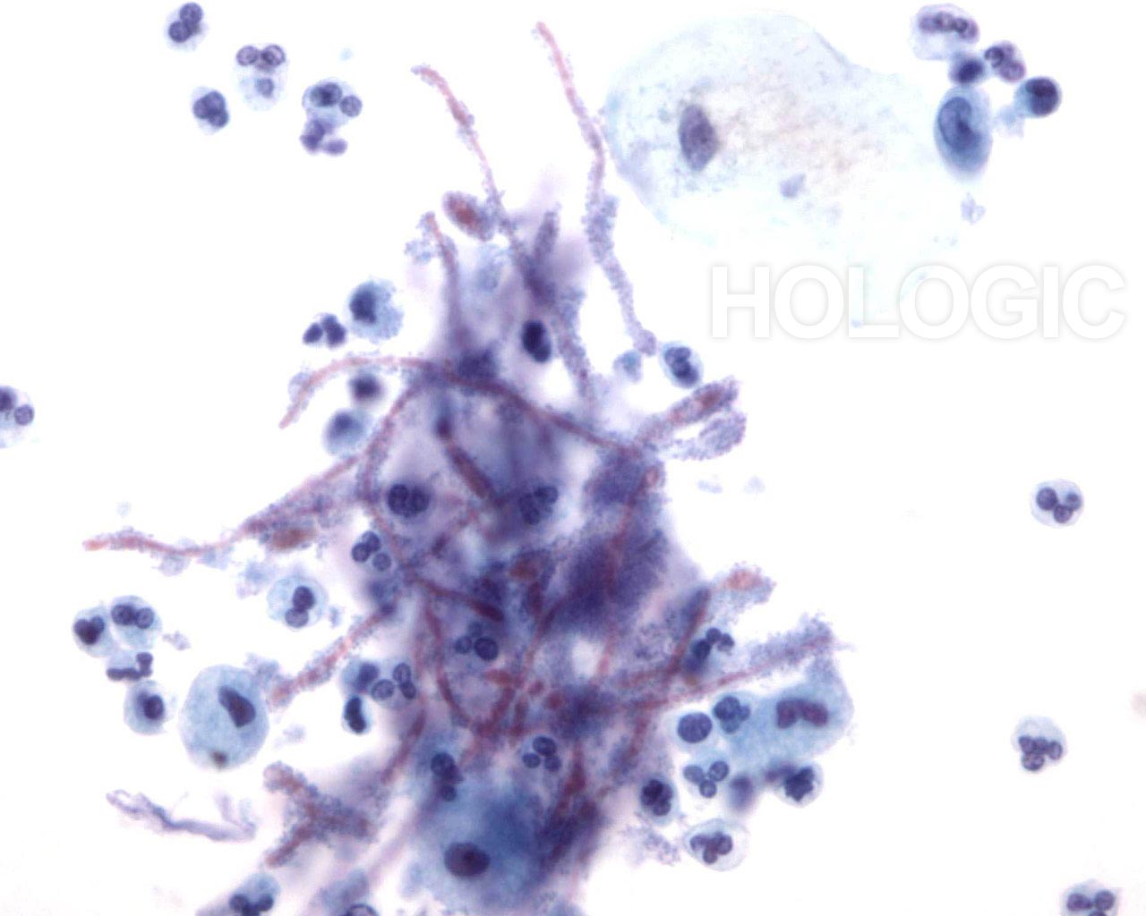 酵母様真菌が、口腔の扁平上皮細胞と混在しています。これは、ほぼ菌混入を示しています。