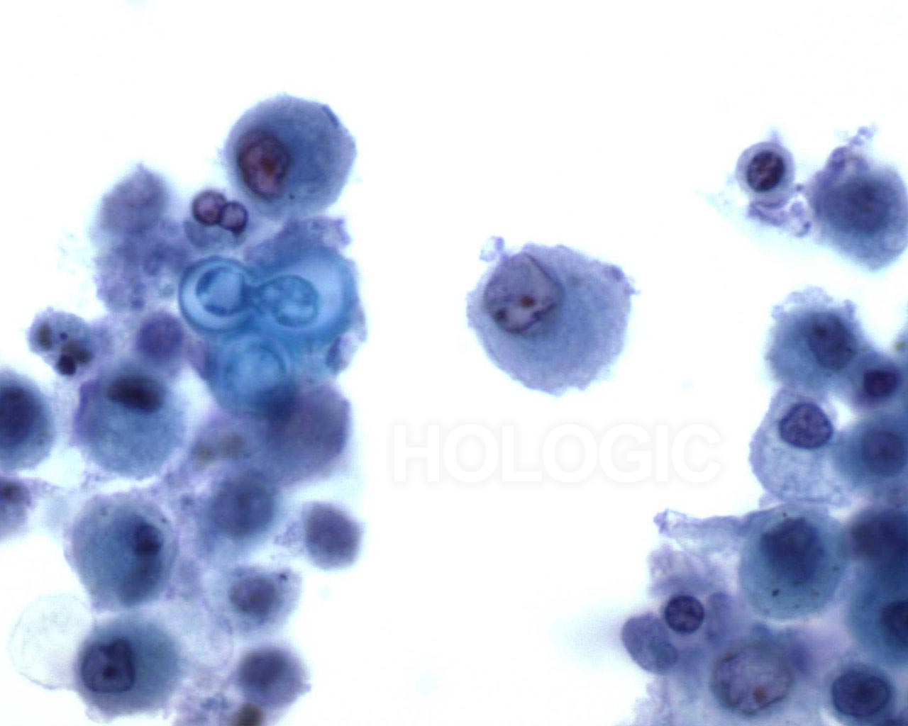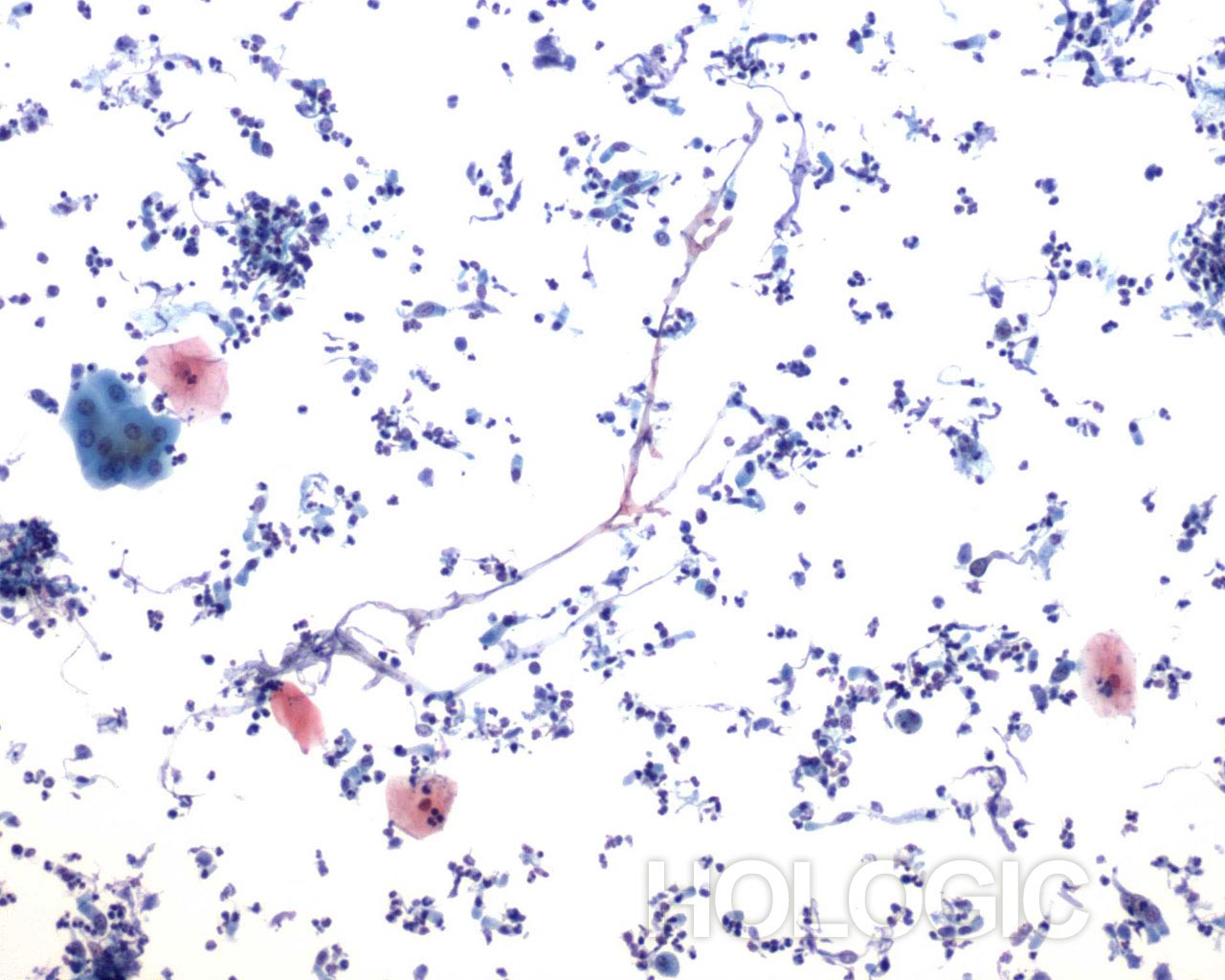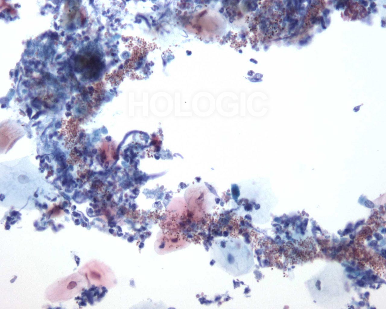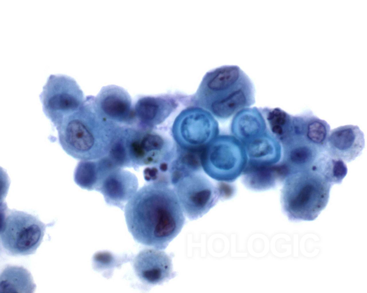 酵母様真菌が、口腔の扁平上皮細胞と混在しています。これは、ほぼ菌混入を示しています。