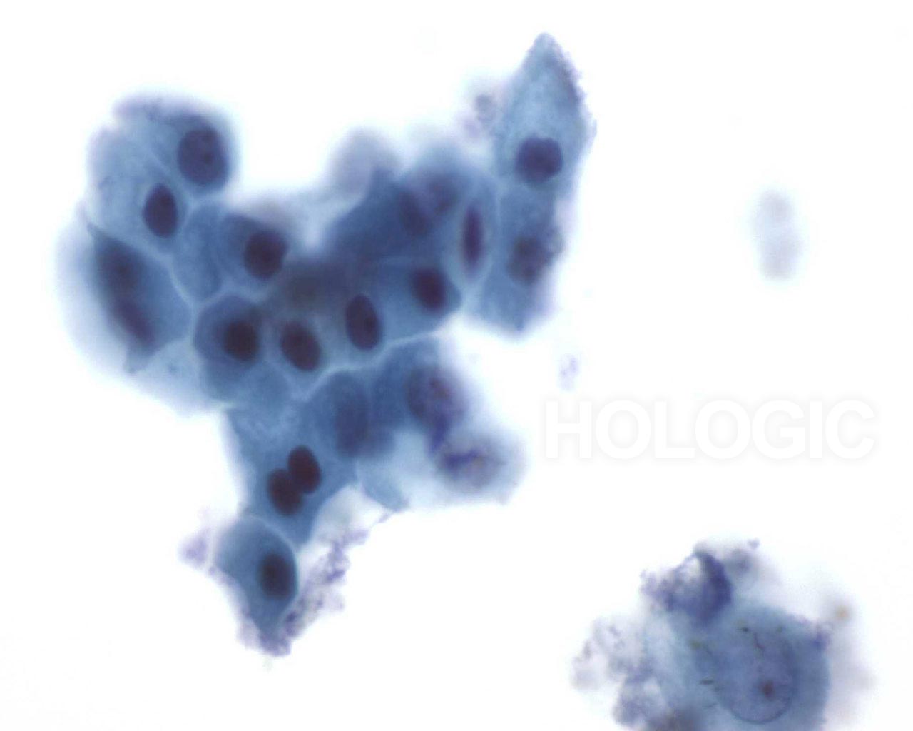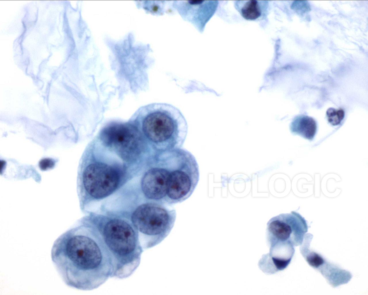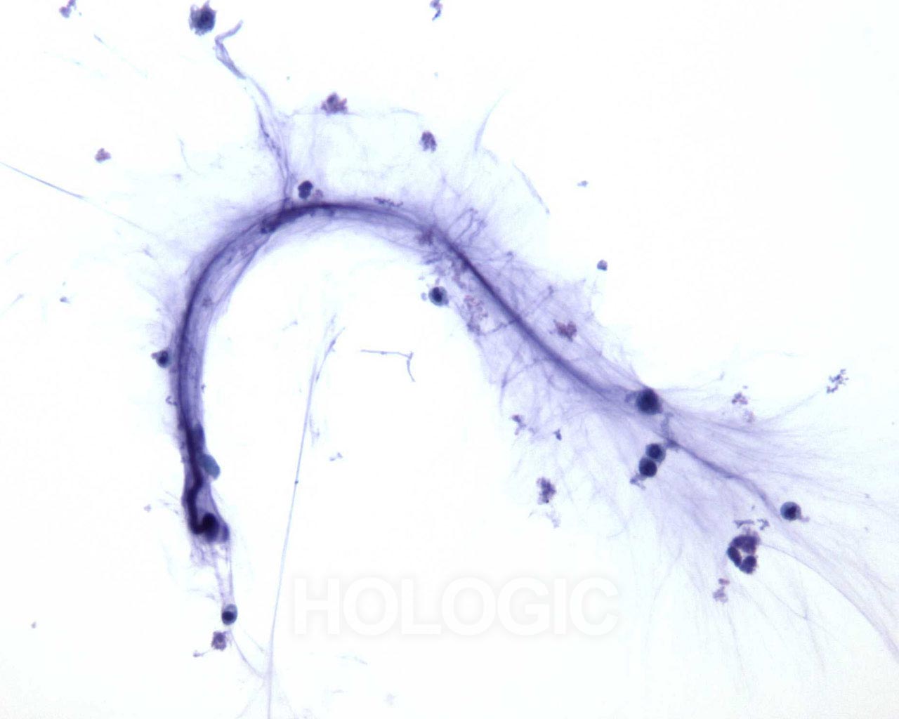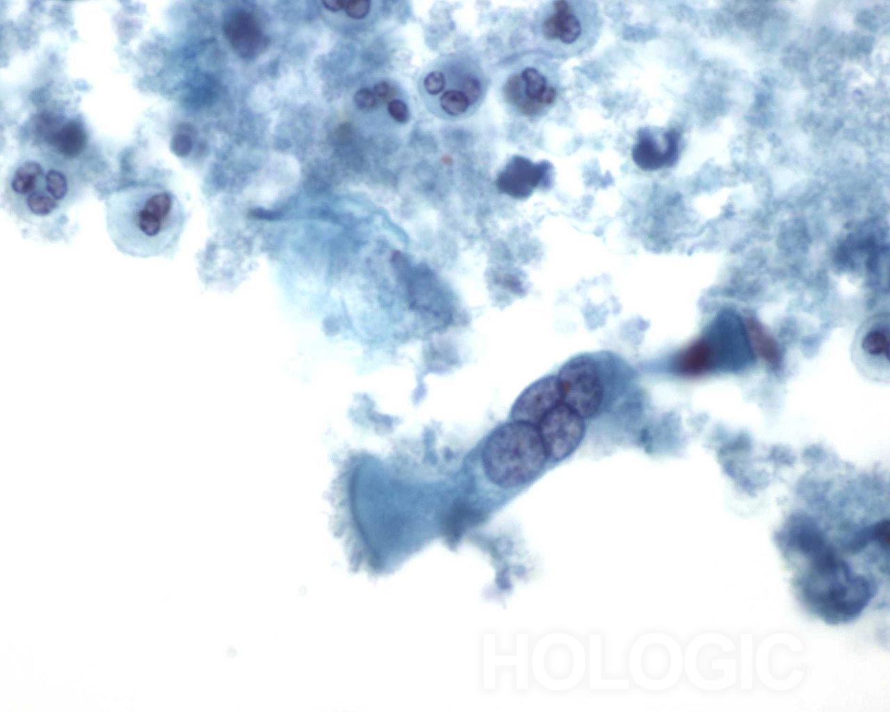 酵母様真菌が、口腔の扁平上皮細胞と混在しています。これは、ほぼ菌混入を示しています。