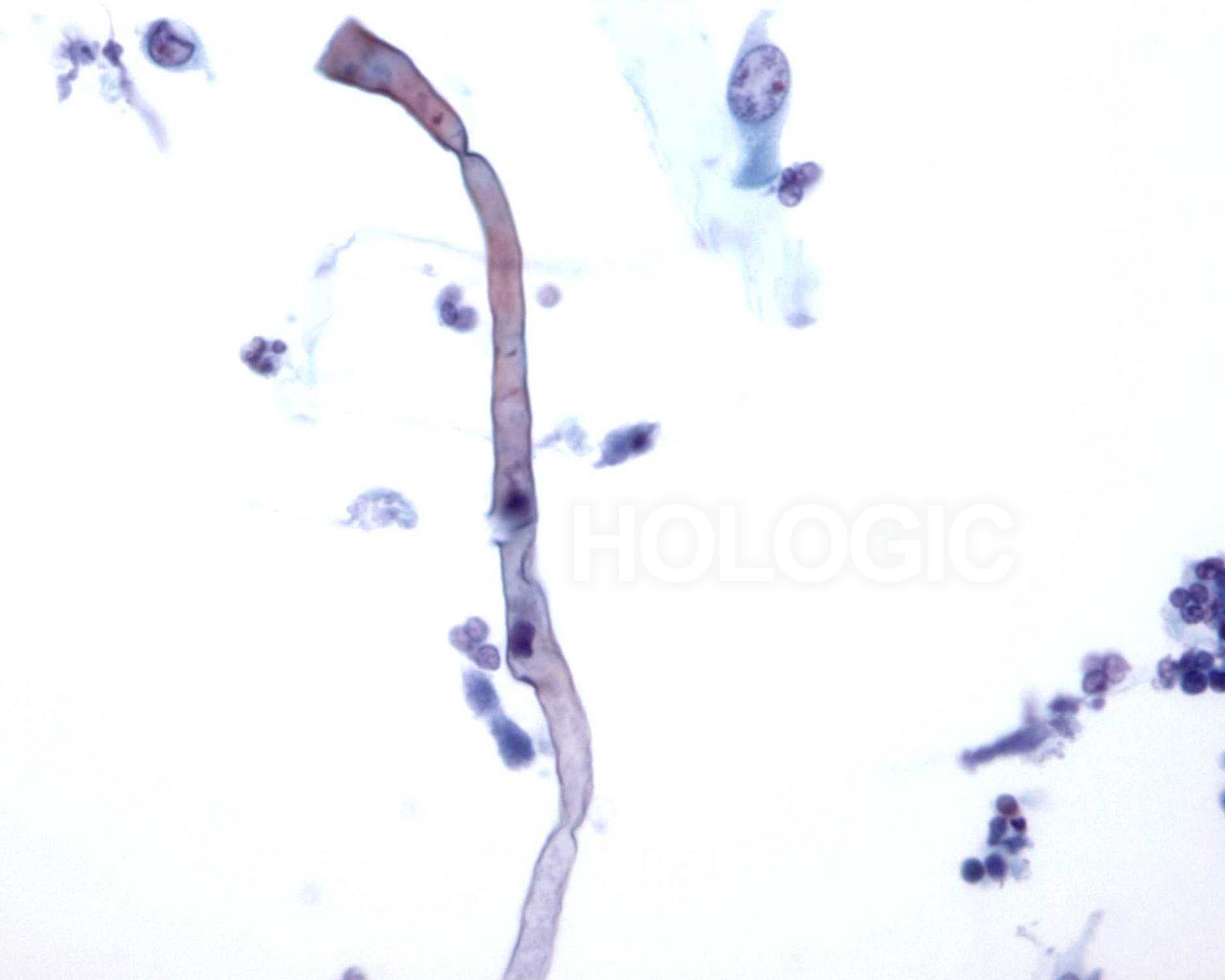 高倍率では、大型で細胞壁の厚い真菌が見えます。