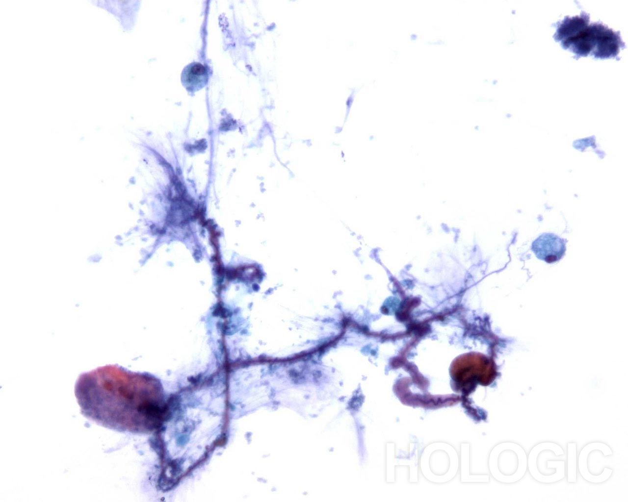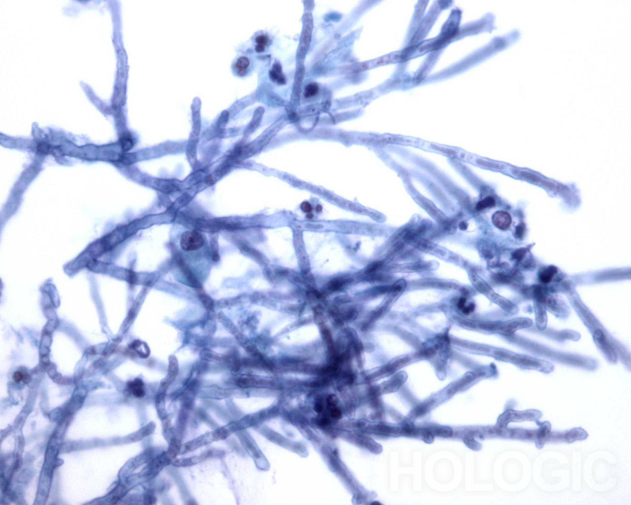 単に、パパニコロー染色によっても、接合菌類には茶色に着色された菌糸が見られます。