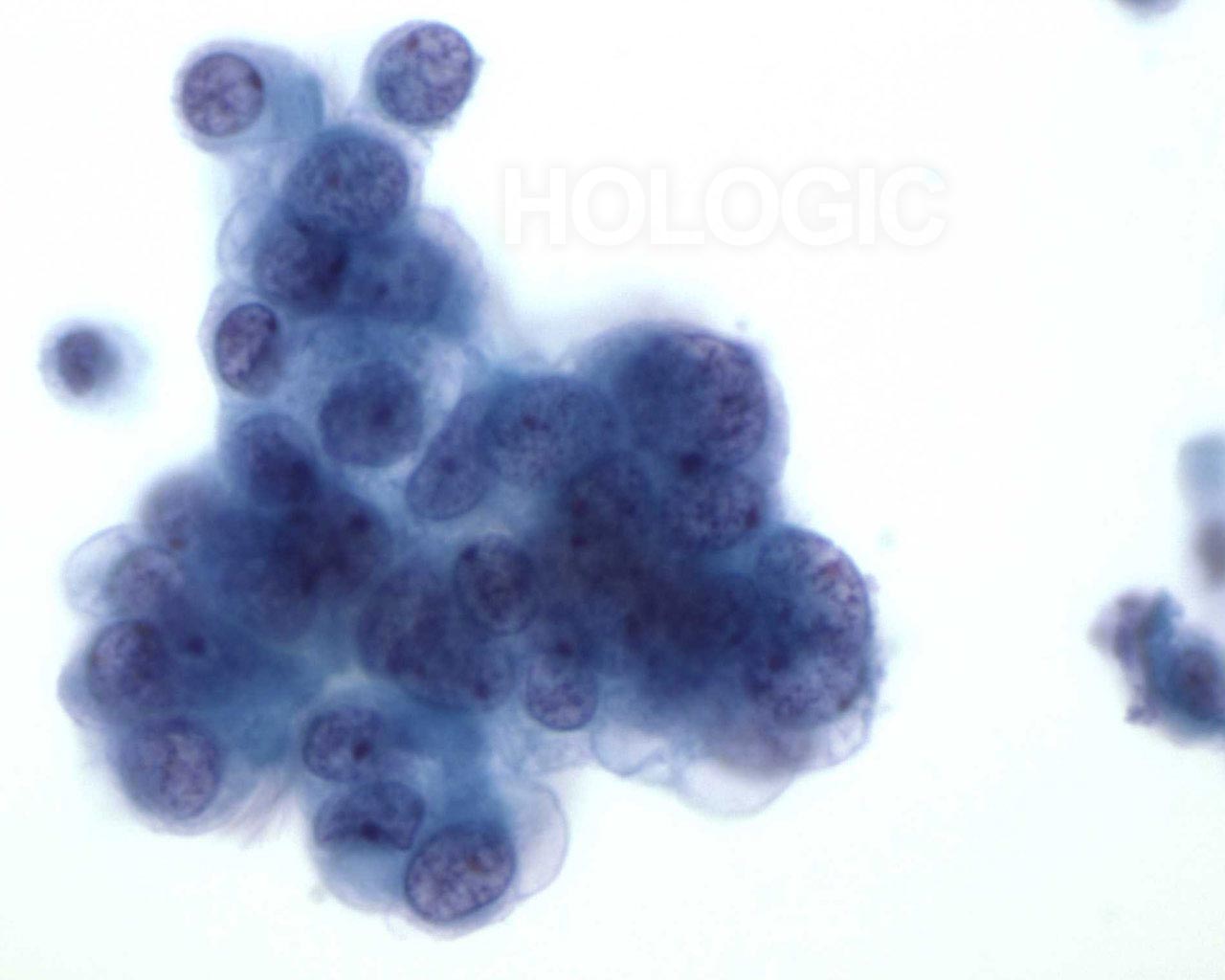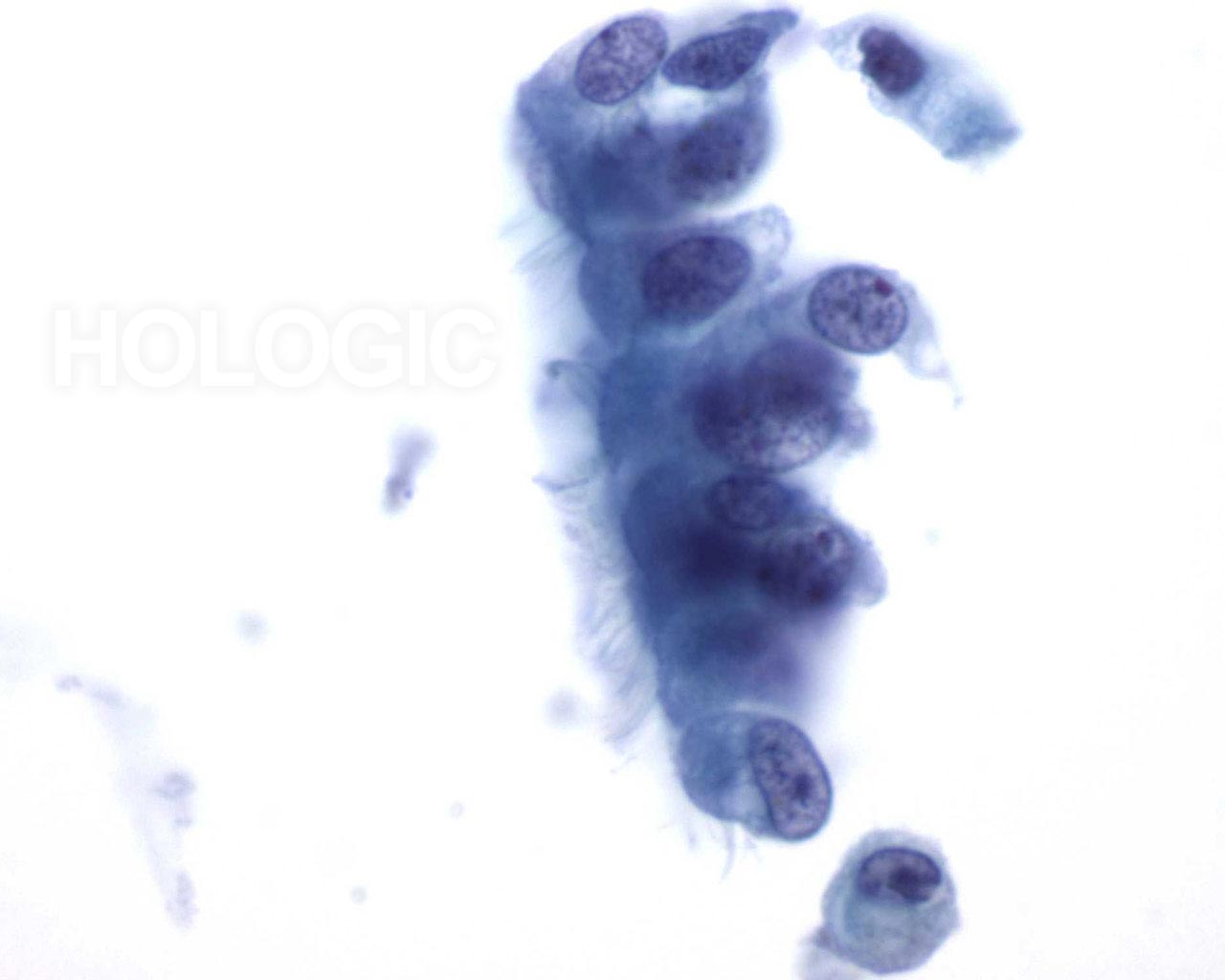 終末細気管支由来の良性細胞が見られます。空胞のある細胞質をご覧ください。