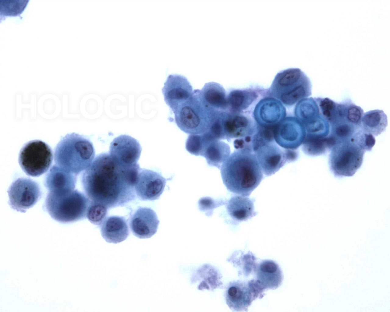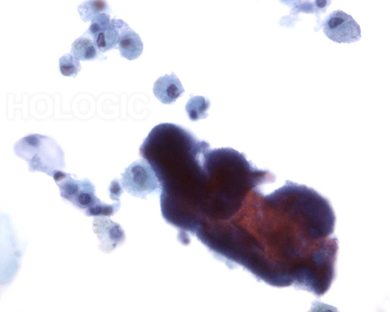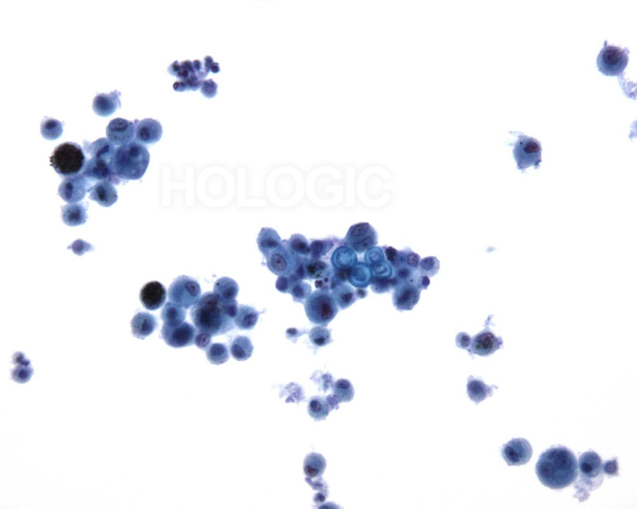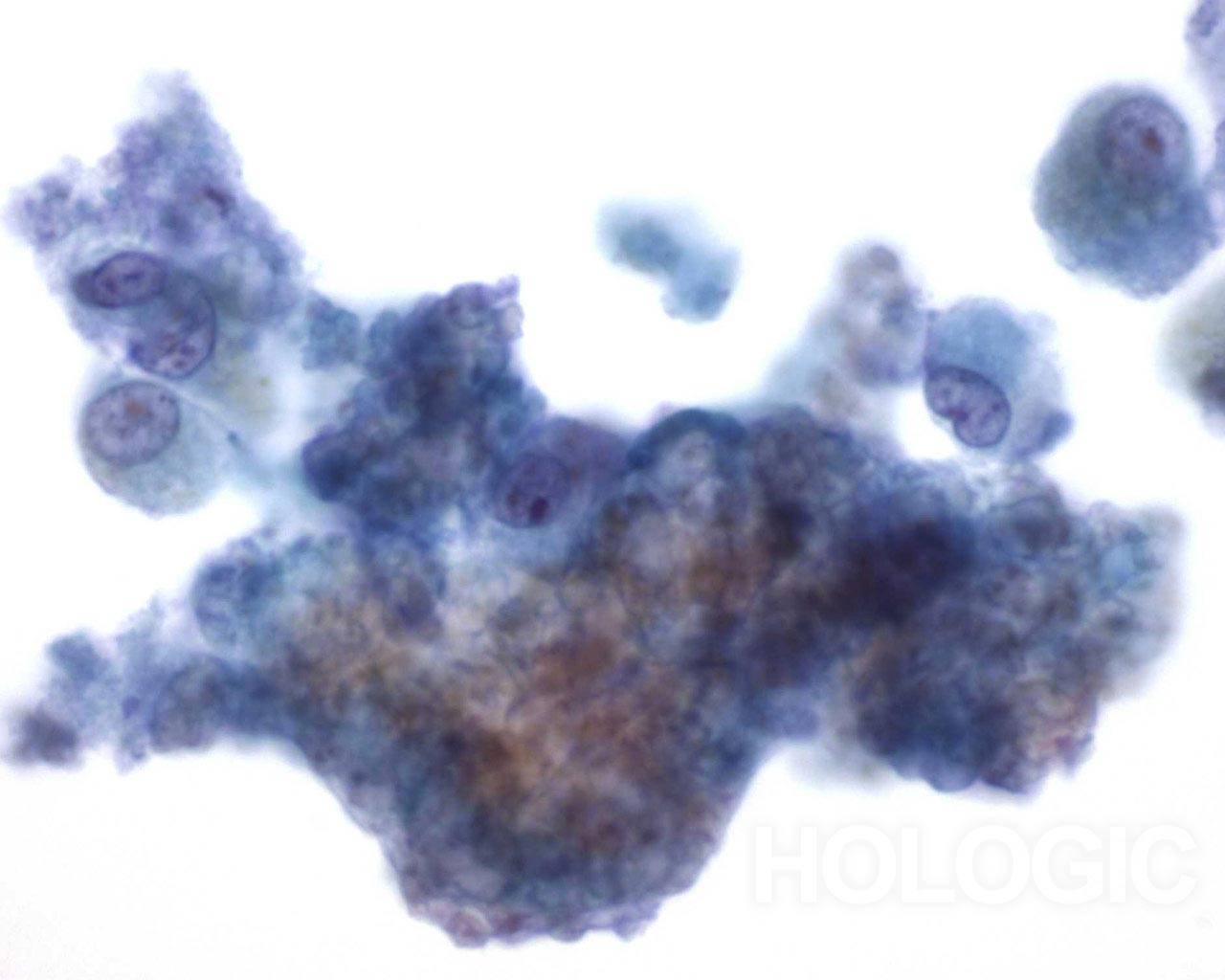 この多核巨組織球は、気管支扁平上皮細胞の反応性集塊と誤診される可能性があります。核は良性の形態を維持します。