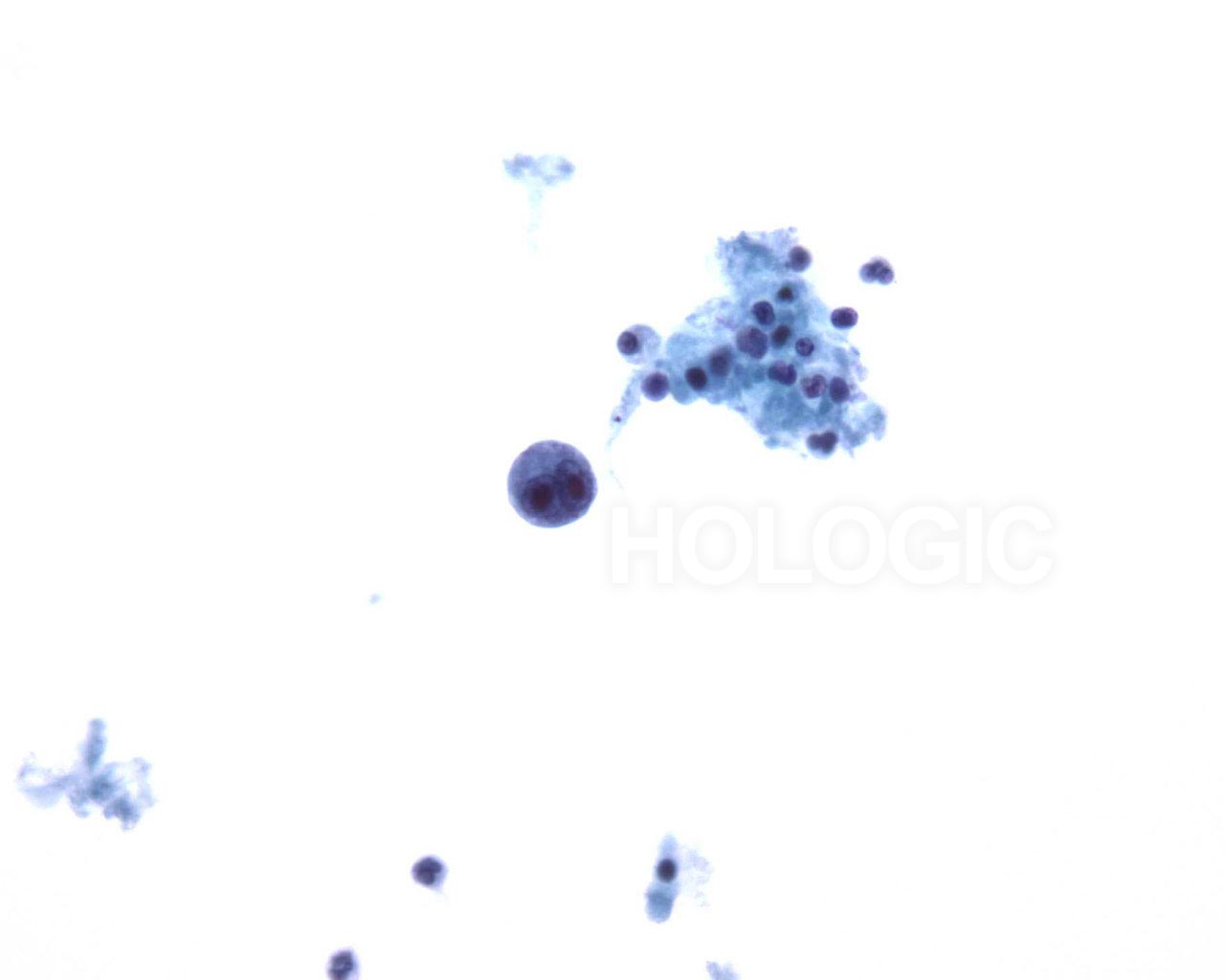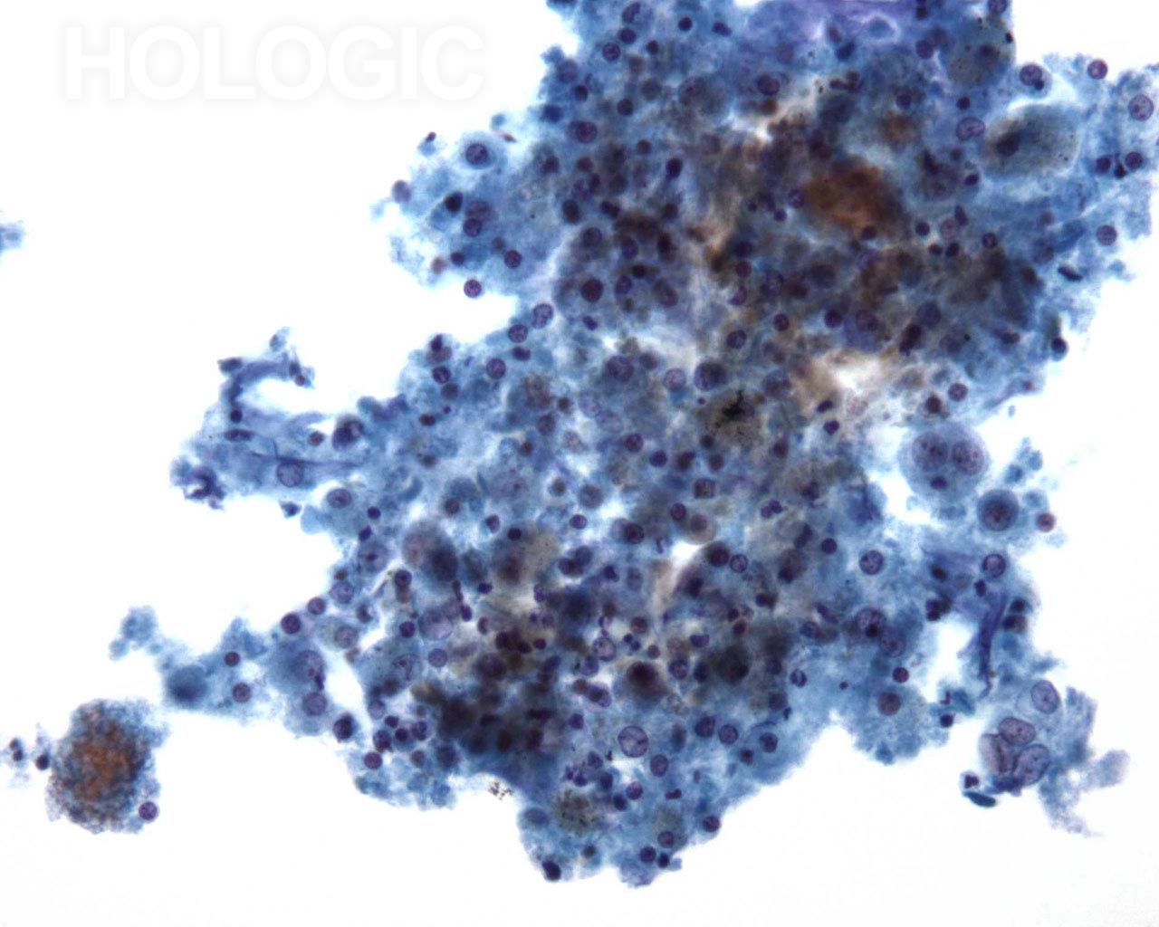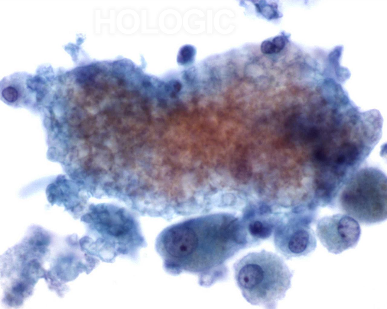 この多核巨組織球は、気管支扁平上皮細胞の反応性集塊と誤診される可能性があります。核は良性の形態を維持します。