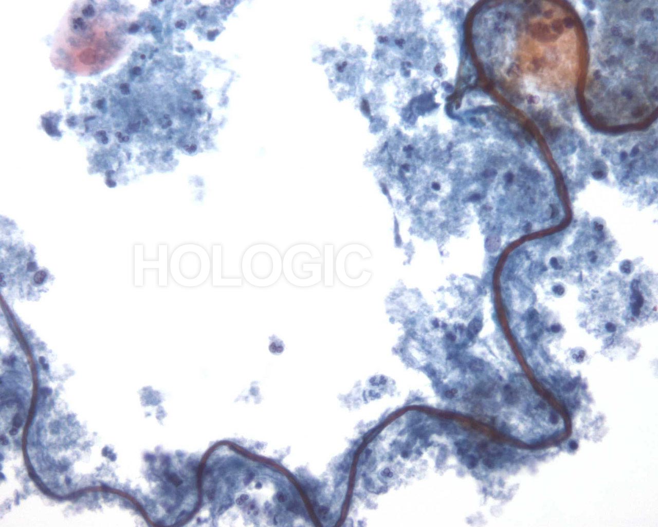 気管支肺胞洗浄法は、感染時に気道周辺の標本を採取するために用いられます。ニューモシスティス カリニが、画像の下部左側に見られます。