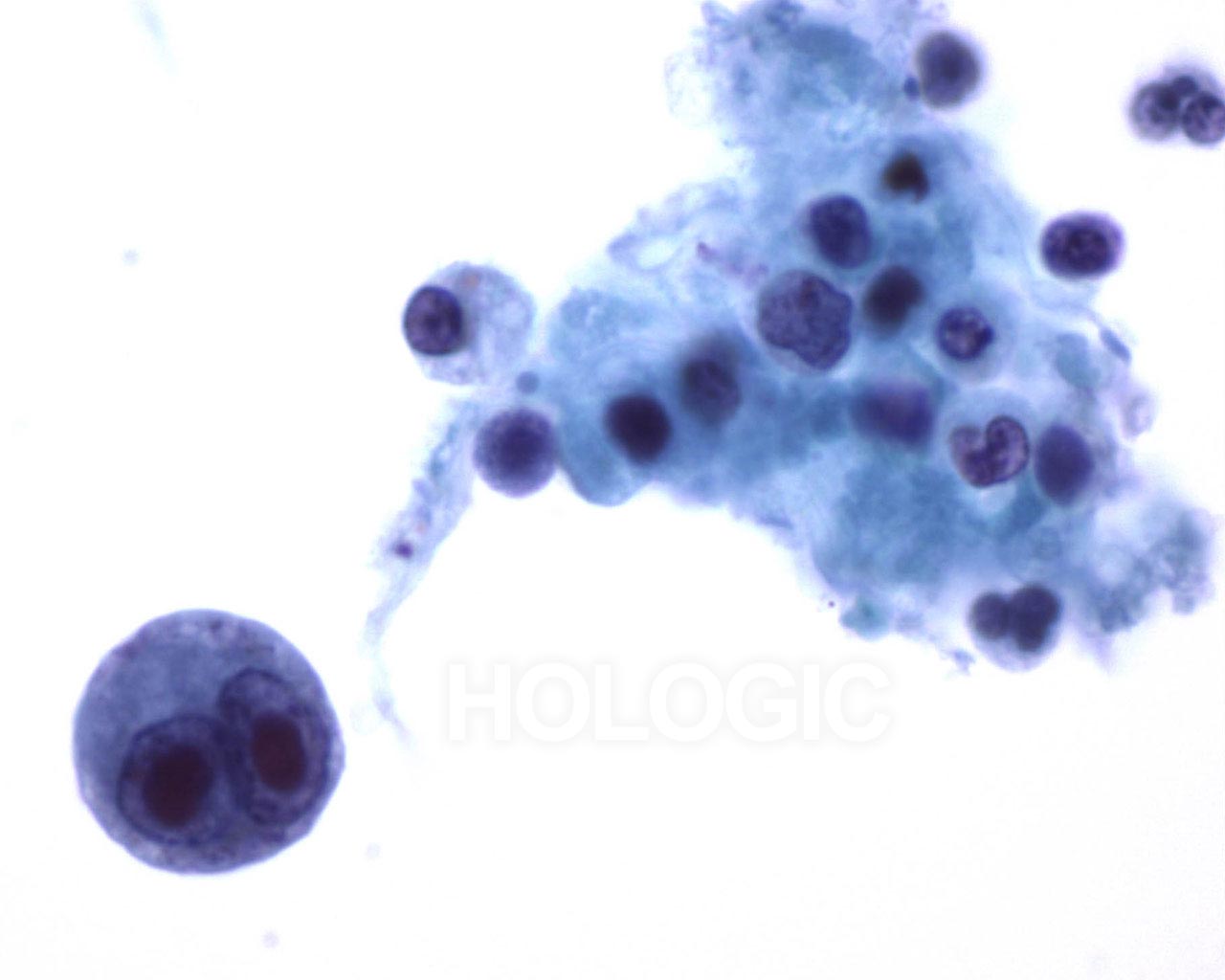 高倍率では、サイトメガロウイルスの核内封入体を随伴するマクロファージに2核が見られます。
