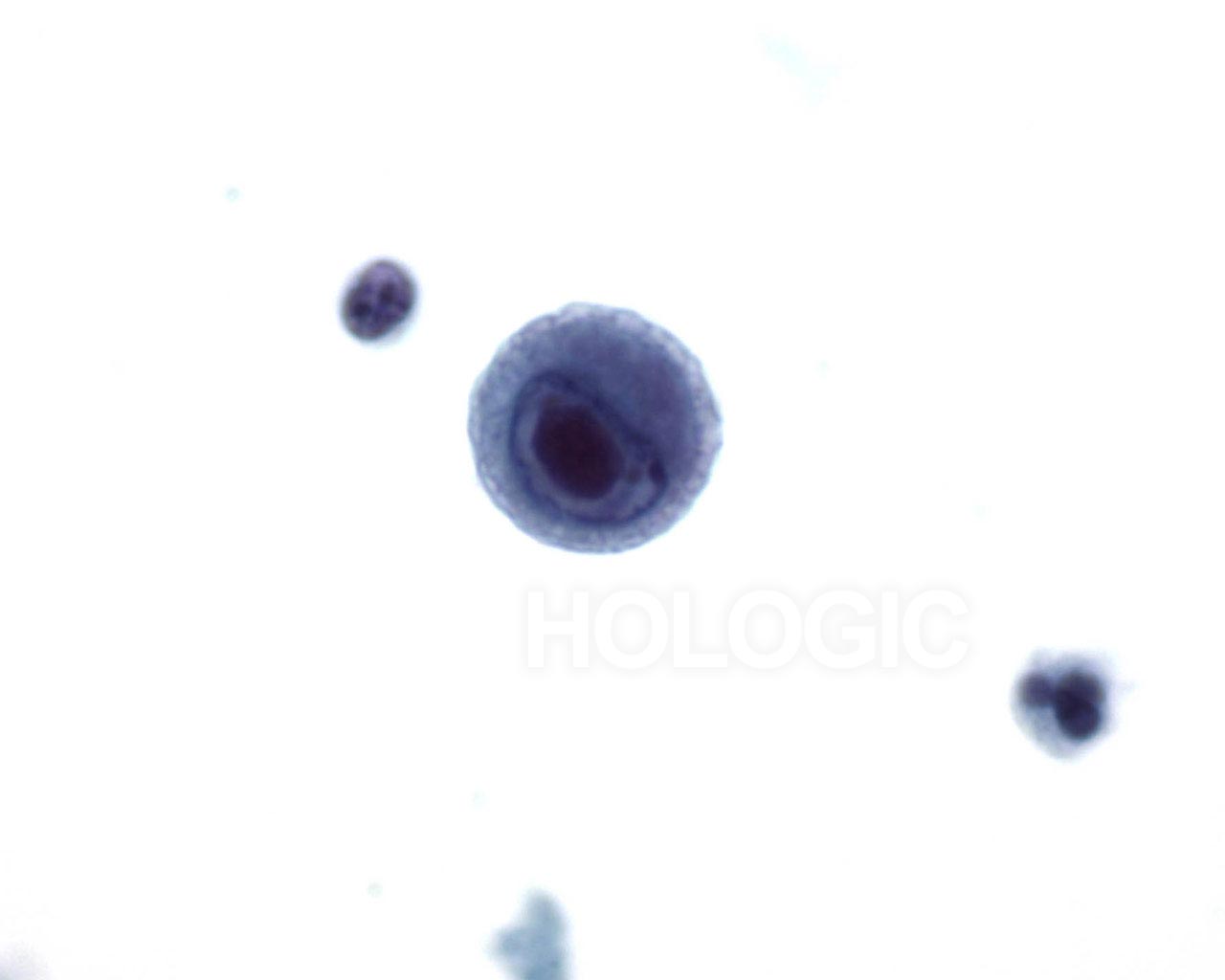 単一のマクロファージと、サイトメガロウイルス(CMV)の核内封入体および細胞質内封入体。