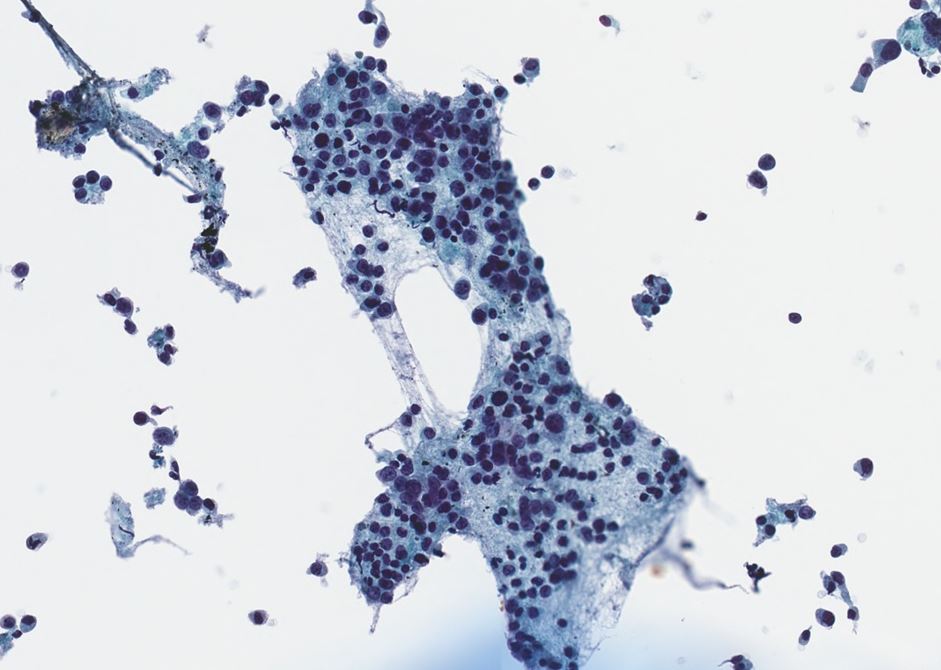 - Small Cell Carcinoma: Small cell carcinoma is a type of neuroendocrine tumor that accounts for 20-25% of all primary lung cancers. This type of cancer is commonly seen in male smokers and usually has a poor prognosis.1 Small cell carcinoma specimens are moderately cellular with cells arranged in a dispersed, single cell population. Cells from small cell carcinoma have scant to no cytoplasm and exhibit a coarse chromatin pattern. Moderate pleomorphism can also be observed. Nuclear molding, crush artifact, and inconspicuous nucleoli are characteristic features of small cell carcinoma. In the background, marked necrosis, abundant mitotic figures and apoptotic bodies can also be observed. Paranuclear blue blobs may be seen amongst the small cells.1,14 IHC markers that can be used to stain for small cell carcinoma are Chromogranin, Synaptophysin, INSM1, AE1/3, and CD56.1 The smaller 3-dimensional clusters of cells from the patient of the current case study look as if they are molded together, which might suggest small cell carcinoma, but it is not true molding. The cells also have eccentrically placed nuclei with small amounts of cytoplasm, which is not characteristic of small cell carcinoma.