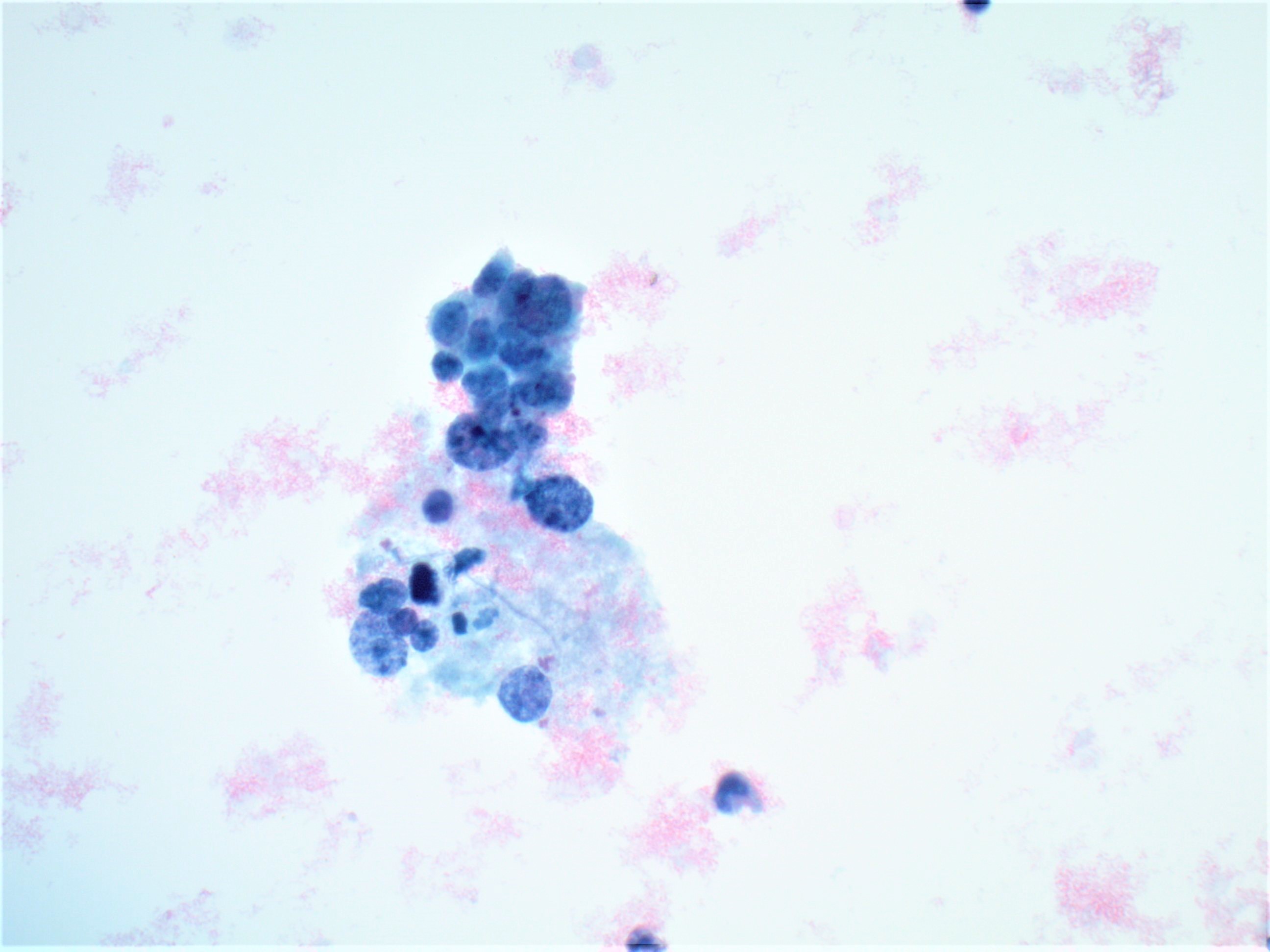 Endometrial cells16 – Endometrial cells are a common benign finding in cervical cytology of women under 45 years of age. They are typically shed during menses and during the proliferative phase of the menstrual cycle. The small columnar cells form tight, overlapping, 3D clusters and the nuclei around the edges of the clusters may be cup-shaped. The nuclei are dark and slightly smaller than the nuclei of a normal intermediate squamous cell. Nucleoli are inconspicuous, mitoses are absent, and karyorrhexis is often seen. The cytoplasm of endometrial cells is scant and occasionally vacuolated and cell borders are ill defined. In atypical endometrials, the cell groupings will be smaller, containing around 5-10 cells. These cells will have mild hyperchromasia and occasional small nucleoli. Differentiation between atypical endometrials and benign is based on increased nuclear size in the atypical cells. The background may be bloody or inflammatory.