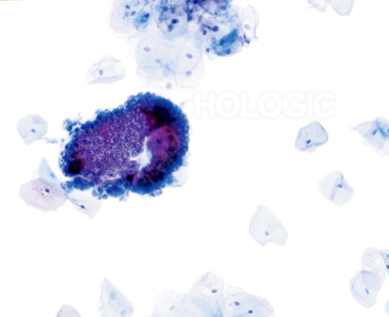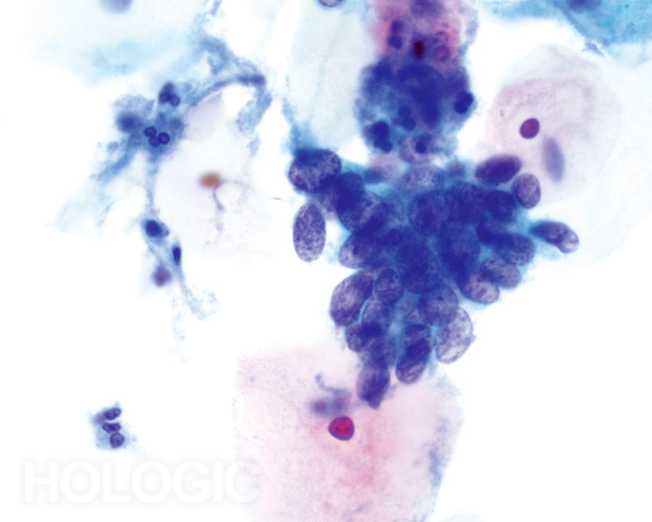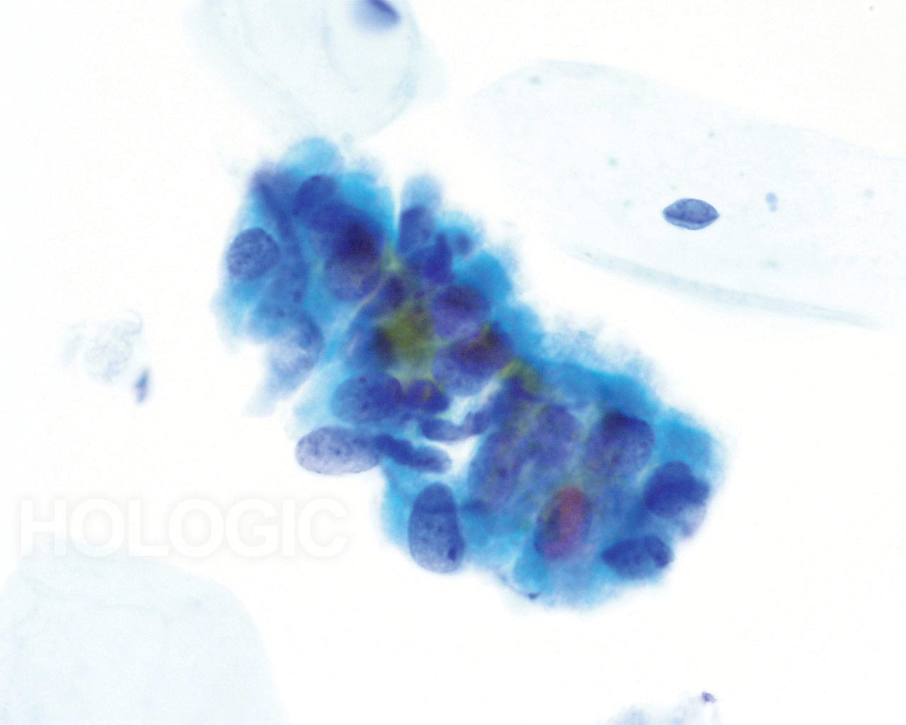 Endocervical cells presenting in a pseudo-rosette formation and exhibiting “feathering” and nuclear elongation due to crowding. Biopsy – AIS – 60x
