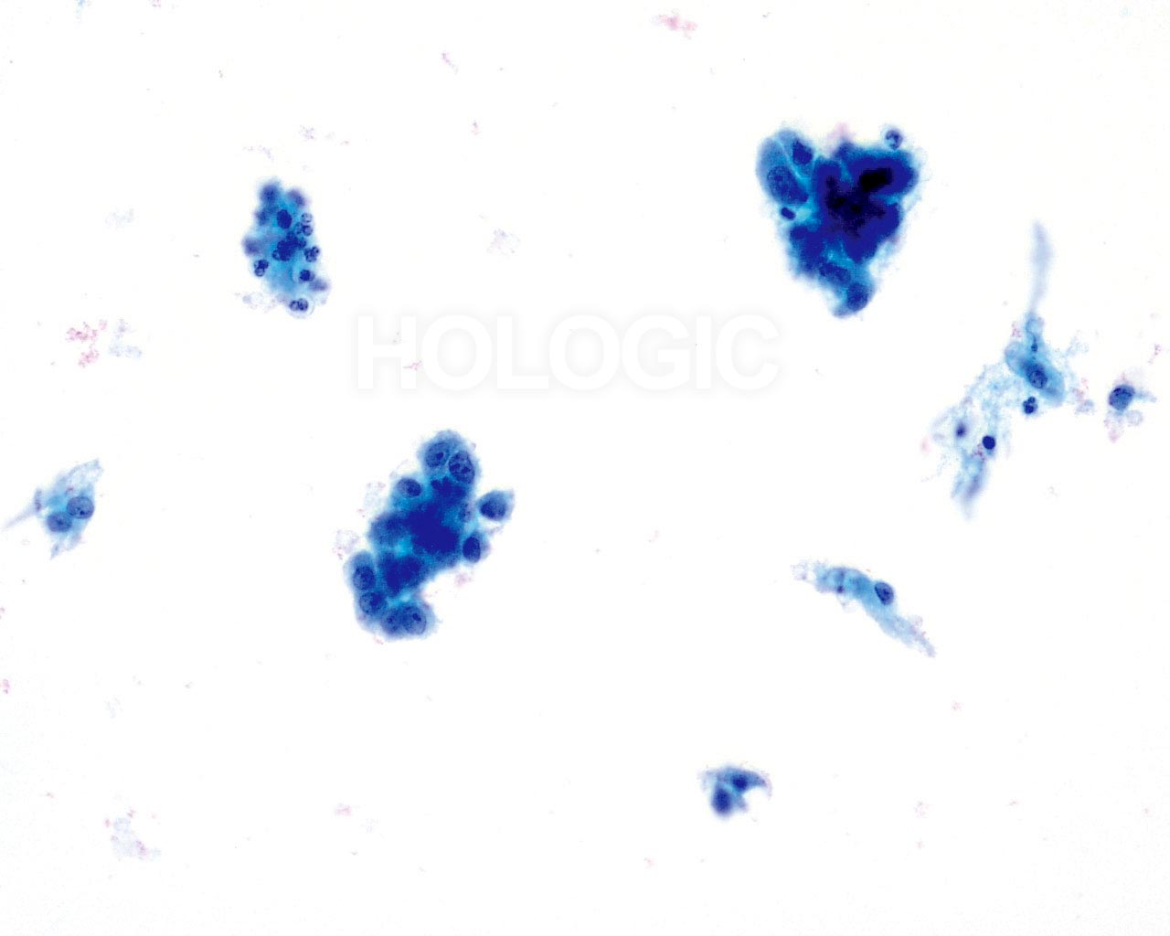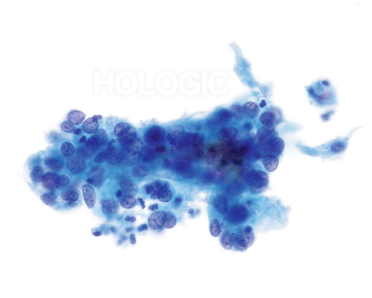 Variably sized, crowded, hyperchromatic groups of cells are seen on screening power which warrant a closer inspection. 20x