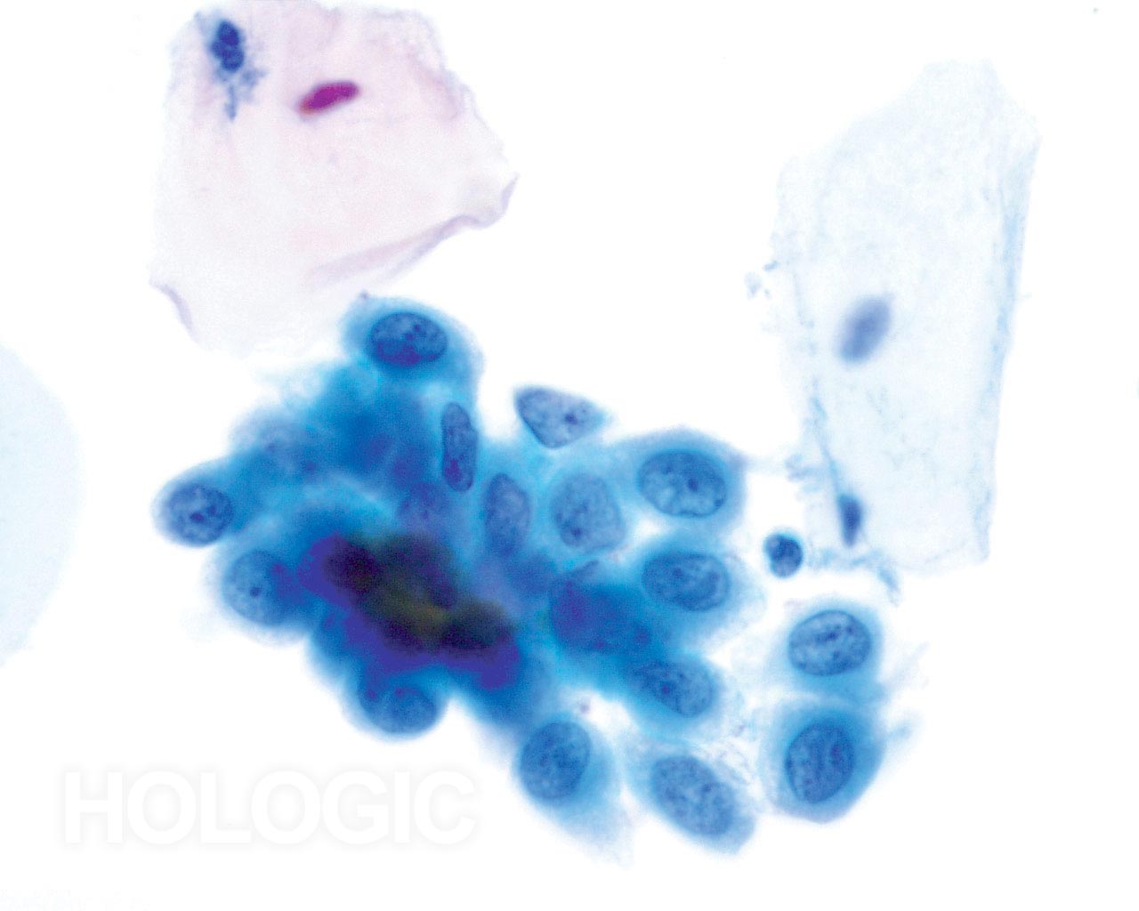 High N/C ratios are evident in nuclei that take up at least 2/3 of the cytoplasm. Chromatin is coarse but evenly distributed and micronucleoli are present. Biopsy – AIS – 60x