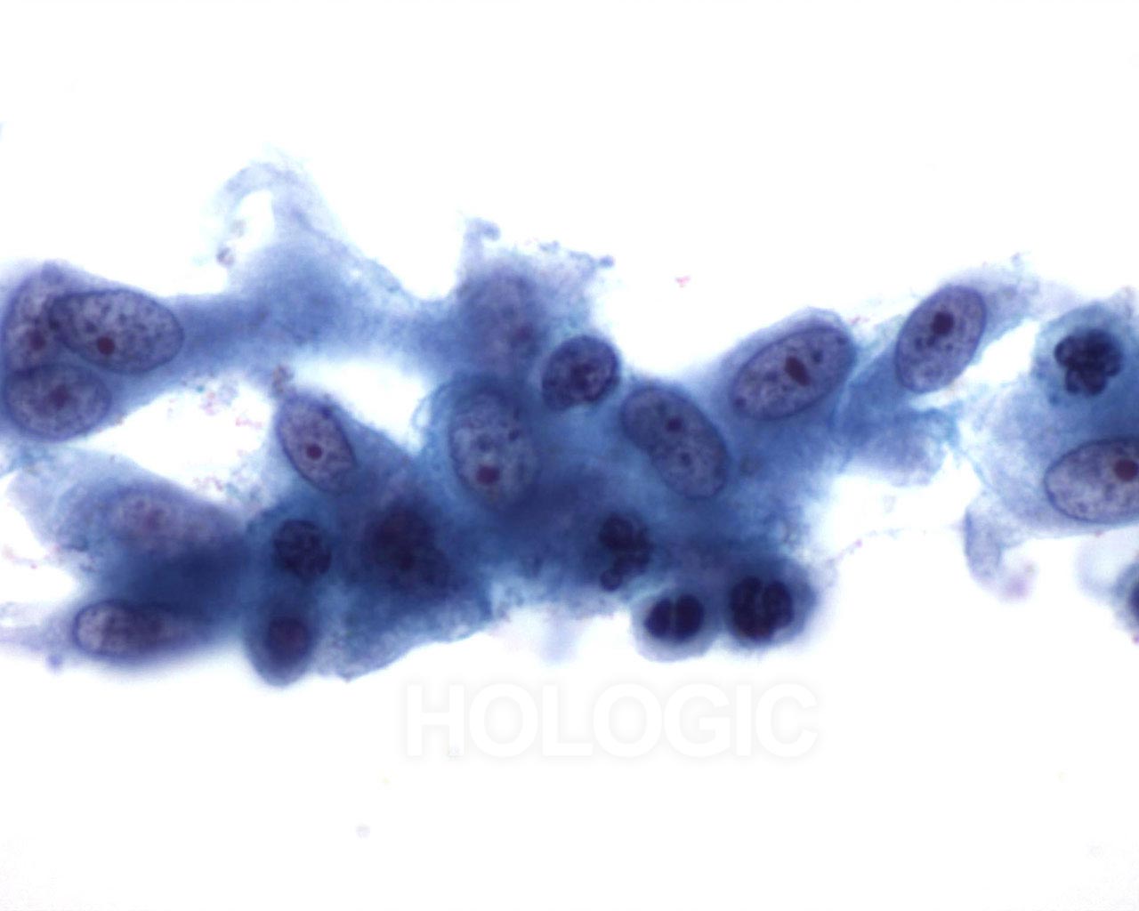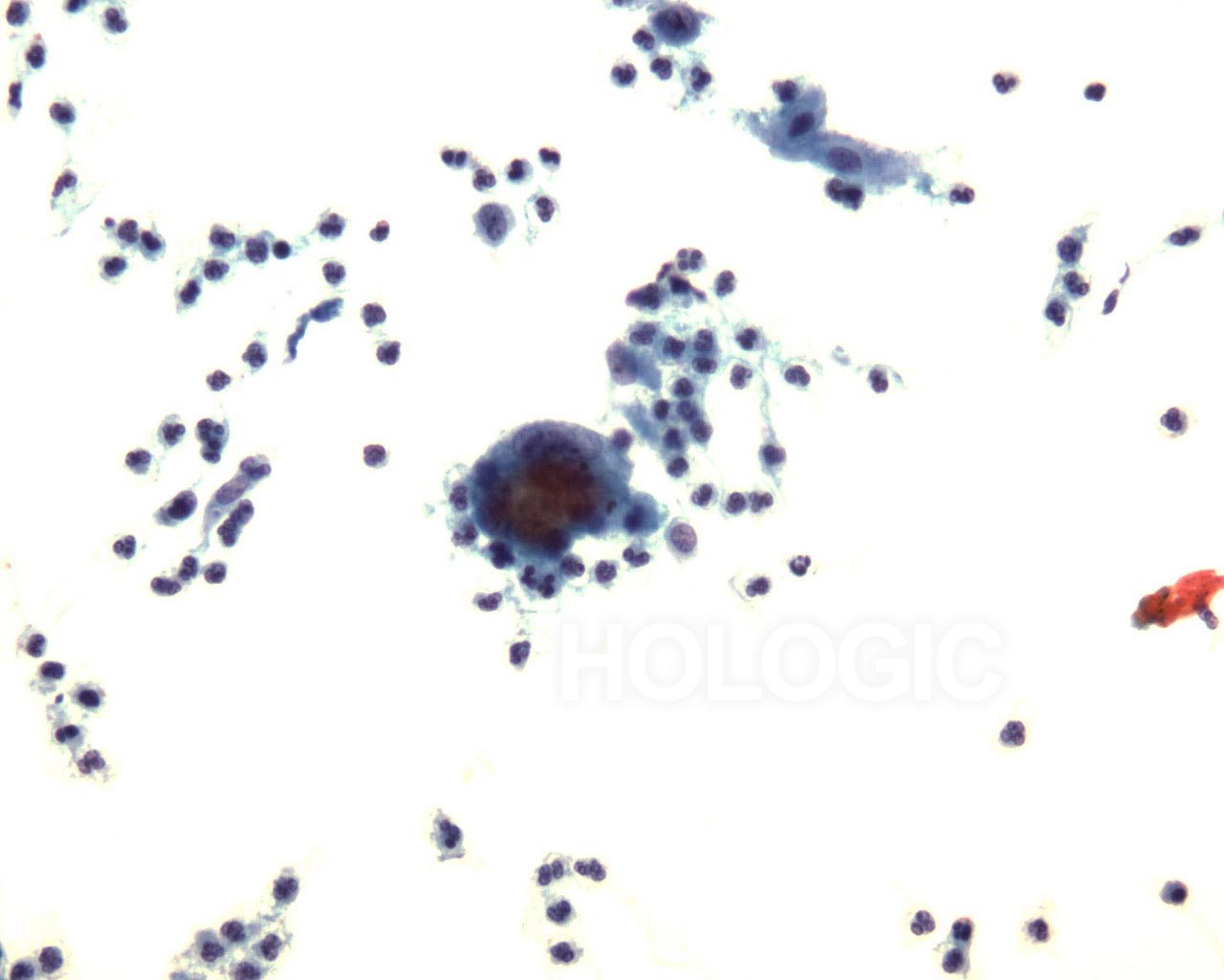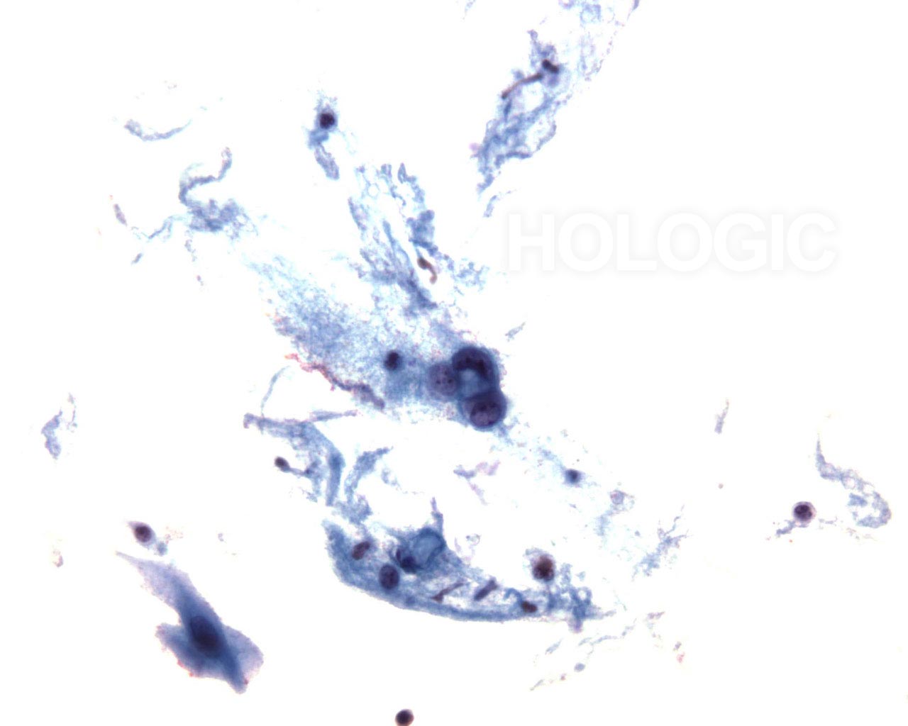 Cytomegaly is the most well known radiation related change. Cytomegalic cells have enlarged and/or multiple nuclei and abundant cytoplasm while maintaining a fairly normal N/C ratio. The nuclei can be pale and the chromatin can be finely granular to “smudgy” with possible micro- and macronucleoli and vacuoles. The cytoplasm may exhibit bichromasia and vacuoles with or without engulfed polys. Bizarre cell shapes may also be seen. The background of these specimens will contain degenerated blood that appears “stringy”, cellular debris, polys and histiocytes. Reparative changes can be seen frequently and occur in single-layered, cohesive, streaming sheets with pale nuclei and prominent nucleoli. Radiated fibroblasts are present and have delicate cytoplasm with vacuoles and cytoplasmic projections. The nuclei are pale, finely granular with possible nucleoli. Degenerated tumor cells may be seen in specimens initially following radiation.