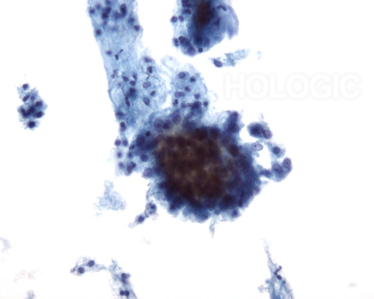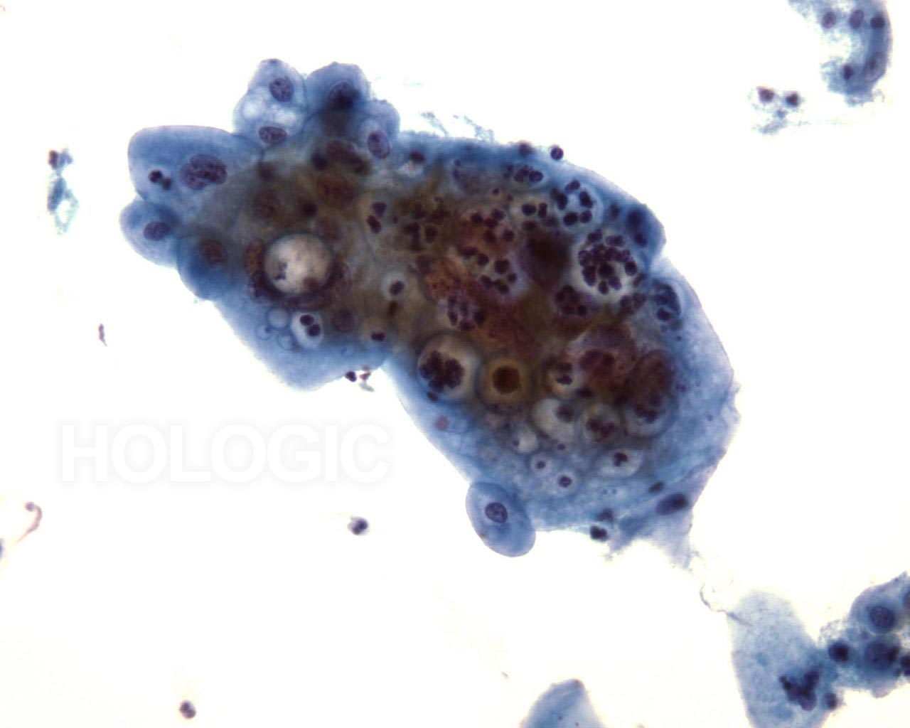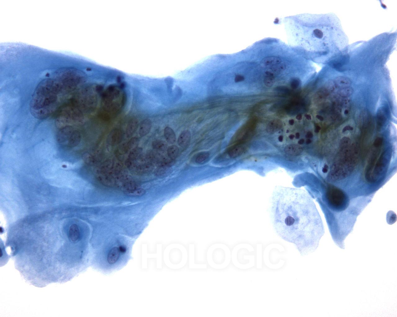 Cytomegaly is the most well known radiation related change. Cytomegalic cells have enlarged and/or multiple nuclei and abundant cytoplasm while maintaining a fairly normal N/C ratio. The nuclei can be pale and the chromatin can be finely granular to “smudgy” with possible micro- and macronucleoli and vacuoles. The cytoplasm may exhibit bichromasia and vacuoles with or without engulfed polys. Bizarre cell shapes may also be seen. The background of these specimens will contain degenerated blood that appears “stringy”, cellular debris, polys and histiocytes. Reparative changes can be seen frequently and occur in single-layered, cohesive, streaming sheets with pale nuclei and prominent nucleoli. Radiated fibroblasts are present and have delicate cytoplasm with vacuoles and cytoplasmic projections. The nuclei are pale, finely granular with possible nucleoli. Degenerated tumor cells may be seen in specimens initially following radiation.