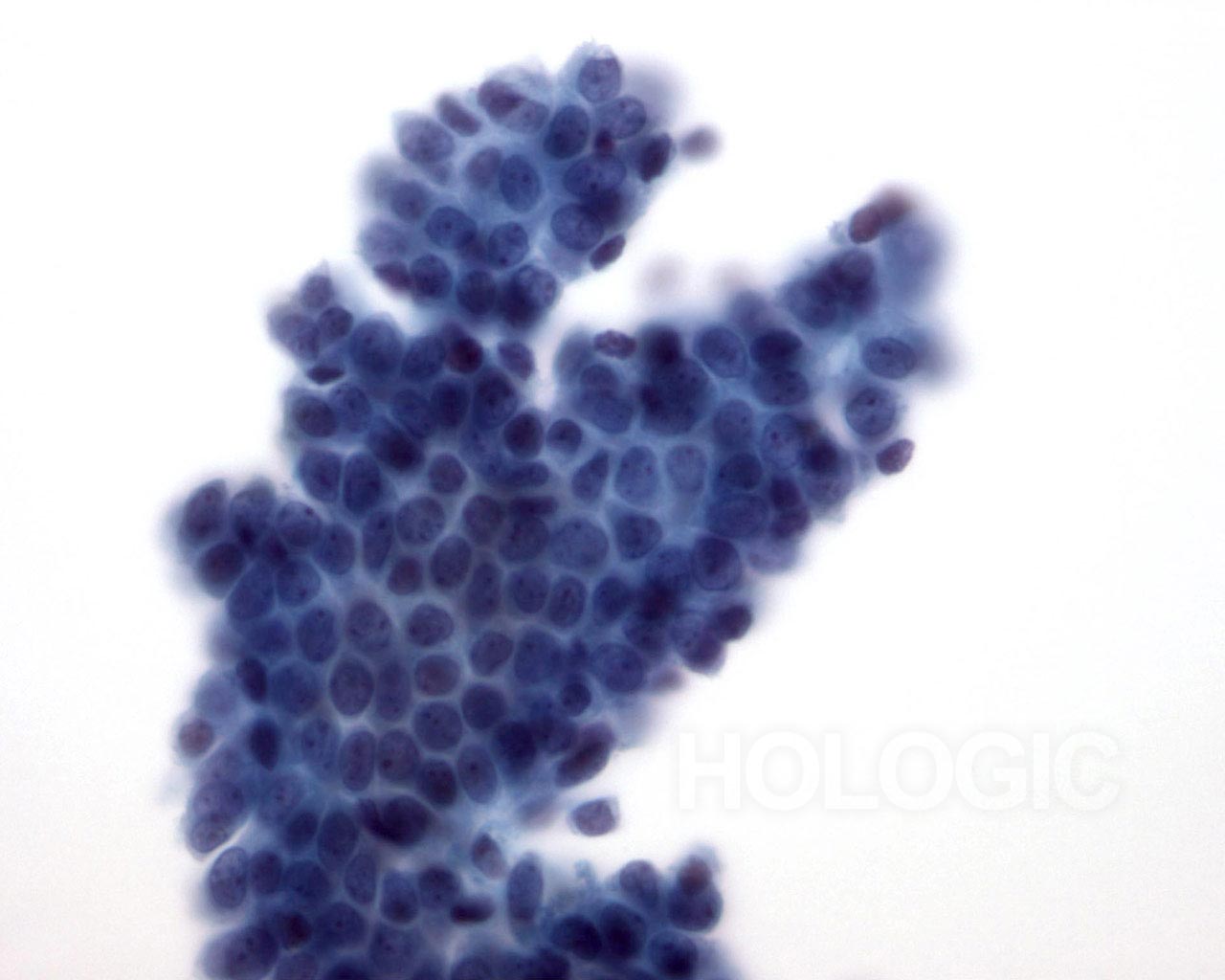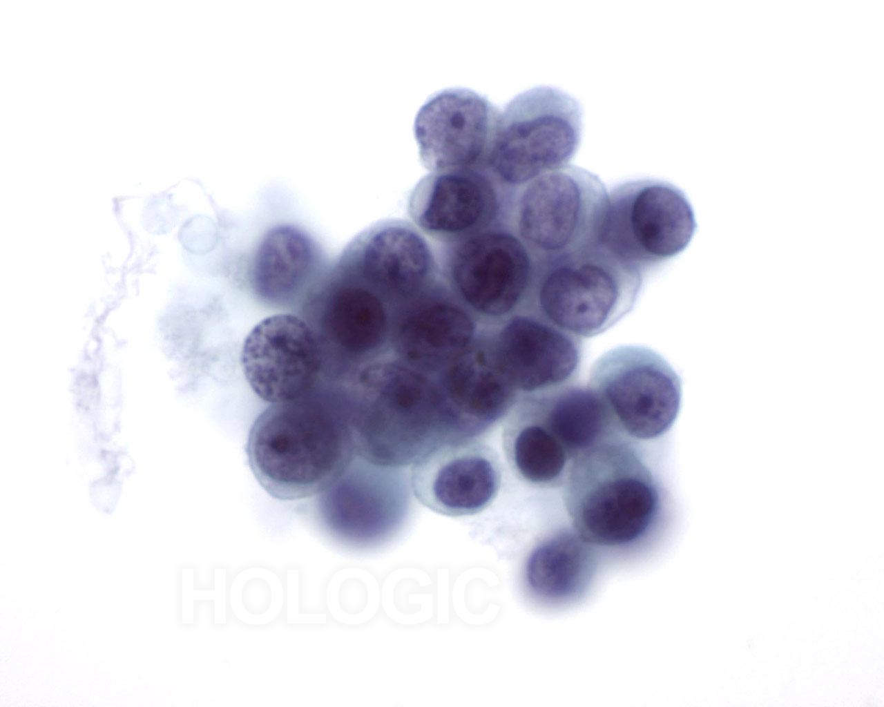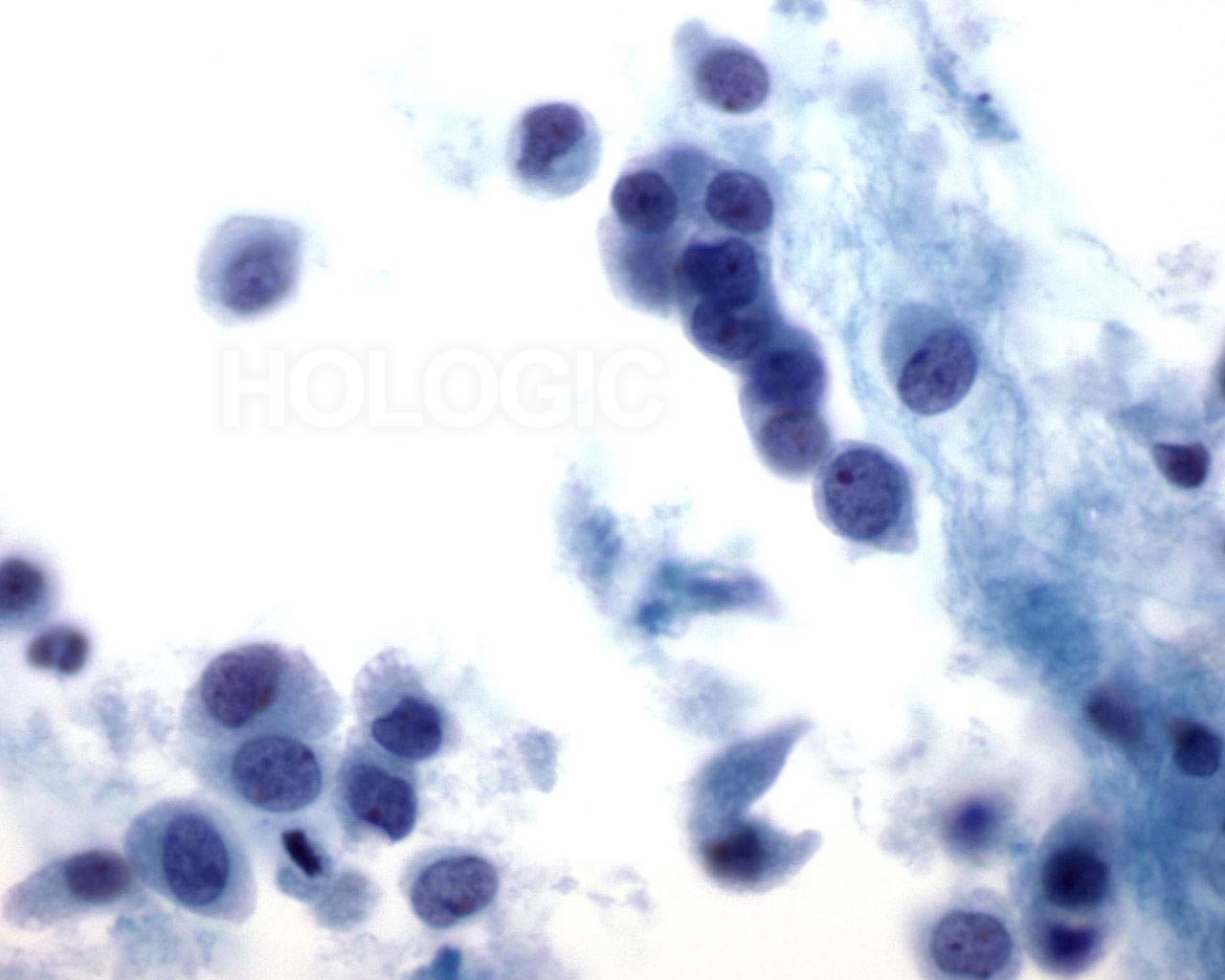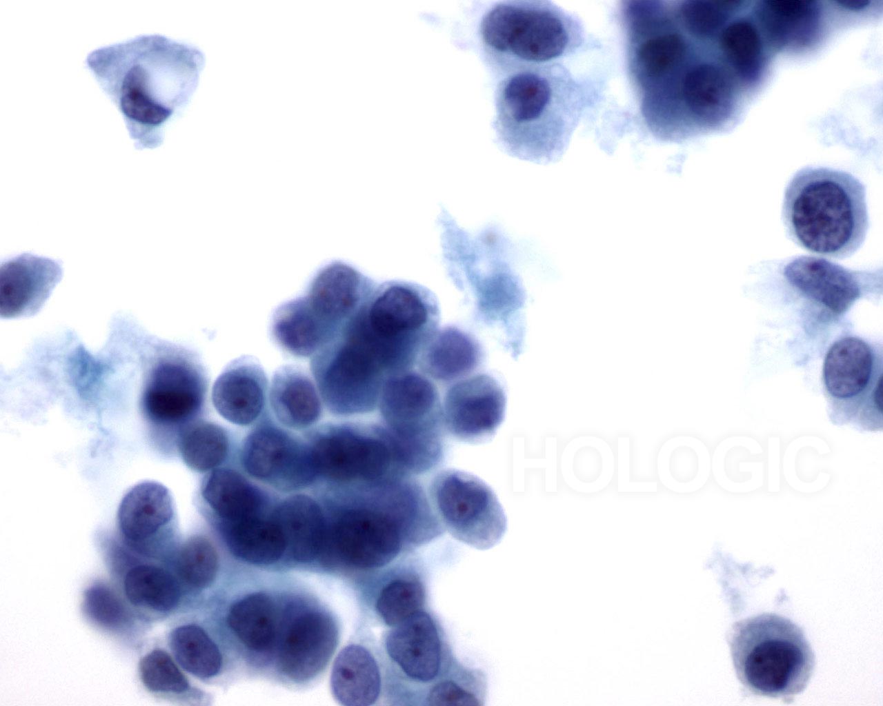 On high magnification the cells are seen to be lymphoid with a characteristic chromatin pattern. Immunocytochemical stains such as Leukocyte Common Antigen (LCA) performed on an unstained ThinPrep slide would confirm the diagnosis.