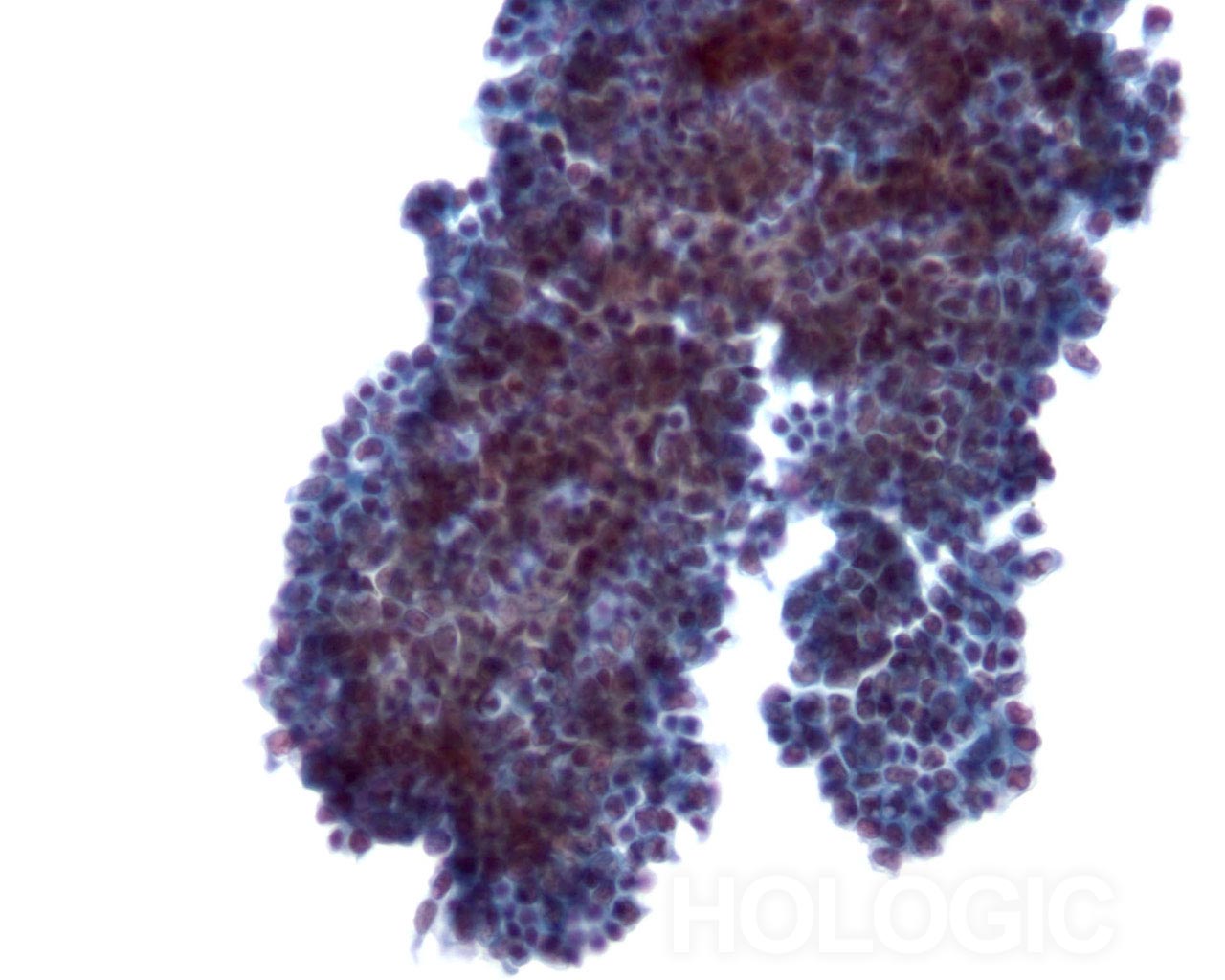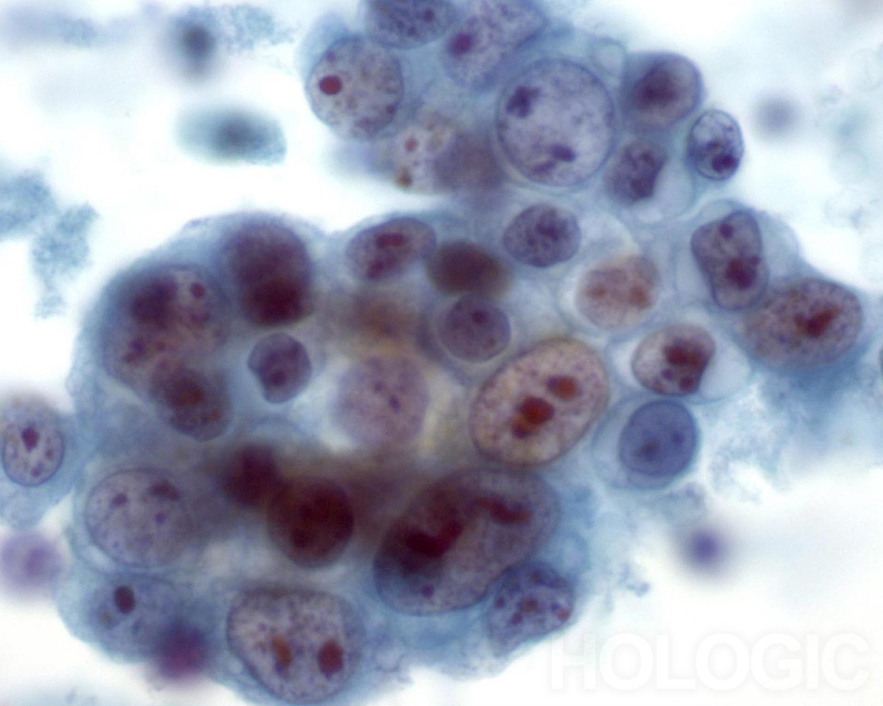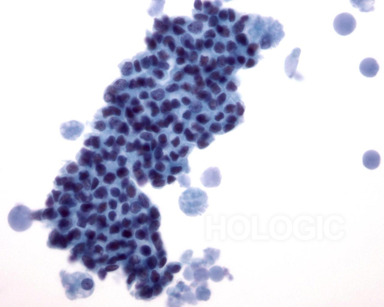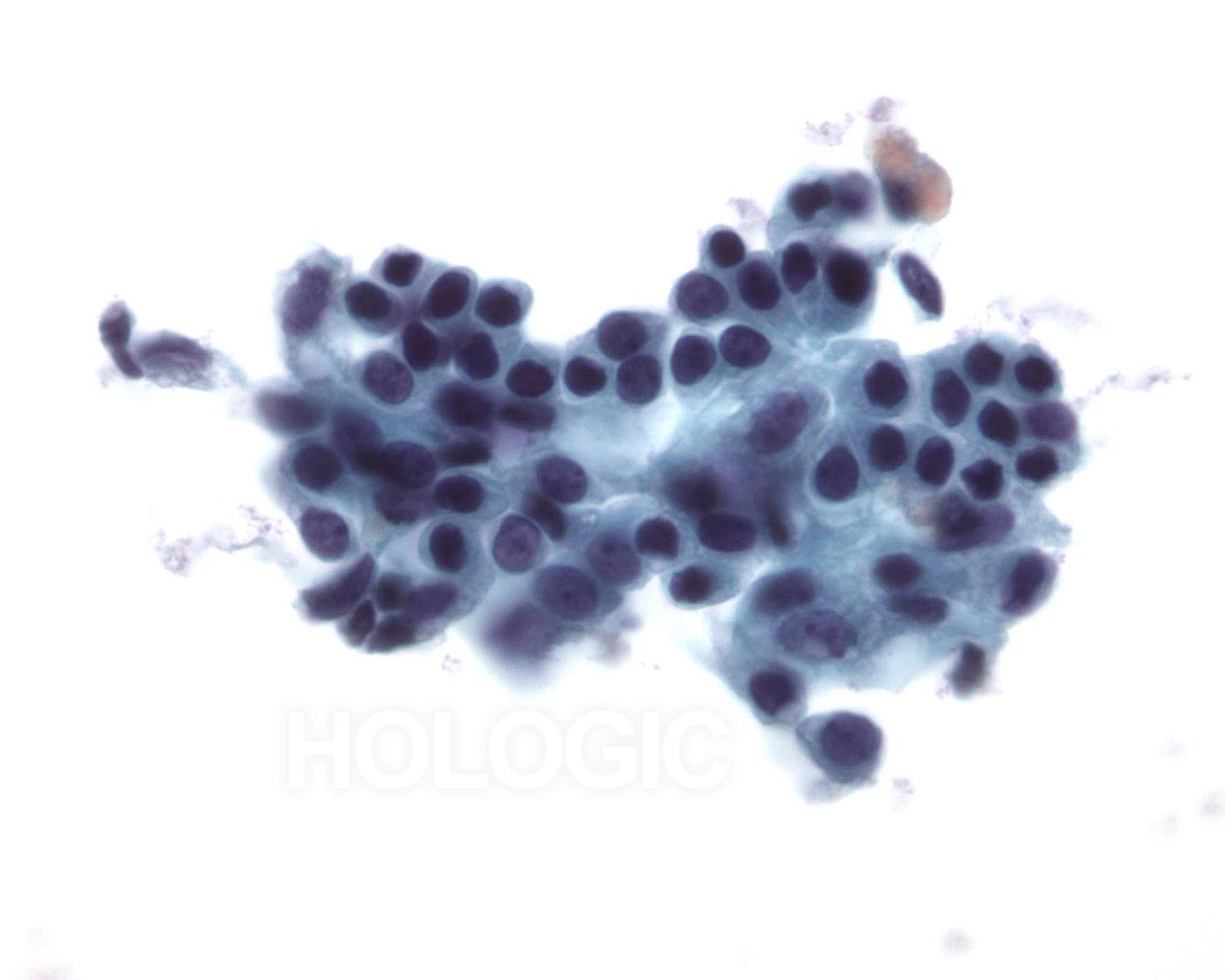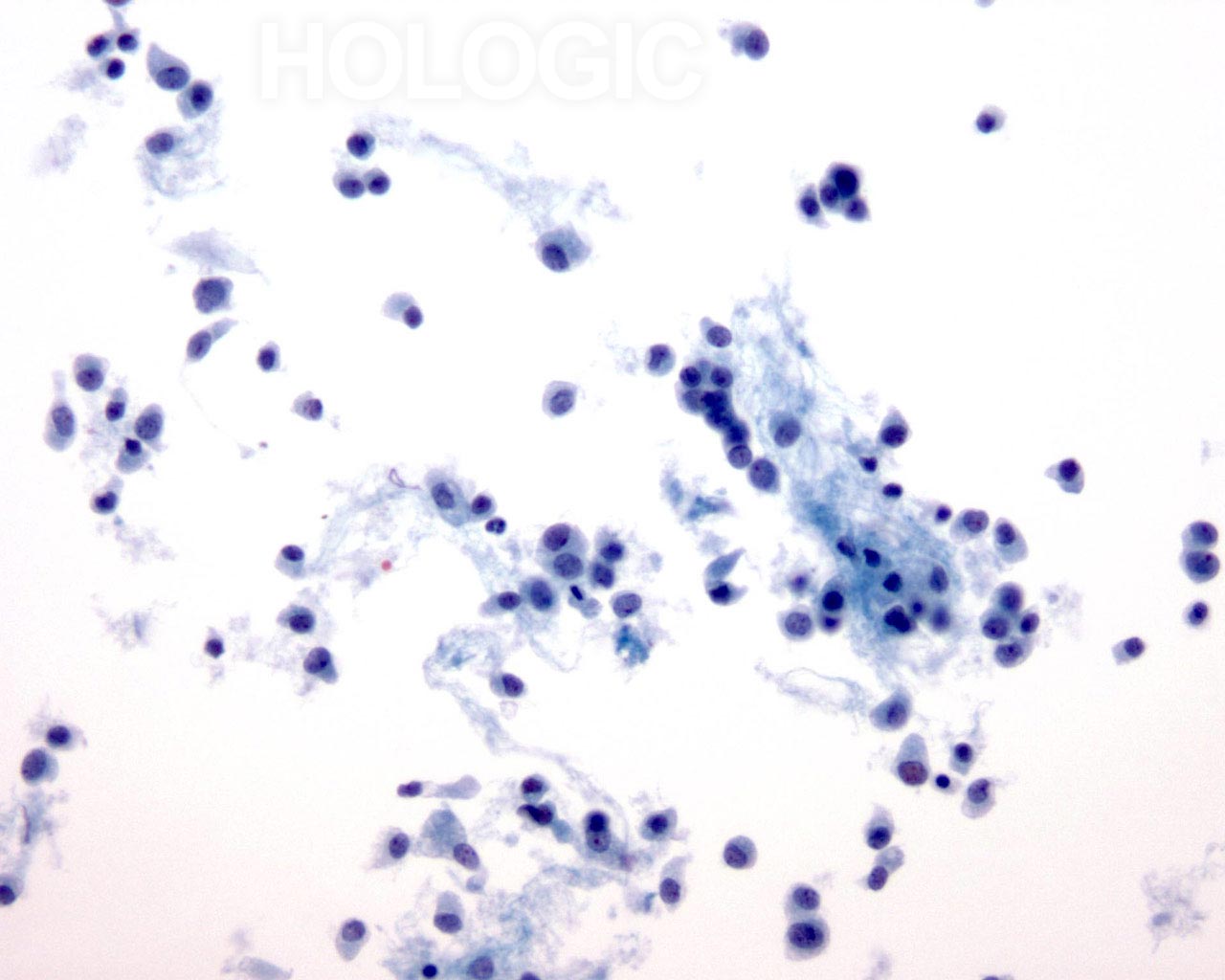 On high magnification the cells are seen to be lymphoid with a characteristic chromatin pattern. Immunocytochemical stains such as Leukocyte Common Antigen (LCA) performed on an unstained ThinPrep slide would confirm the diagnosis.