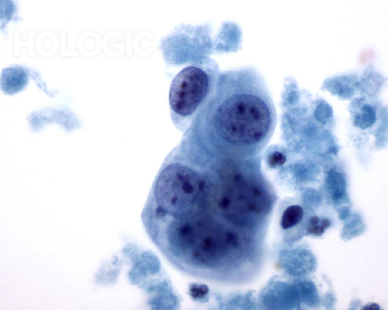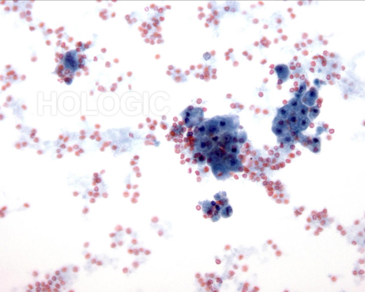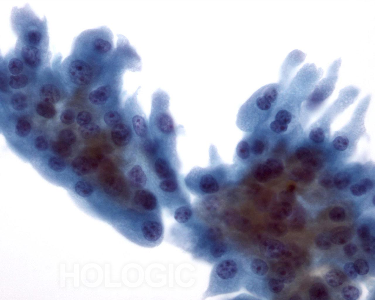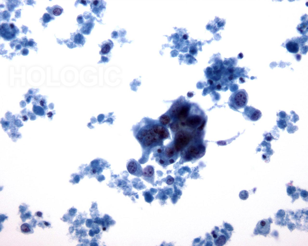 On high magnification the cells are seen to be lymphoid with a characteristic chromatin pattern. Immunocytochemical stains such as Leukocyte Common Antigen (LCA) performed on an unstained ThinPrep slide would confirm the diagnosis.