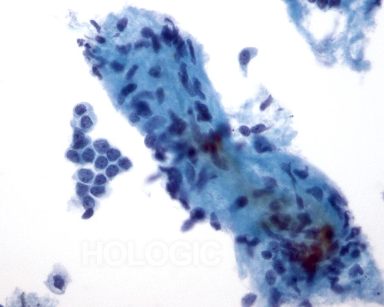 A large stromal fragment is present, containing a few small spindle-shaped nuclei. Stromal fragments may be seen in aspirates of benign breast tissue as well as in fibroepithelial lesions such as fibroadenoma. Stromal fragments from phyllodes tumors are much more cellular. Note the small group of benign ductal cells also present.