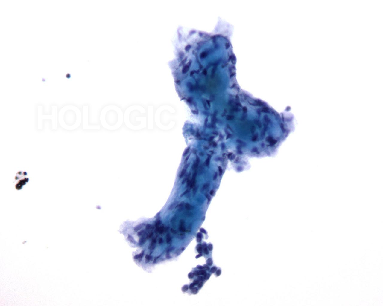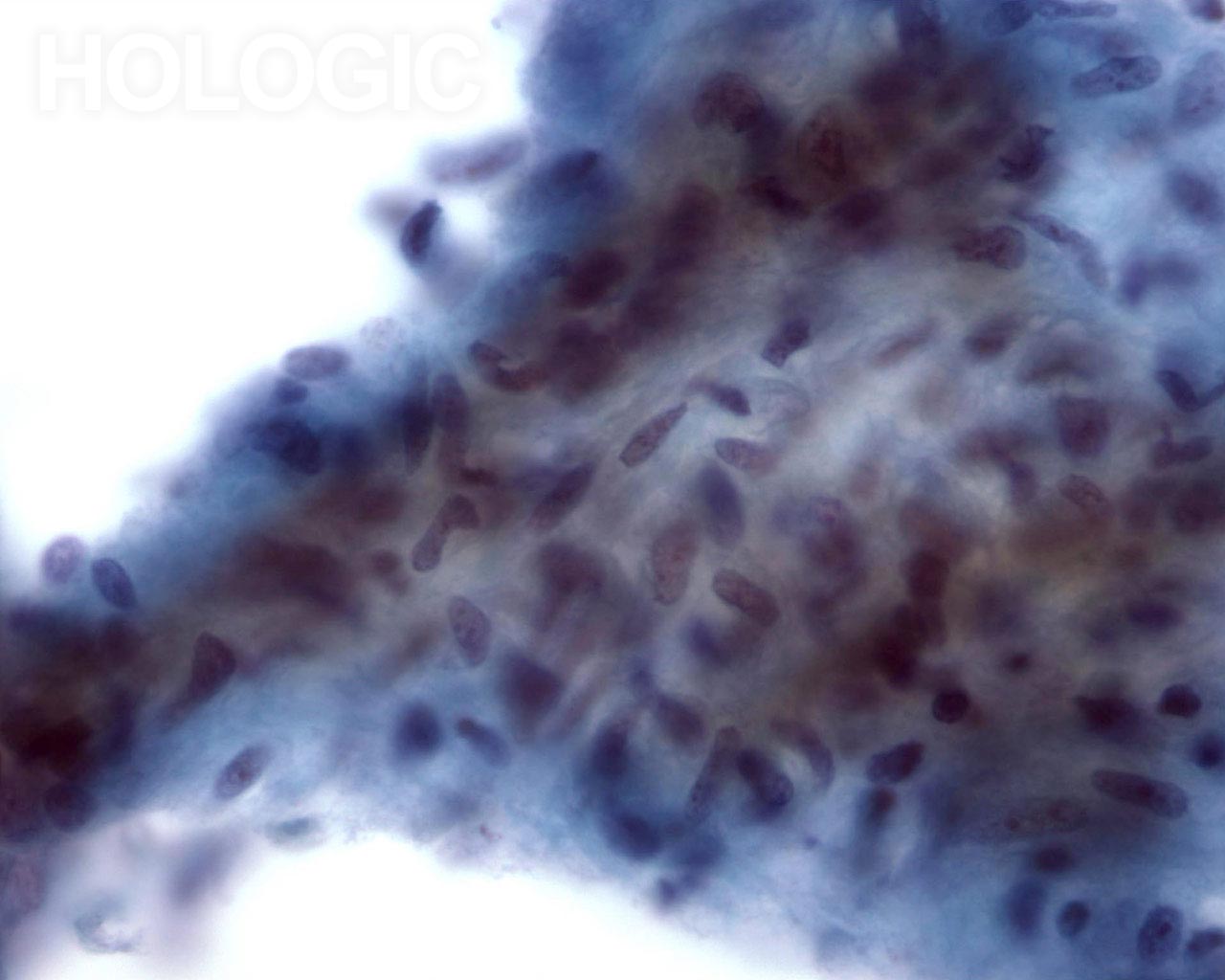 A large branching sheet of cohesive, uniform benign ductal cells is seen overlying a stromal fragment. Note the small, somewhat spindled stromal cell nuclei within the stromal fragment.