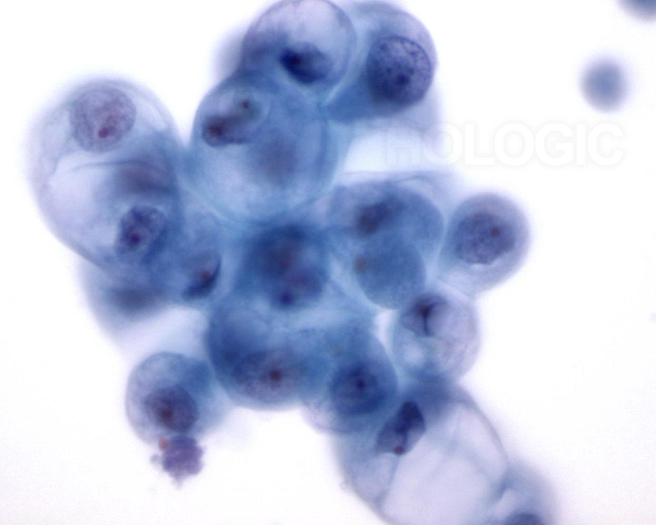 This cluster of benign ductal cells shows mild atypia in the form of visible nucleoli and slight nuclear enlargement. Such minimal changes are often noted in breast cyst fluids. 60x