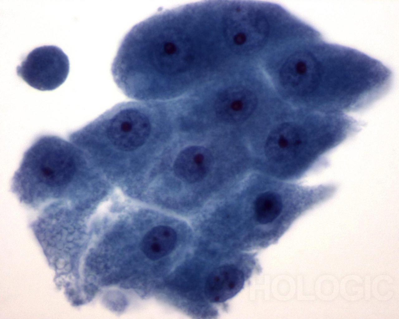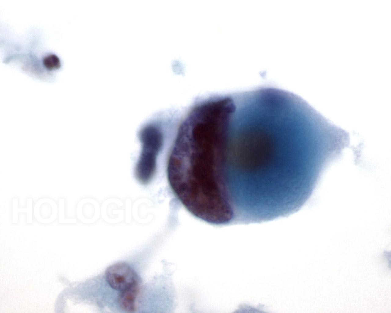This field shows a small group of benign epithelial cells, one vacuolated, with cyst debris in the background. 40x