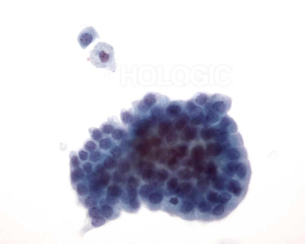 In this field the edges of the ductal group are not smooth as the previous two images above, possibly due to the liquid-based processing. Within the group of ductal cells, and at the upper edge, a few myoepithelial cells are noted. With ThinPrep processing myoepithelial cells tend to be seen adjacent to the ductal groups rather than scattered in the background as seen in conventional smears.