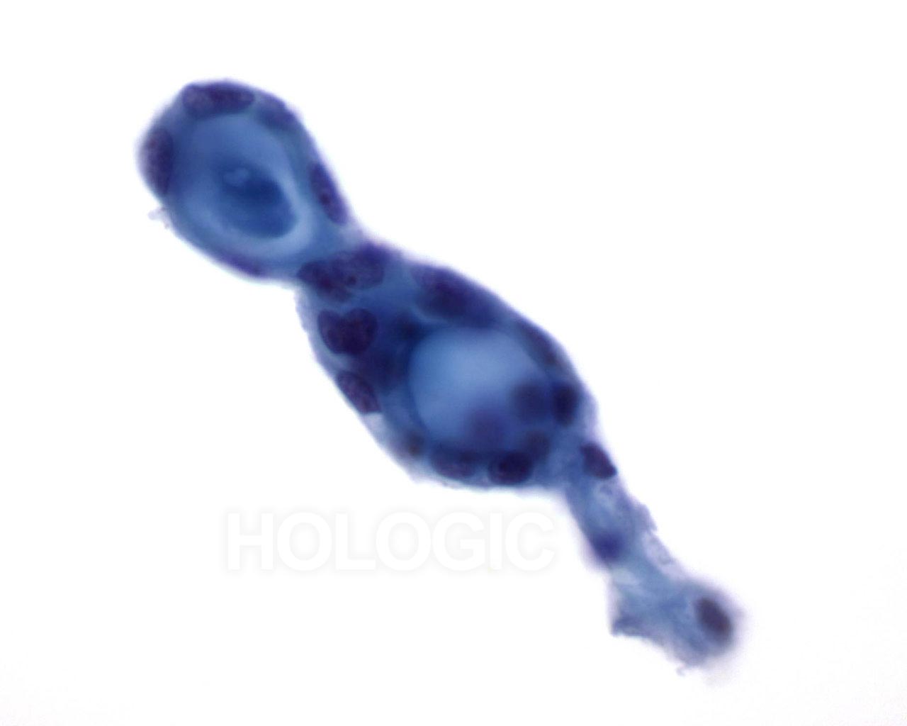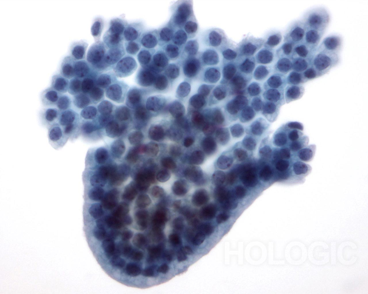 This group of benign ductal cells has a rounded, palisaded edge, giving the appearance of a papillary structure, although no fibrovascular core is seen.