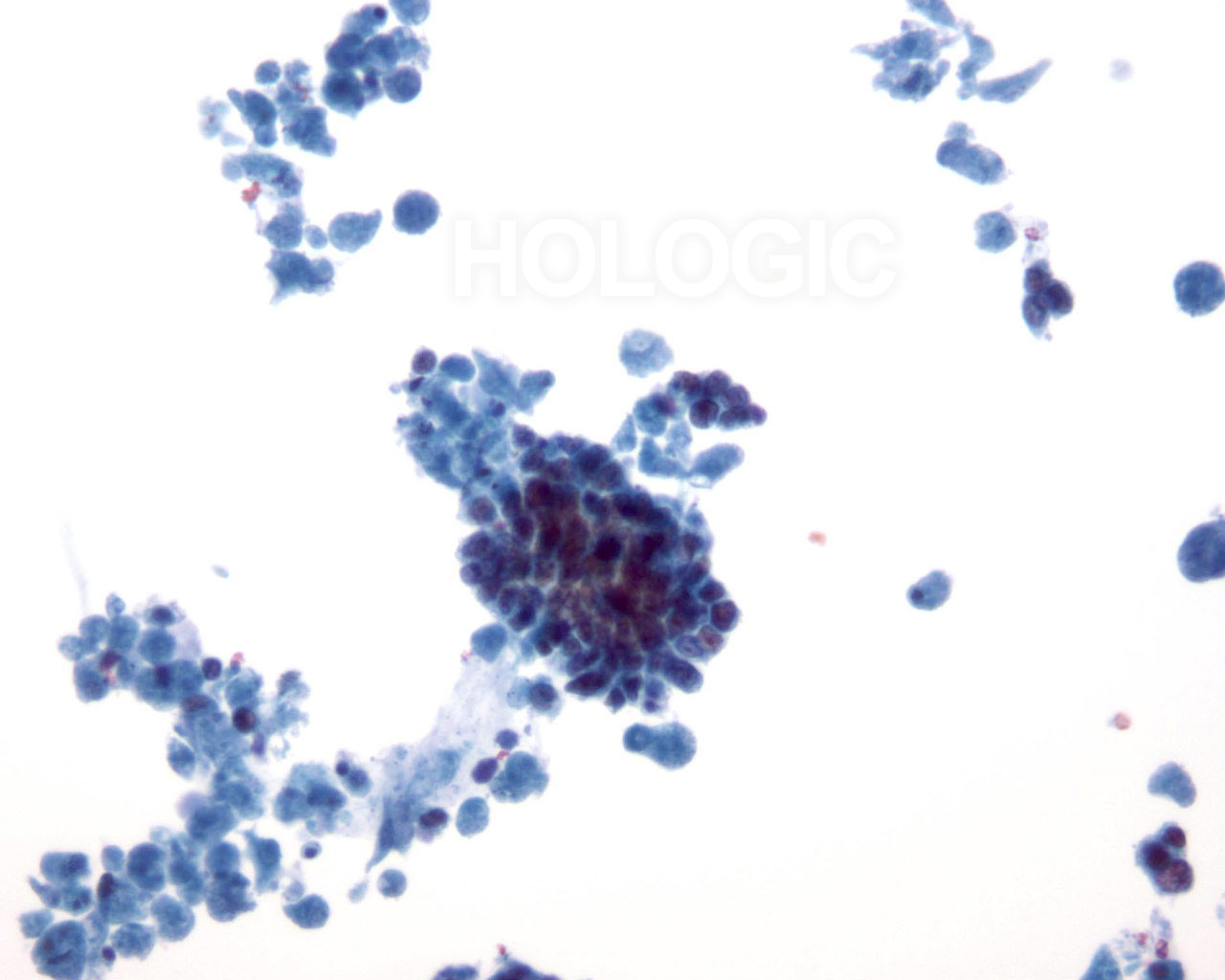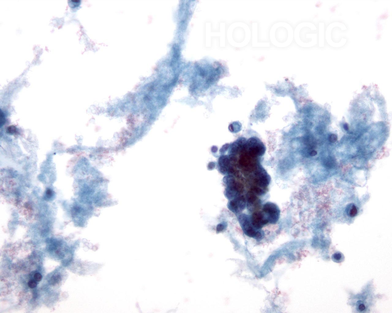 Breast FNA, Colloid (mucinous) carcinoma. Clusters of small cells and some single cells are shown in a background of mucin. It is preferable to report such cases as ductal carcinoma showing mucinous differentiation rather than colloid or mucinous carcinoma as the diagnosis is dependent upon the whole tumor showing mucin production. 40x