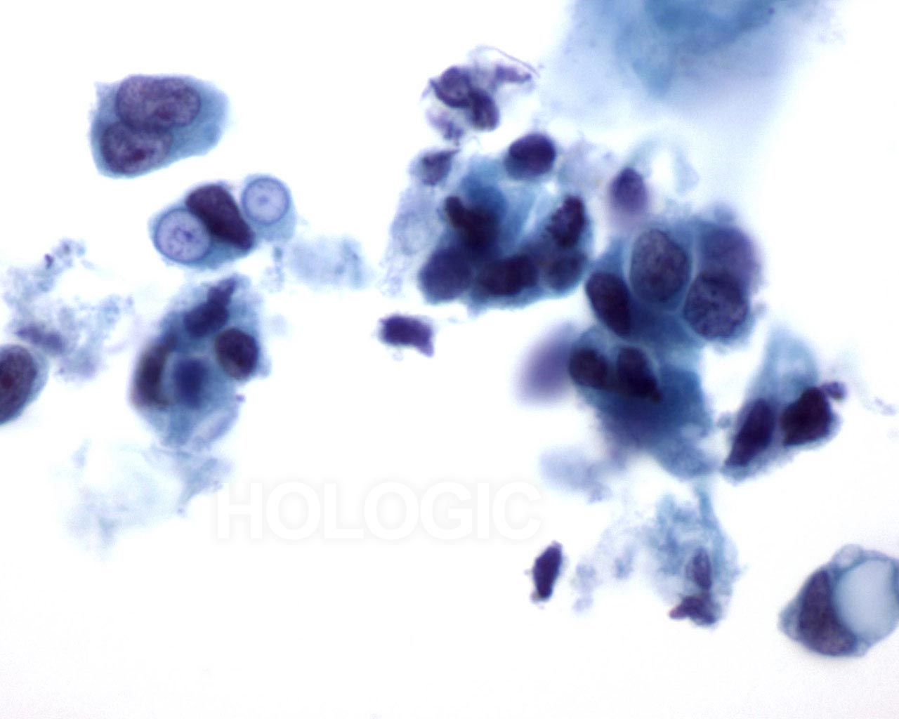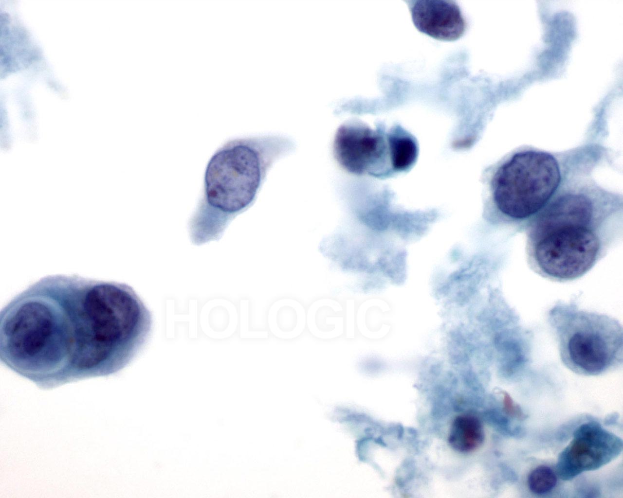 This is from the same case as Figure 43 above and shows a binucleated cell with hyperchromatic nuclei and clumped and cleared chromatin.