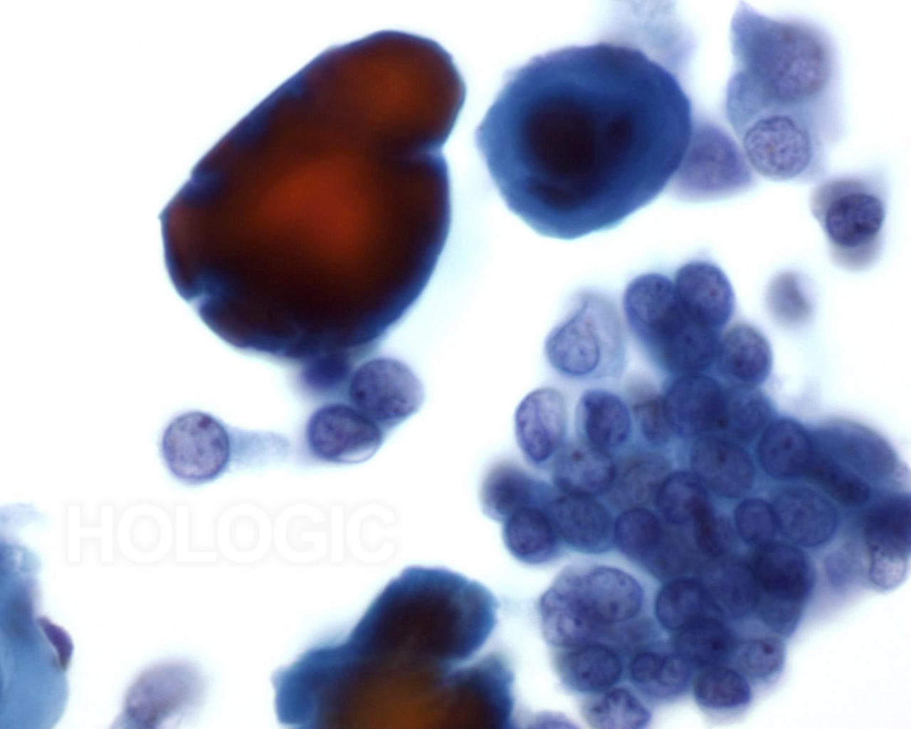 Breast FNA, Adenoid cystic carcinoma. This field illustrates a collection of hyaline globules with overlying small tumor cells. The differential diagnosis is collagenous spherulosis, a benign lesion in which the hyaline globules are accompanied by benign or hyperplastic ductal cells. 60x